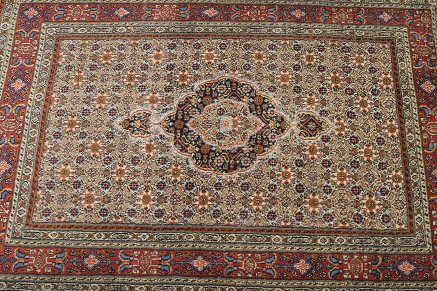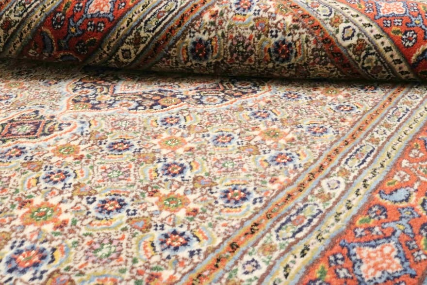 Das Medaillon-Muster des Moud Teppichs ist eines der charakteristischsten Designs in der Teppichkunst. Es besteht aus einem zentralen Medaillon, das von einer Vielzahl floraler oder geometrischer Motive umgeben ist. Diese symmetrische Anordnung schafft eine harmonische und ausgewogene Ästhetik, die sowohl modern als auch klassisch wirkt. Medaillon-Muster sind oftmals in den prächtigsten Räumen zu finden, wo sie als Blickfang dienen.