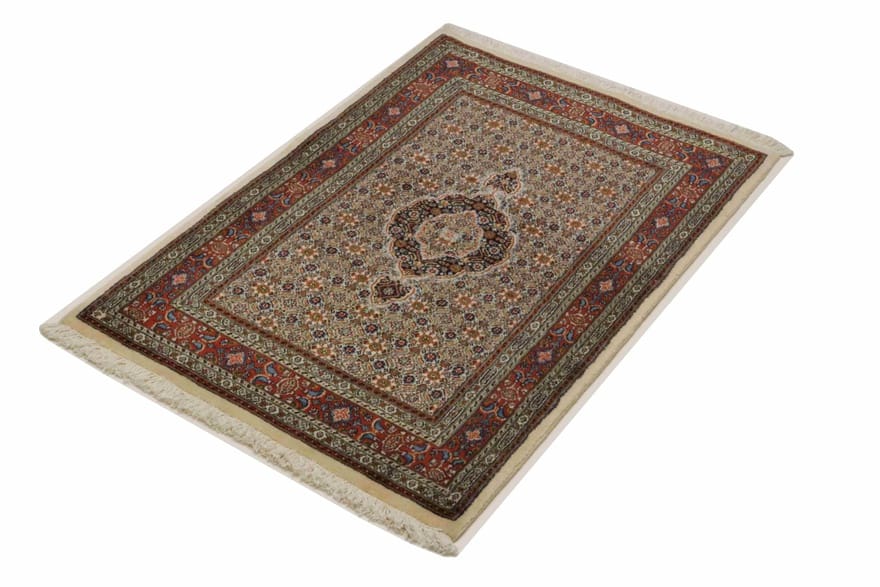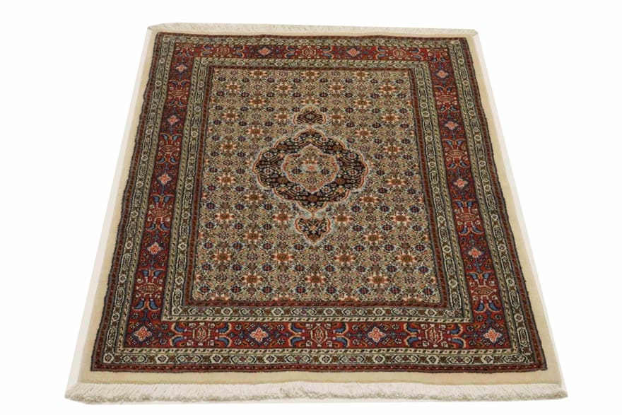 Moud-Teppich | Knotendichte: 200.000 – 250.000 Knoten/m² | Material: Wolle/Seide | Größe: 148×98 cm | Zustand: Neuzeitlich (0-20 Jahre) | Ursprung: Iran / Persien | Muster: Medaillon- und Herati-Muster | Farbe: Weiß/Beige | Verarbeitung: Handgeknüpft | Dicke: ca. 10 mm | Gewicht: ca. 5 kg
