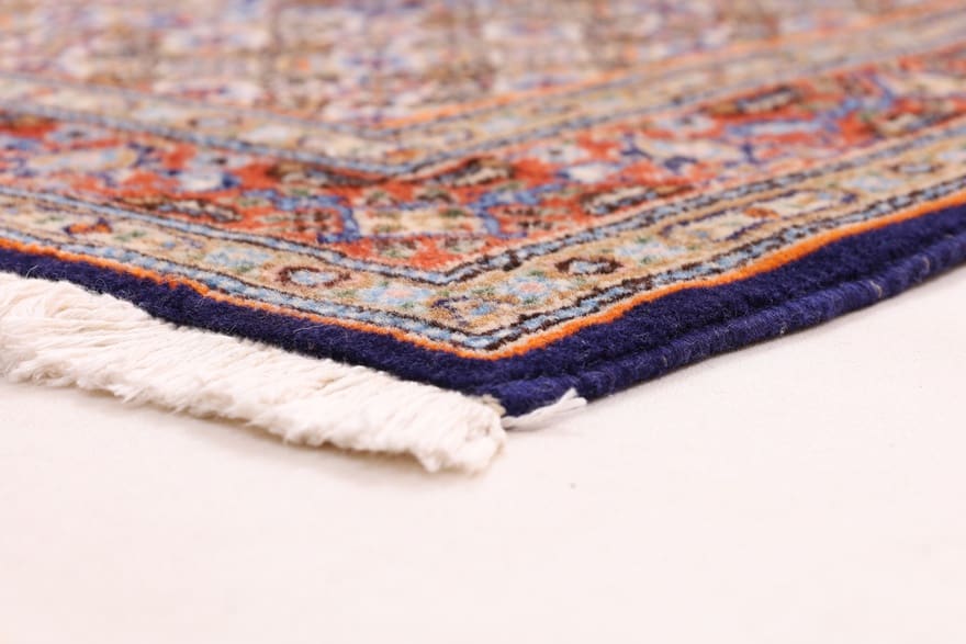 Der Moud-Teppich ist ein exquisiter Vertreter der persischen Teppichkunst, die typischerweise aus dem Iran stammt. Die Region von Moud, die in der Provinz Khorasan liegt, ist bekannt für ihre farbenfrohen, detailreichen Designs und die hohe Qualität ihrer Teppiche. Ihre Entstehung geht auf jahrhundertelange Traditionen zurück, die das Handwerk des Teppichknüpfens in dieser Region geprägt haben. Moud-Teppiche sind oft mit floralen und geometrischen Mustern verziert, die tief verwurzelt sind in der Kultur und Symbolik des Iran. Die Region Khorasan ist berühmt für die Verwendung von lebhaften Farben und komplexen Motiven, was diese Teppiche zu gesuchten Sammlerstücken macht.