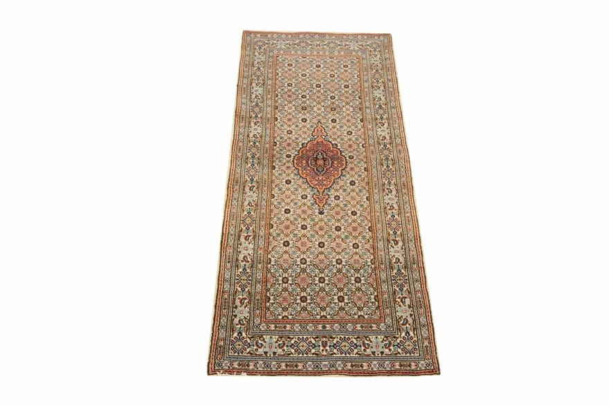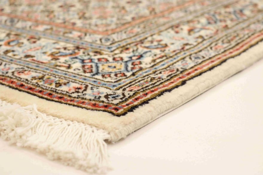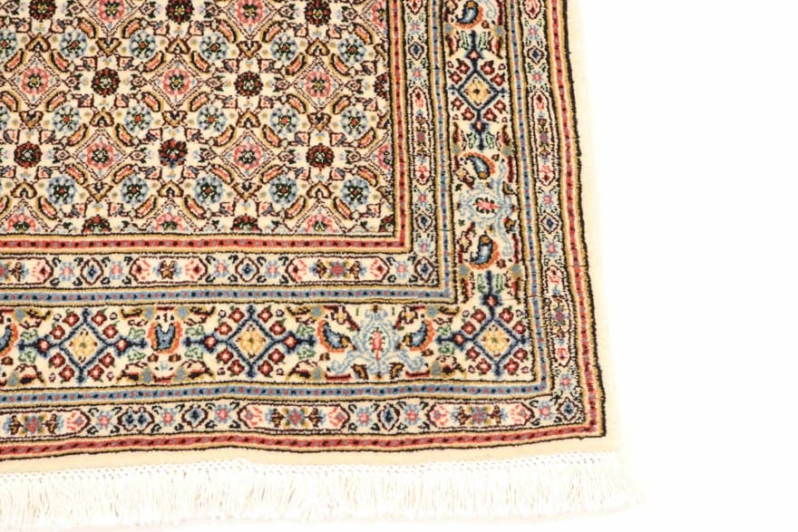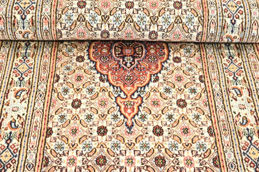 Moud-Teppich | Knotendichte: 440.000 – 490.000 Knoten/m² | Material: Handgesponnene Wolle und Baumwolle | Größe: 202×77 cm | Farbe: Weiß/Beige | Zustand: Neu | Herkunft: Iran / Persien | Verarbeitung: Handgeknüpft | Dicke: ca. 10 mm | Gewicht: ca. 6 kg