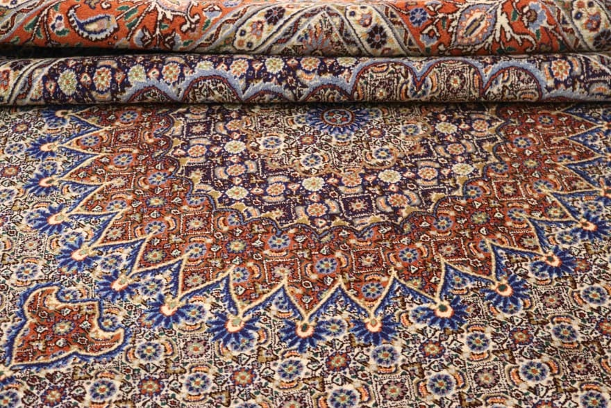 Der Teppich stammt aus der Region Moud im Iran, die für ihre reiche Teppichknüpftradition bekannt ist. Die Provinz Kerman und insbesondere die Stadt Moud haben eine lange Geschichte in der Kunst des Teppichknüpfens, die bis ins 16. Jahrhundert zurückreicht. Die Teppichknüpferei in dieser Region ist geprägt von traditionellem Handwerk und der Verwendung einzigartiger Designs, die oft von der Natur und der Umgebung inspiriert sind. Moud Teppiche sind berühmt für ihre harmonischen Farben und komplexen Muster, die seit Jahrhunderten geschätzt werden.