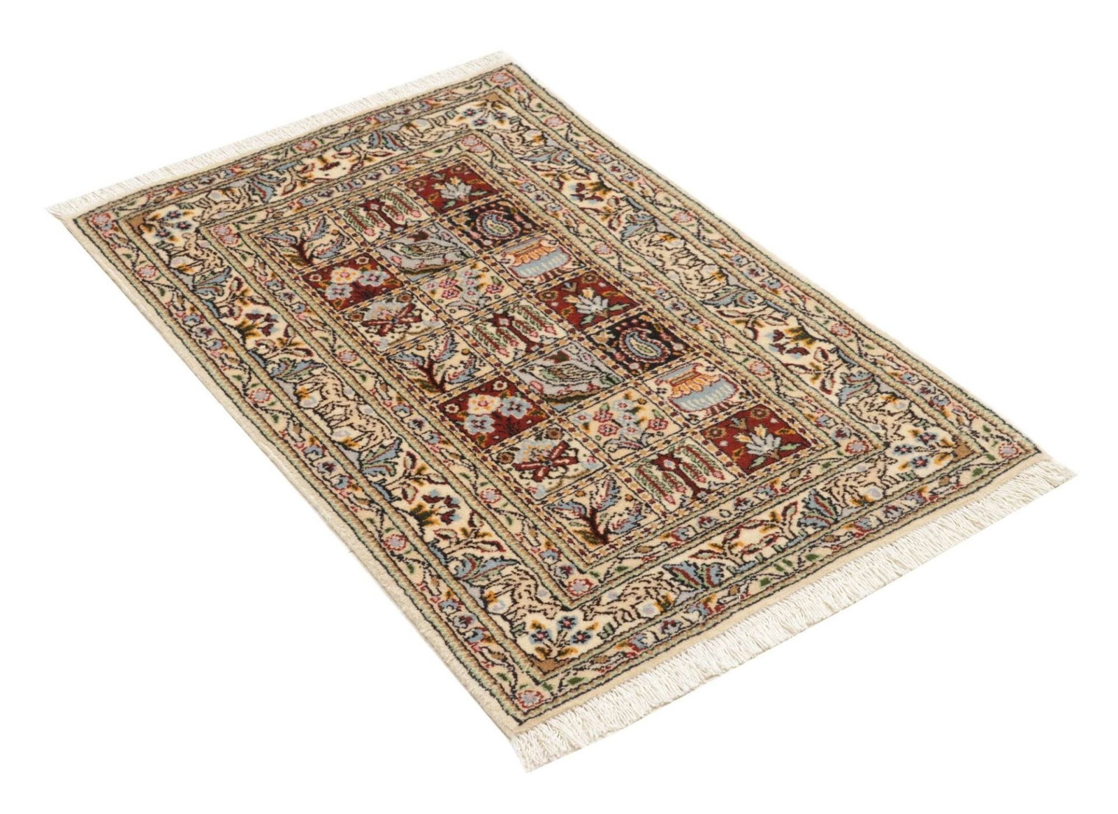 | Provenienz: Moud | Herkunft: Iran | Knotendichte: ca. 200.000 Knoten/m² | Material: 100% Schurwolle (Flor), 100% Baumwolle (Kette) | Größe: 58 x 88 cm | Höhe: ca. 10-12 mm | Muster: Floral | Zustand: Handgeknüpft, hohe Qualität | Ideal für den Alltag