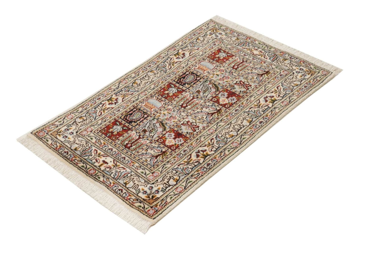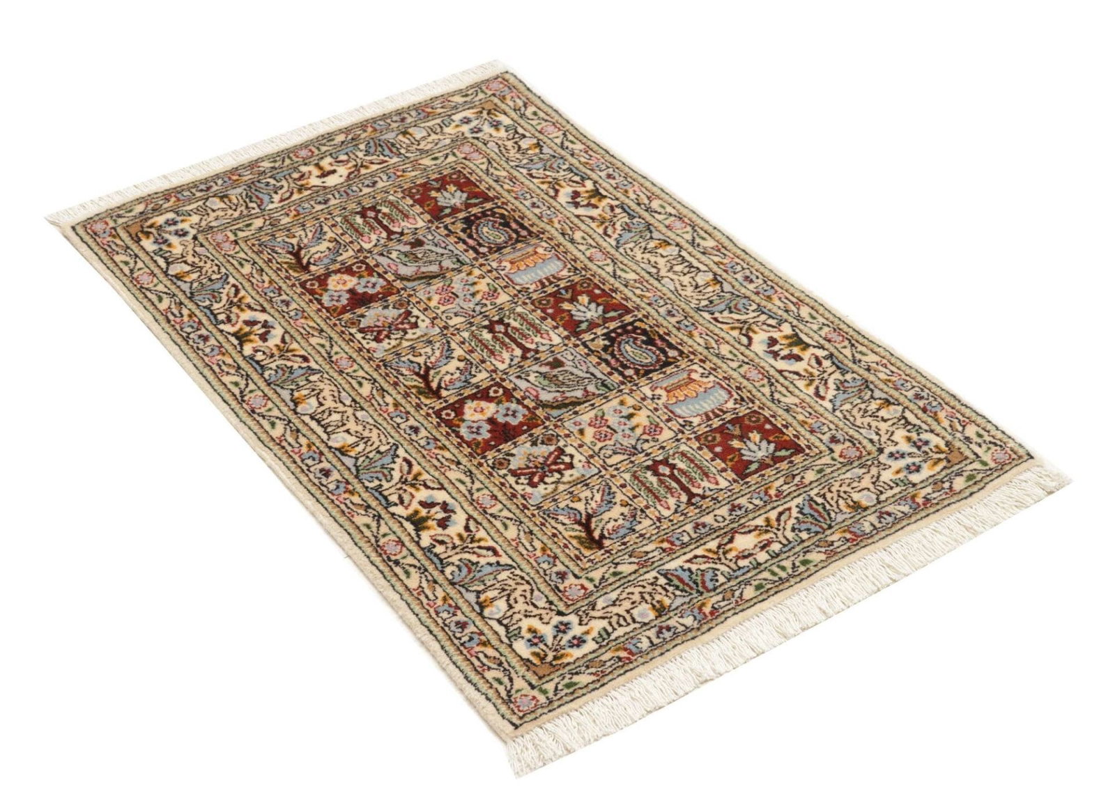 Moud Teppich | Knotendichte: ca. 200.000 Knoten/m² | Material: 100% Schurwolle (Flor), 100% Baumwolle (Kette) | Größe: 64×84 cm | Zustand: Sehr gut | Herkunft: Iran | Muster: Florale Designs | Höhe: ca. 10-12 mm