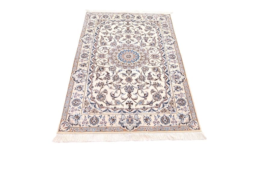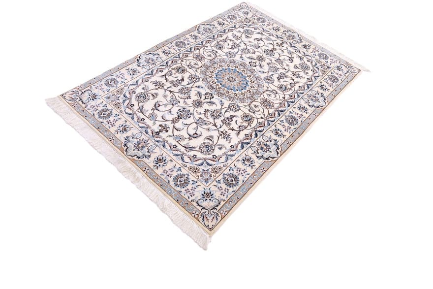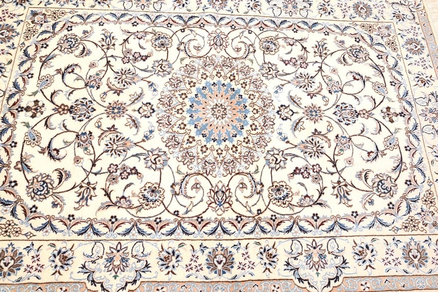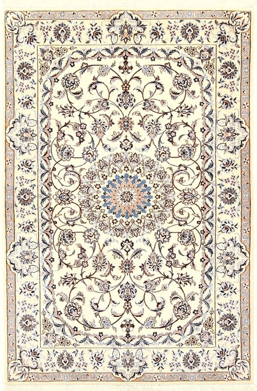 Handgewebter Nain 6 La Teppich | Knotendichte: 850.000 – 1.000.000 Knoten/m² | Material: Wolle und Seide | Größe: 166×111 cm | In neuem Zustand | Ursprung: Iran/Persien | Farben: Creme und Pastell | Allergikerfreundlich und pflegeleicht