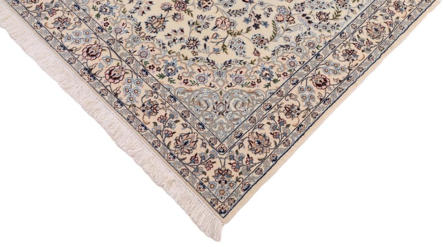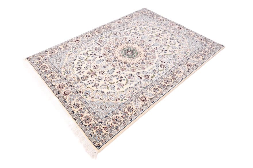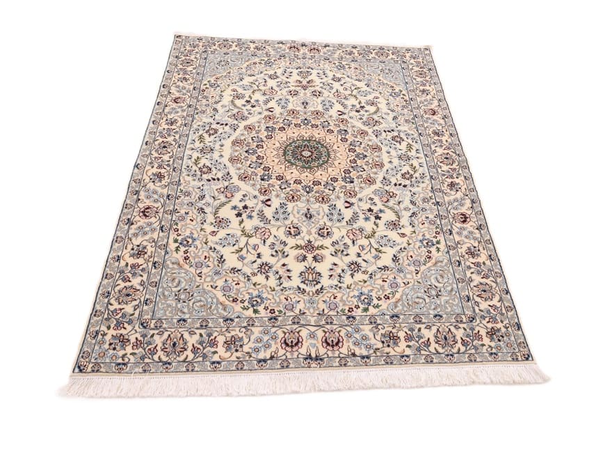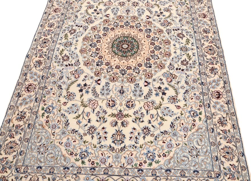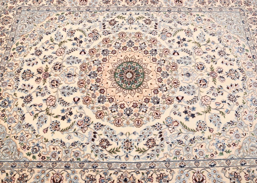 Handgewebter Nain 6 La Teppich | Knotendichte: 640.000 Knoten/m² | Material: Hochwertige Wolle und Baumwolle | Größe: 182×131 cm | Farbe: Creme und Pastell | Zustand: Antik | Ursprung: Iran/Persien | Pflegeleicht und langlebig