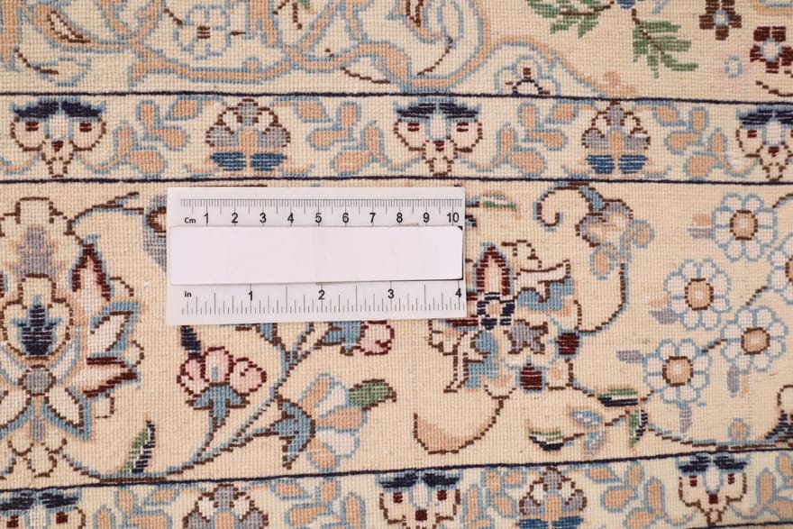 Der Nain Teppich wird aus besten Materialien gefertigt. Die Schuss- und Kettfäden bestehen in der Regel aus hochwertiger Wolle, die sich durch ihre Strapazierfähigkeit und Weichheit auszeichnet. Die Verwendung von Seide in den dekorativen Elementen des Teppichs sorgt für einen hohen Glanz und betont die feinen Muster. Die Knotendichte ist beeindruckend, was die Langlebigkeit und den Wert dieses Teppichs erheblich steigert. Mit einer dichten Knotenzahl ist dieser Teppich nicht nur ein optisches Highlight, sondern auch ein langlebiges Wohnaccessoire.