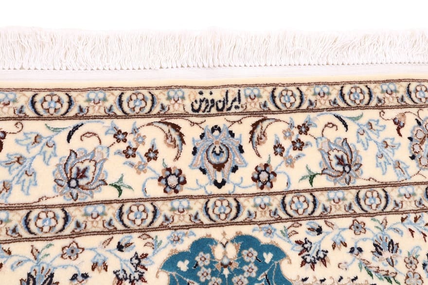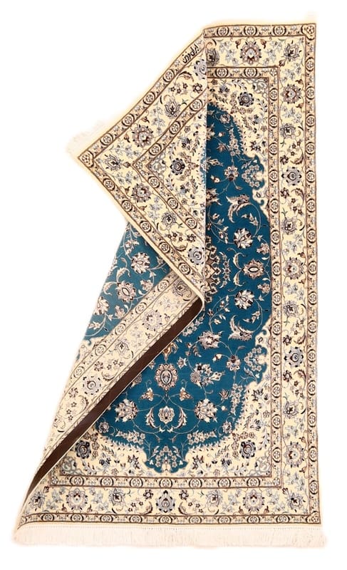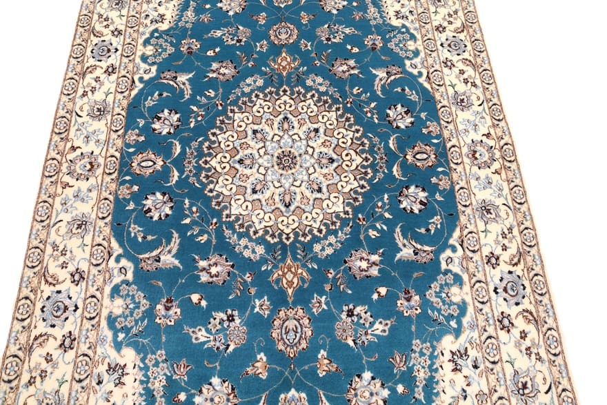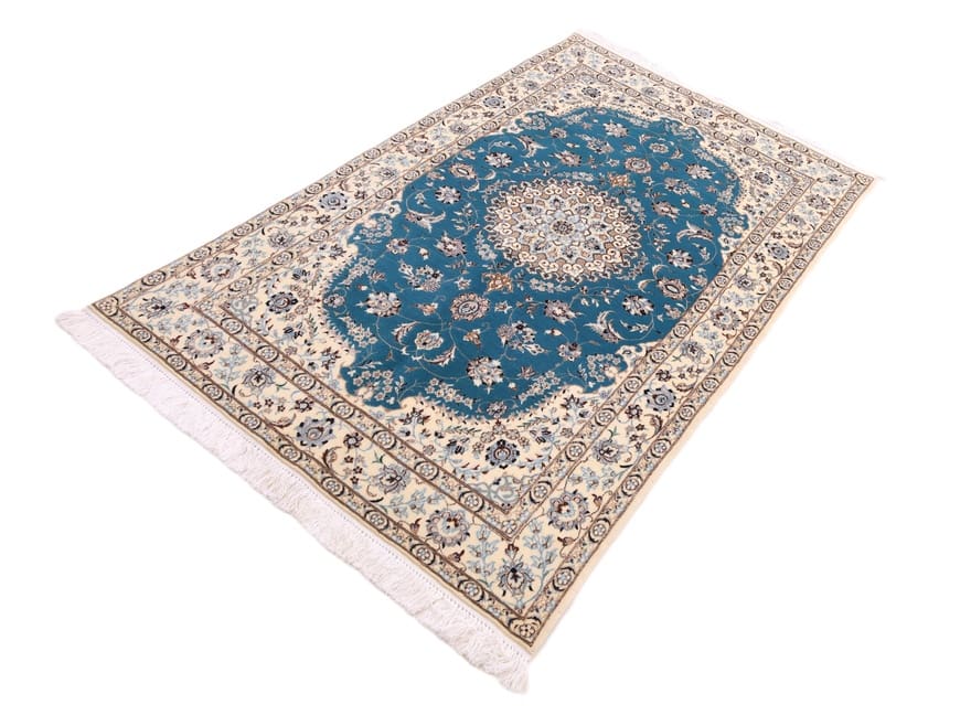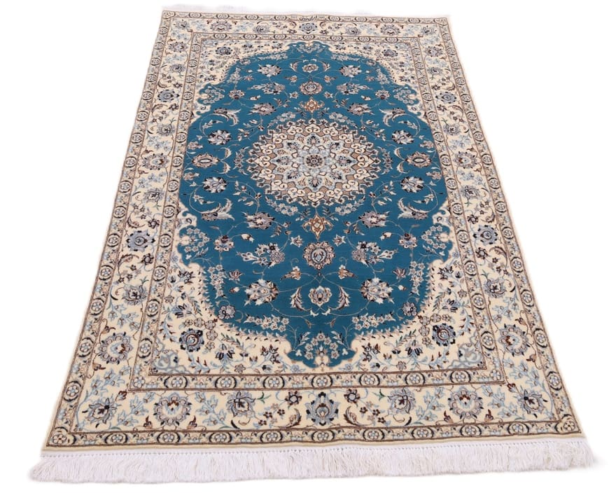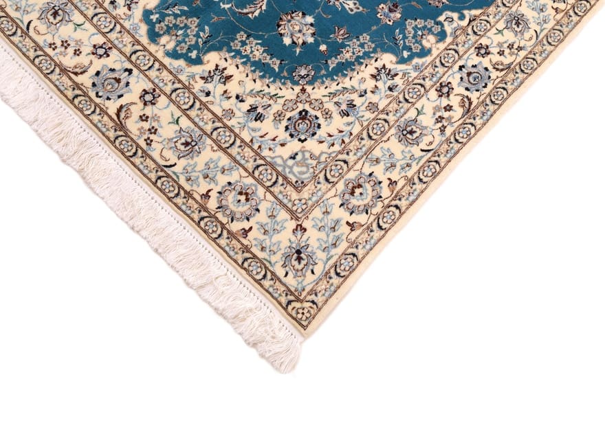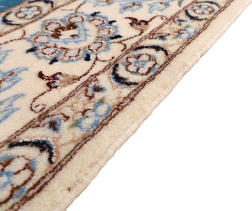 Handgewebter Nain 6 La Teppich | Knotendichte: 850.000 – 1.000.000 Knoten/m² | Material: Wolle/Seide | Größe: 185×114 cm | Farbe: Blau/Türkis | Zustand: Neu | Ursprung: Iran/Persien | Verarbeitung: Handgeknüpft | Dicke: ca. 6 mm | Gewicht: ca. 6 kg