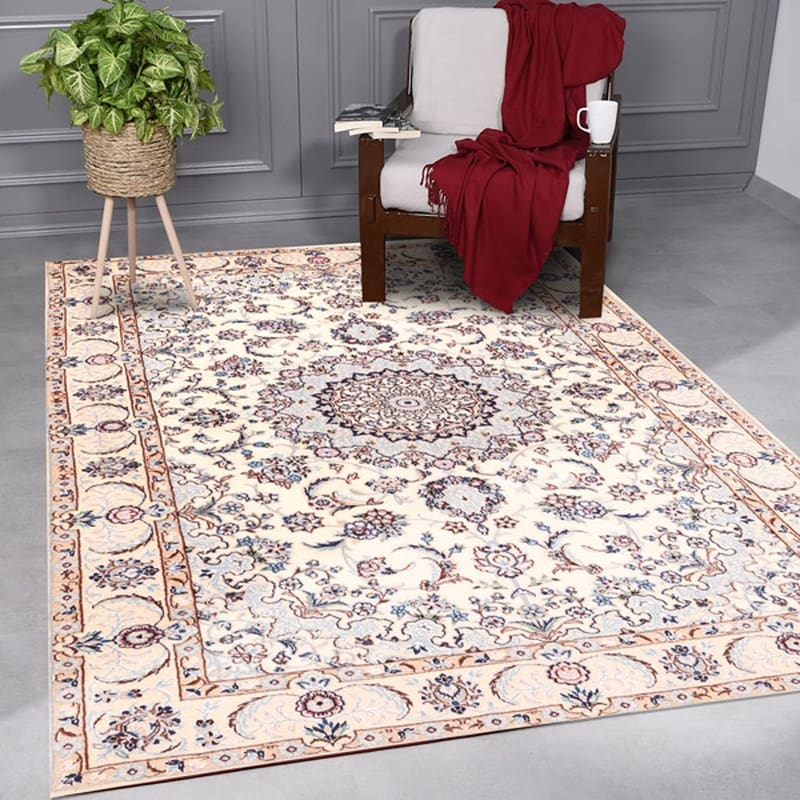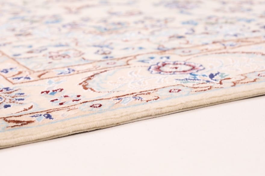Der Nain 6La Orientteppich besticht durch sein elegantes und zeitloses Design. Florale Motive und geomatische Elemente ziehen sofort die Blicke auf sich. Die typischen Muster sind liebevoll ausgearbeitet und spiegeln die Kunstfertigkeit der Teppichknüpfer wider. Die Farbpalette umfasst dezente Beigetöne, tiefes Blau und sanfte Erdtöne, die eine harmonische Atmosphäre schaffen und sich nahtlos in verschiedene Einrichtungsstile integrieren lassen. Diese Teppiche sind nicht nur Schmuckstücke, sondern auch Ausdruck kultureller Identität.