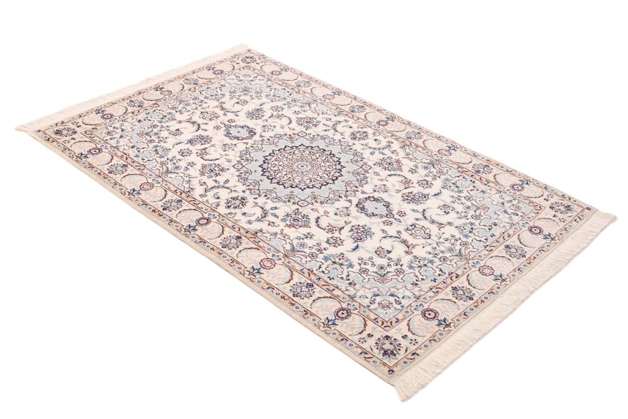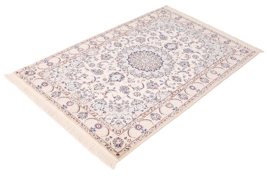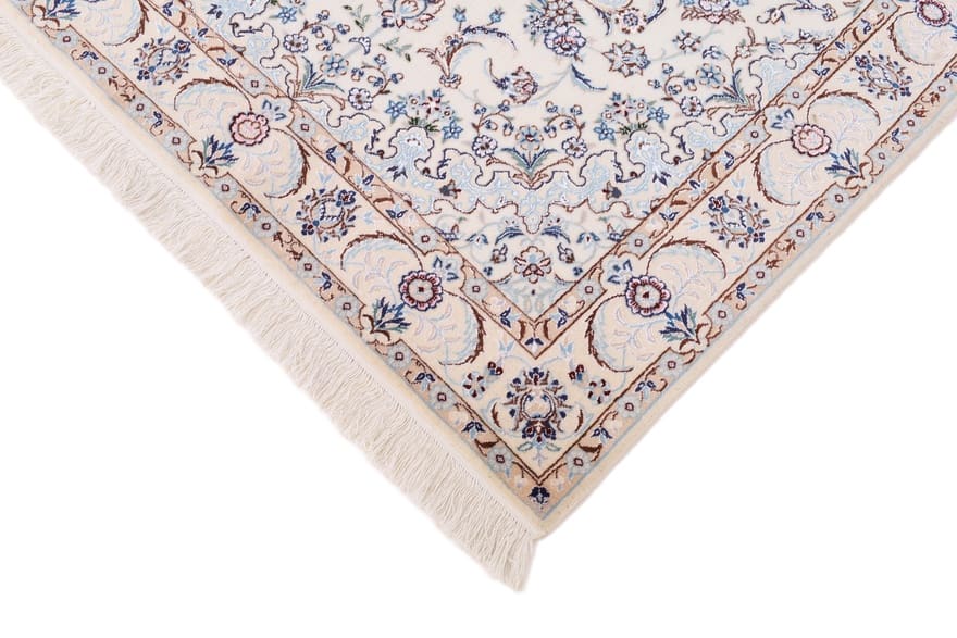 Nain 6 La Teppich | Knotendichte: 640.000 Knoten/m² | Material: Wolle und Seide | Größe: 173×112 cm | Zustand: Neuzeitlich (0-20 Jahre) | Herkunft: Iran/Persien | Verarbeitung: Handgeknüpft | Farbe: Weiß/Beige | Dicke: ca. 8 mm | Gewicht: ca. 5 kg