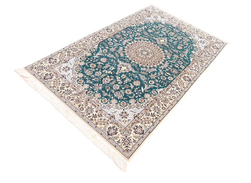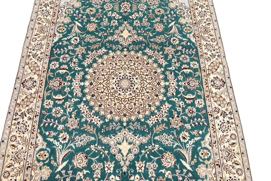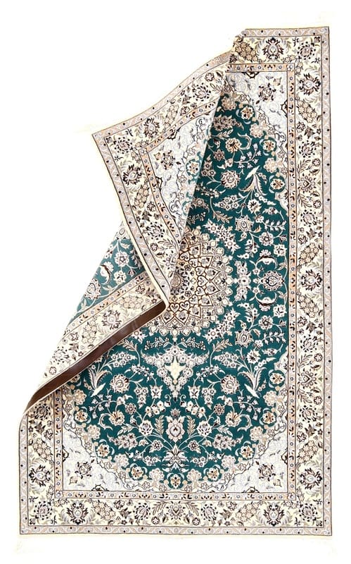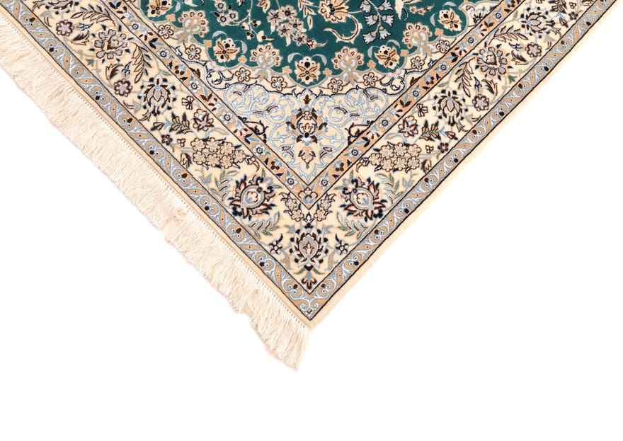 Zeitloser Nain 6La Teppich | Knotendichte: 850.000 – 1.000.000 Knoten/m² | Material: Wolle und Seide | Größe: 199×125 cm | In neuem Zustand | Herkunft: Iran/Persien | Farbton: Smaragdgrün | Verarbeitung: Handgeknüpft | Dicke: ca. 6 mm | Gewicht: ca. 6 kg