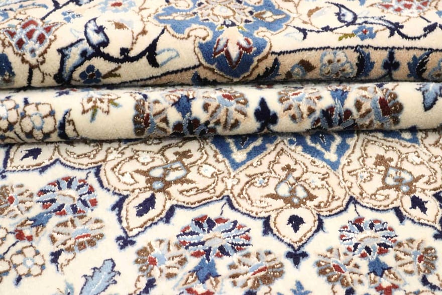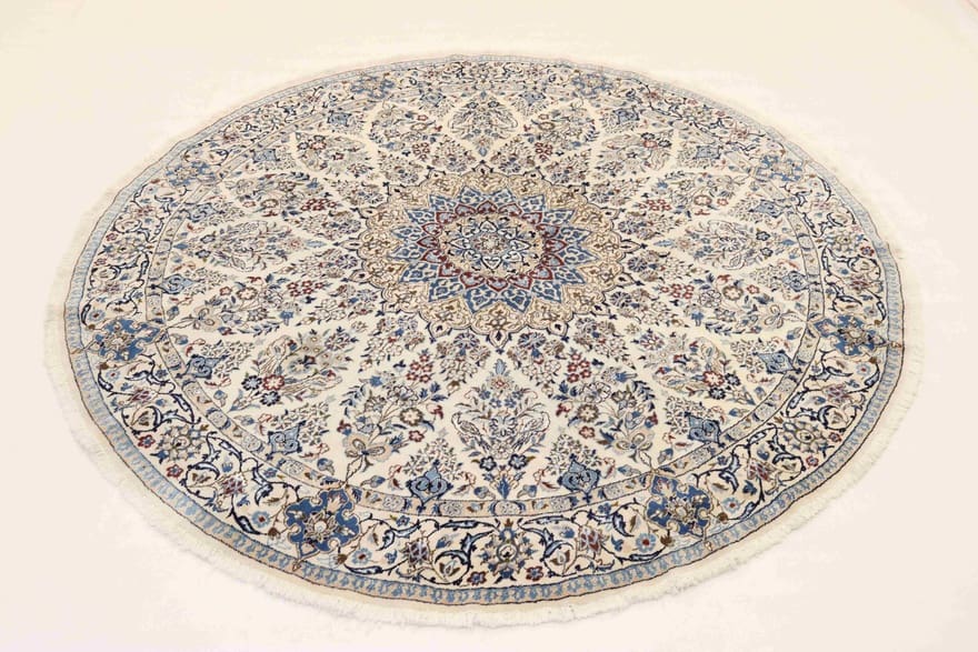 Nain 9 La Teppich | Knotendichte: 320.000 – 360.000 Knoten/m² | Material: Wolle / Seide | Größe: 261×257 cm | Form: Rund | Ursprung: Iran / Persien | Verarbeitung: Handgeknüpft | Zustand: Neuzeitlich (0-20 Jahre) | Farbe: Weiß/Beige | Dicke: ca. 8 mm | Gewicht: ca. 10 kg