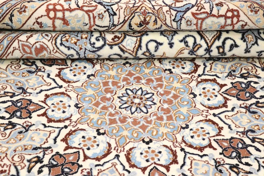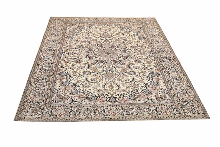 Nain Teppich 9La | Knotendichte: 440.000 – 490.000 Knoten/m² | Material: Wolle und Seide | Größe: 304×208 cm | Zustand: Neu | Ursprung: Iran/Persien | Verarbeitung: Handgeknüpft | Farbe: Weiß/Beige | Dicke: ca. 8 mm | Gewicht: ca. 22 kg