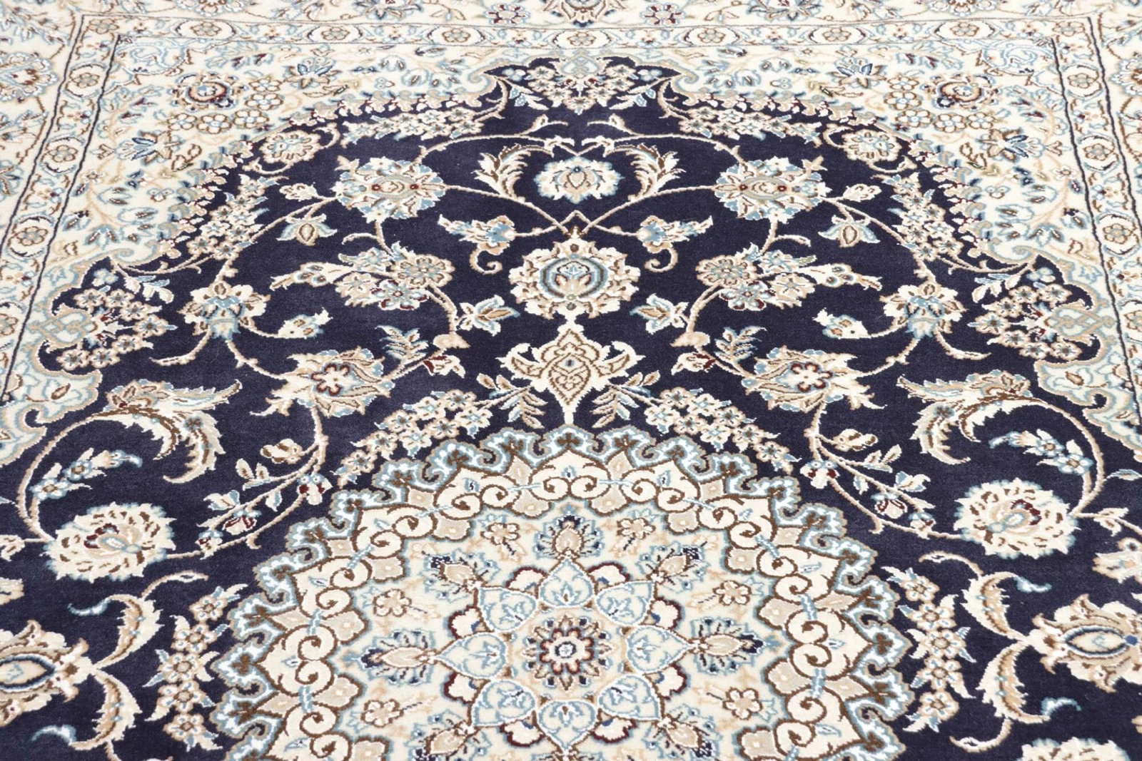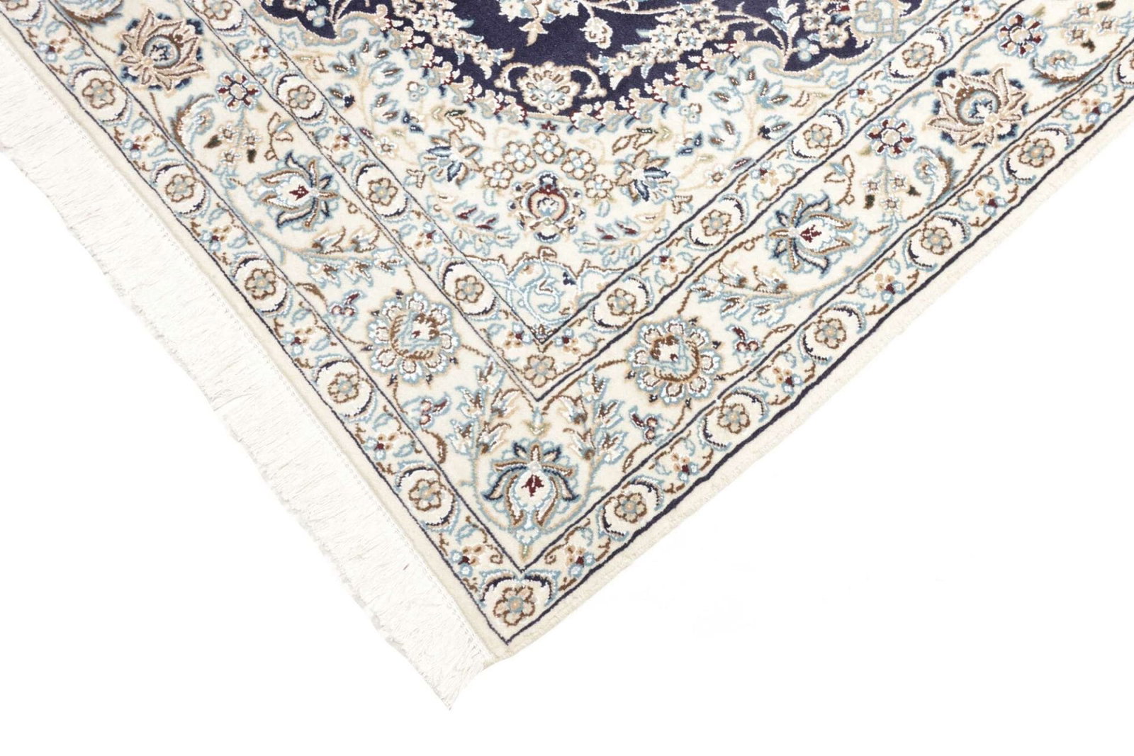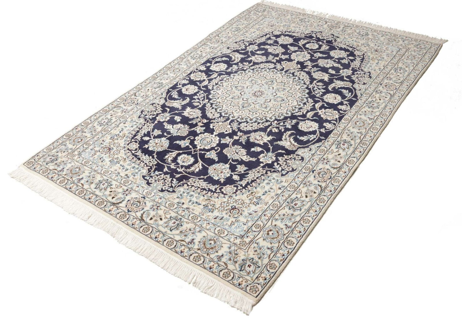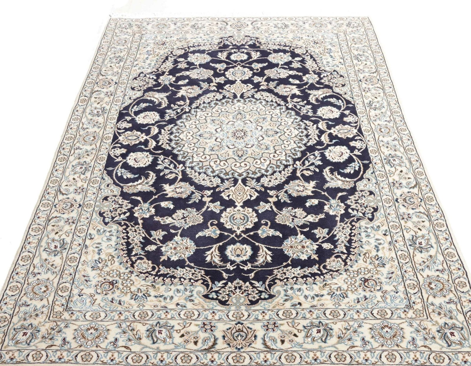 2711$Ursprünglicher Preis war: 2711$2391$Aktueller Preis ist: 2391$Nain Teppich | Knotendichte: ca. 500.000 Knoten/m² | Material: 100% Schurwolle (Flor), 100% Baumwolle (Kette) | Größe: 138 x 208 cm | Zustand: Exklusiv und handgeknüpft | Herkunft: Iran | Muster: Klassische florale Motive mit königsblauem Ton