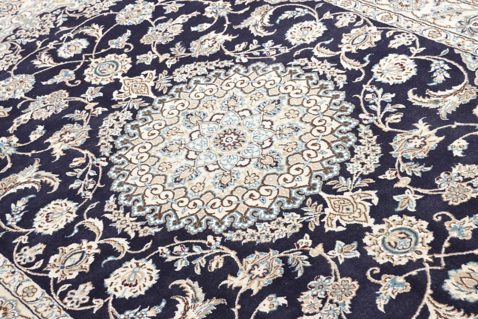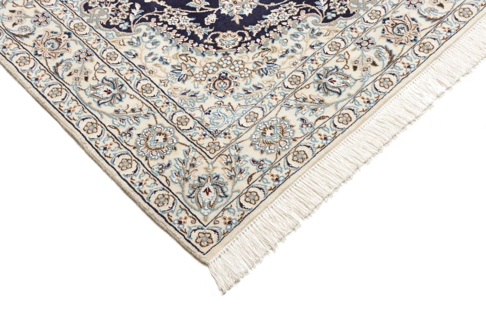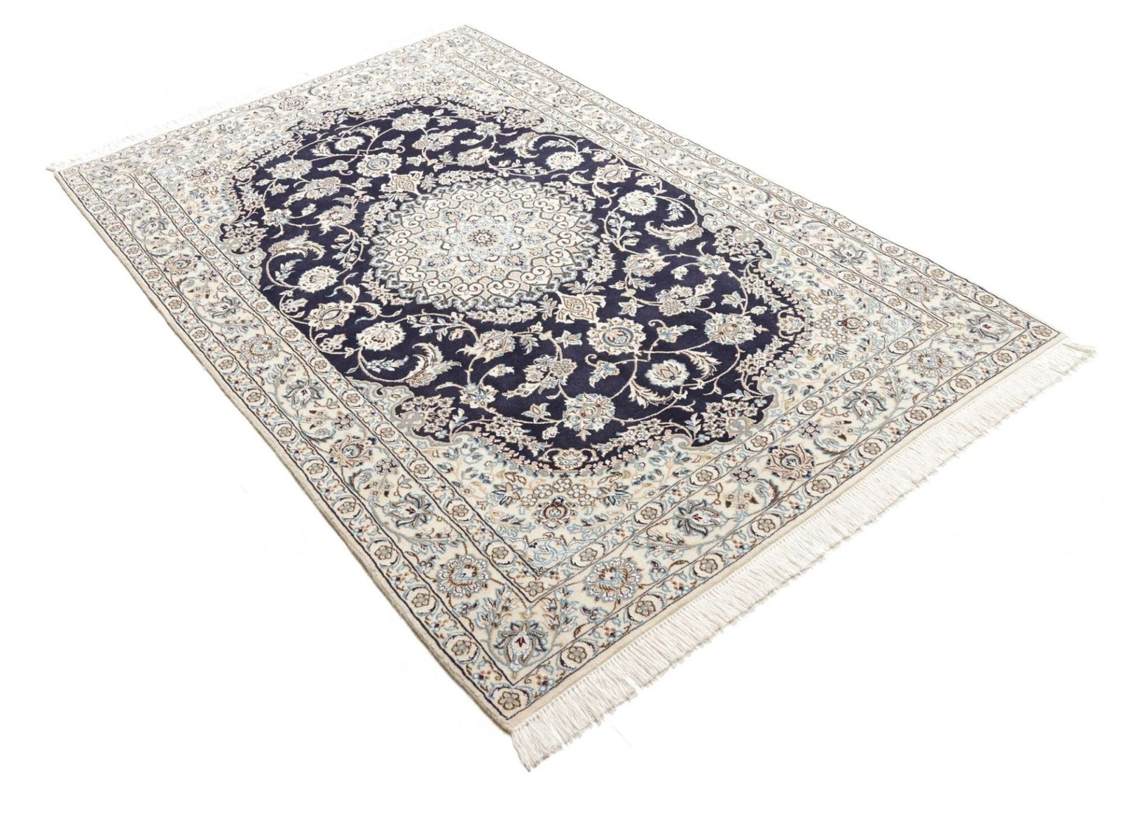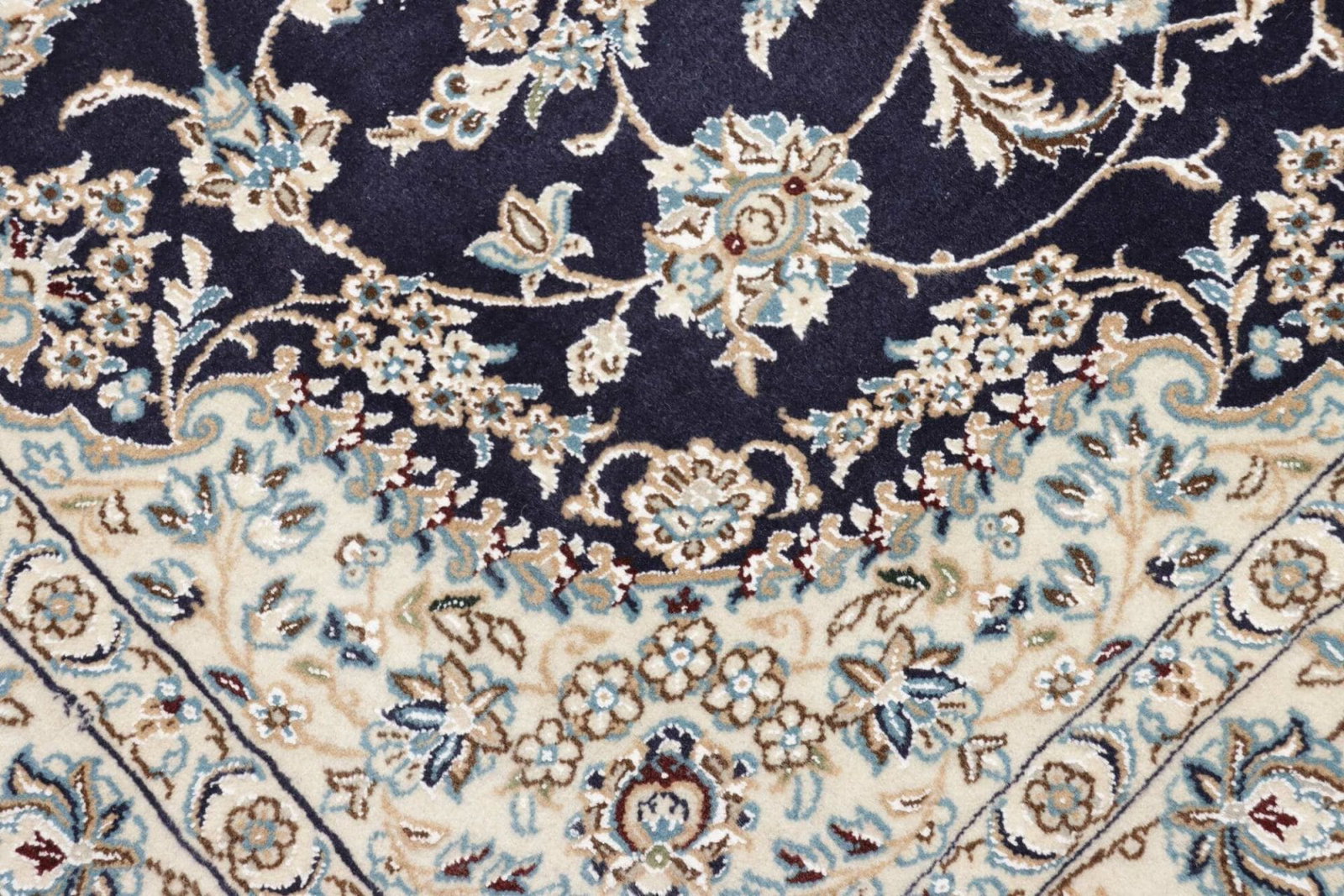 2711$Ursprünglicher Preis war: 2711$2391$Aktueller Preis ist: 2391$Nain Teppich | Knotendichte: ca. 500.000 Knoten/m² | Material: 100% Schurwolle (Flor), 100% Baumwolle (Kette) | Größe: 138 x 208 cm | Zustand: Exklusiv und handgeknüpft | Herkunft: Iran | Muster: Klassische florale Motive mit königsblauem Ton
