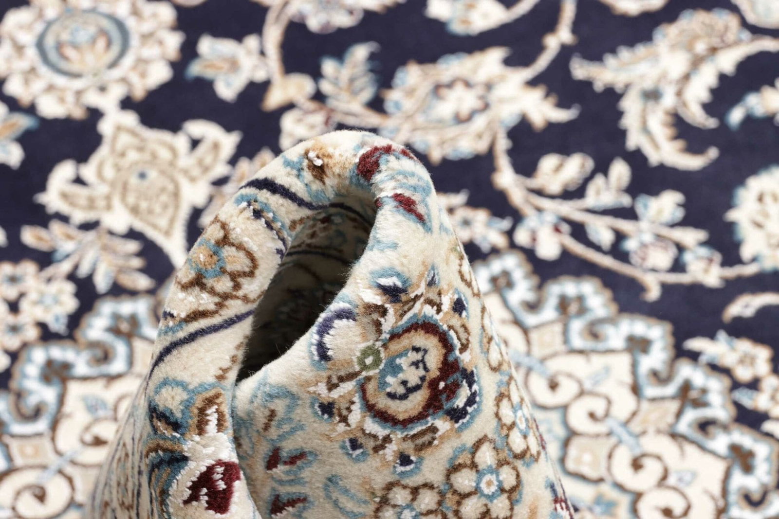Der Nain Orientteppich wird traditionell aus einer Kombination von Schafwolle und Baumwolle gefertigt. Wolle sorgt für eine angenehme Haptik und hervorragende Strapazierfähigkeit, während Baumwolle ein stabiles Fundament bietet. Die handgeknüpfte Technik zeichnet sich durch eine präzise Ausführung und die Verwendung hochwertiger Rohstoffe aus. Diese kombiniert mit einer hohen Knotendichte sorgt für einen Teppich, der nicht nur schön, sondern auch funktional ist.