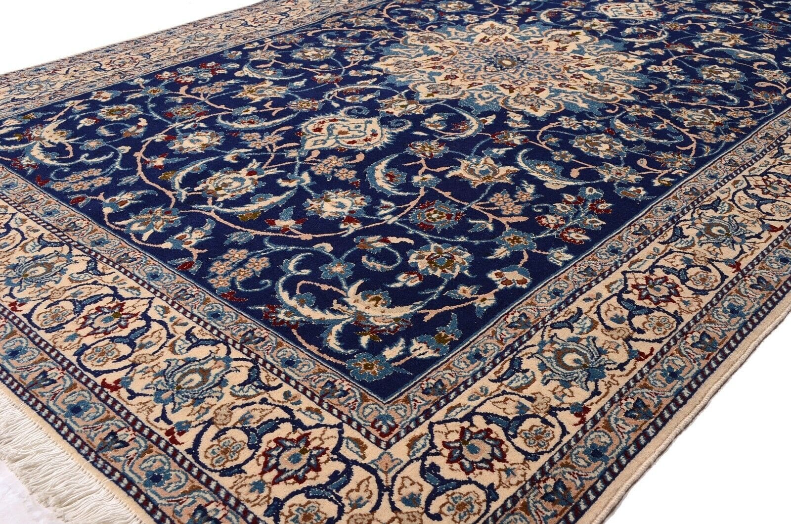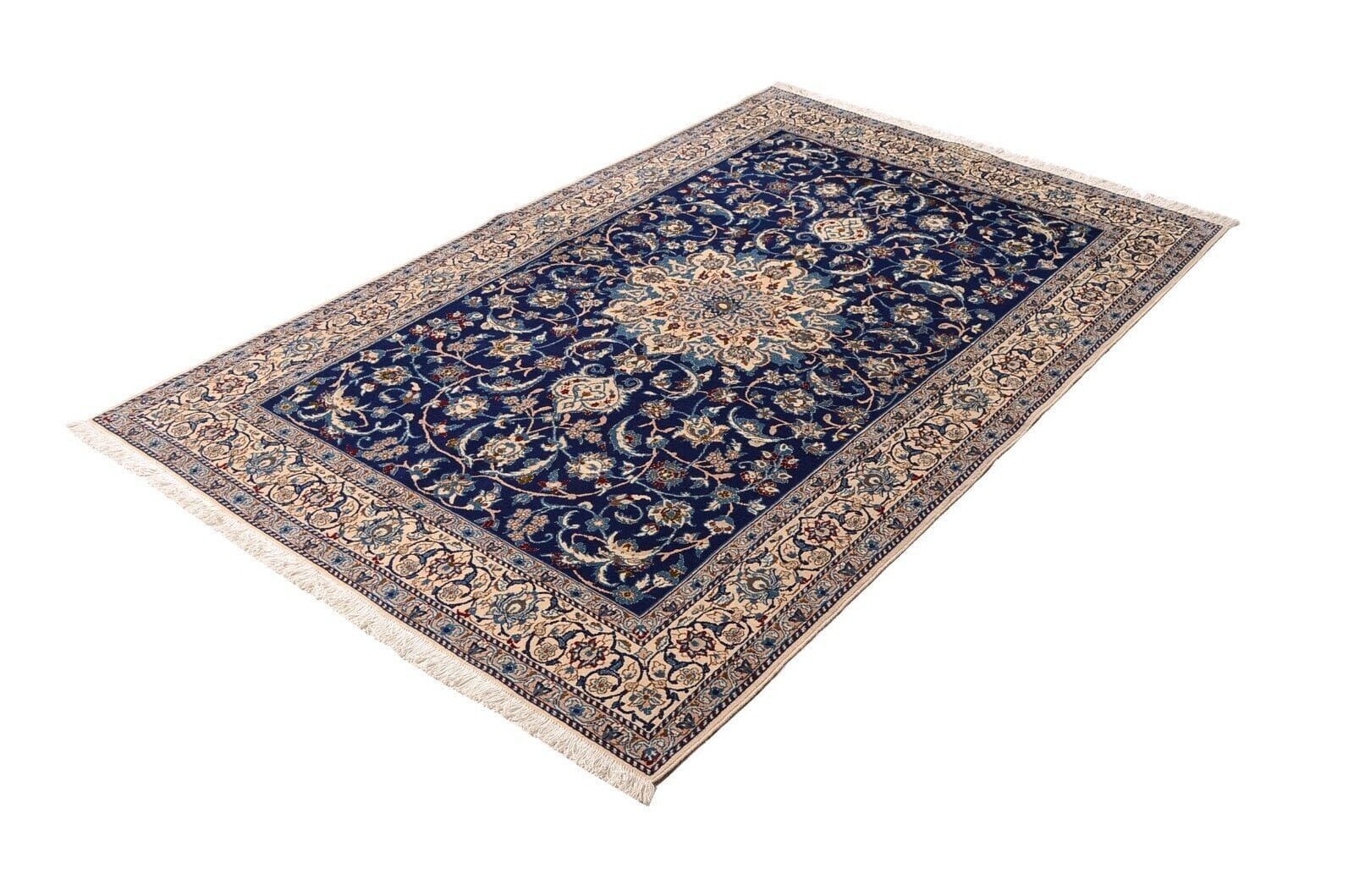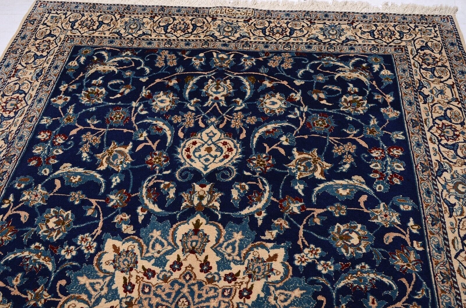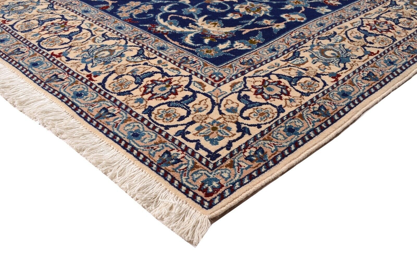 Handgeknüpfter Nain-Teppich | Größe: 252 x 158 cm | Knotendichte: 400.000 Knoten/m² | Material: 95% Schurwolle, 5% Seide | Zustand: Neu, unbenutzt | Herkunft: Persien | Florhöhe: ca. 10 mm | Ideal für alle Zimmer | Signiertes Design mit floralen Motiven | Für Fußbodenheizung geeignet