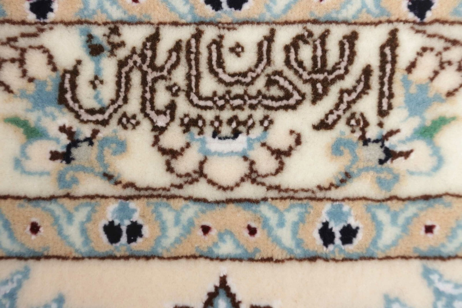 Der Nain Orientteppich wird aus feinstem Wolle und Seide gefertigt, was ihm nicht nur einen luxuriösen Glanz verleiht, sondern auch für hohe Strapazierfähigkeit sorgt. Die Kombination dieser Materialien gewährleistet, dass der Teppich sowohl weich im Griff als auch robust im Gebrauch ist. Die handgeknüpfte Technik sorgt dafür, dass jeder Teppich ein Unikat ist und die handwerkliche Fertigung eine Knotendichte aufweist, die sowohl ästhetisch ansprechend als auch langlebig ist. Diese Knotendichte ermöglicht es, komplexe Muster mit hoher Detailtreue darzustellen.