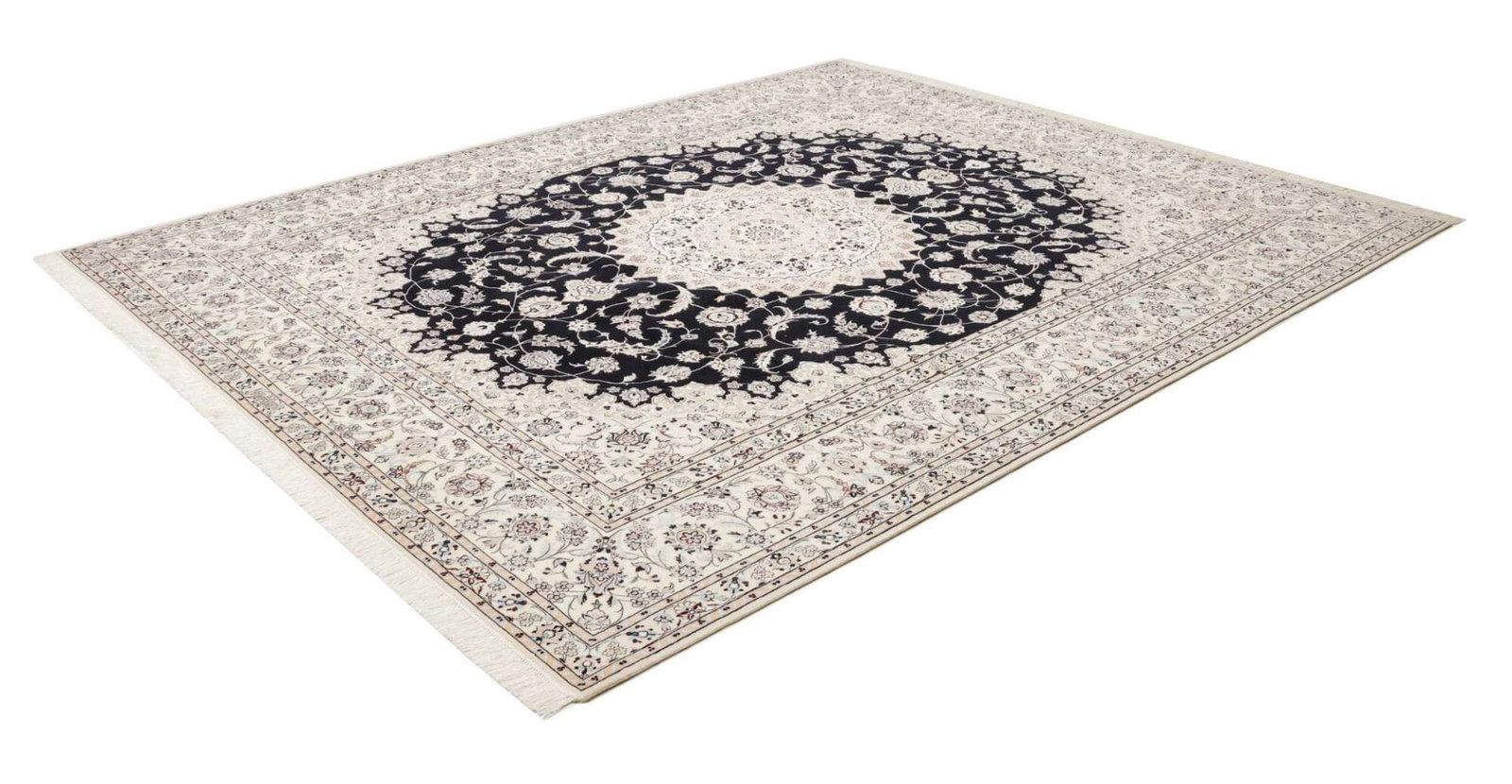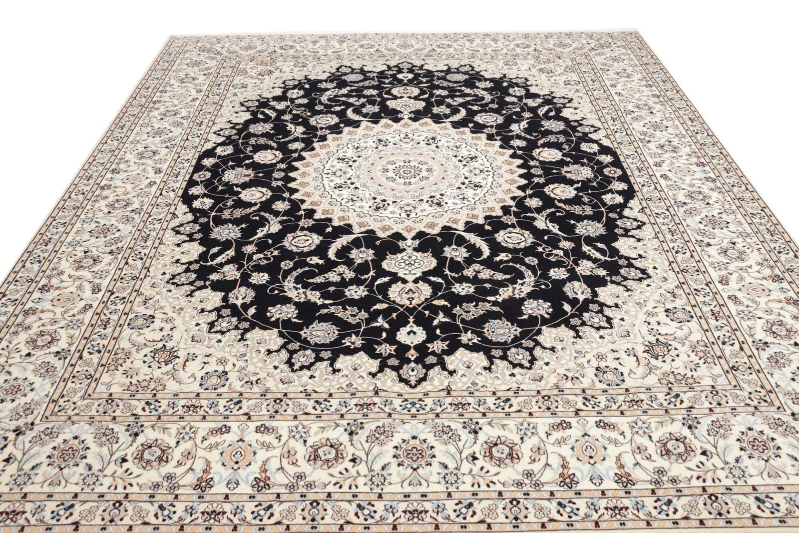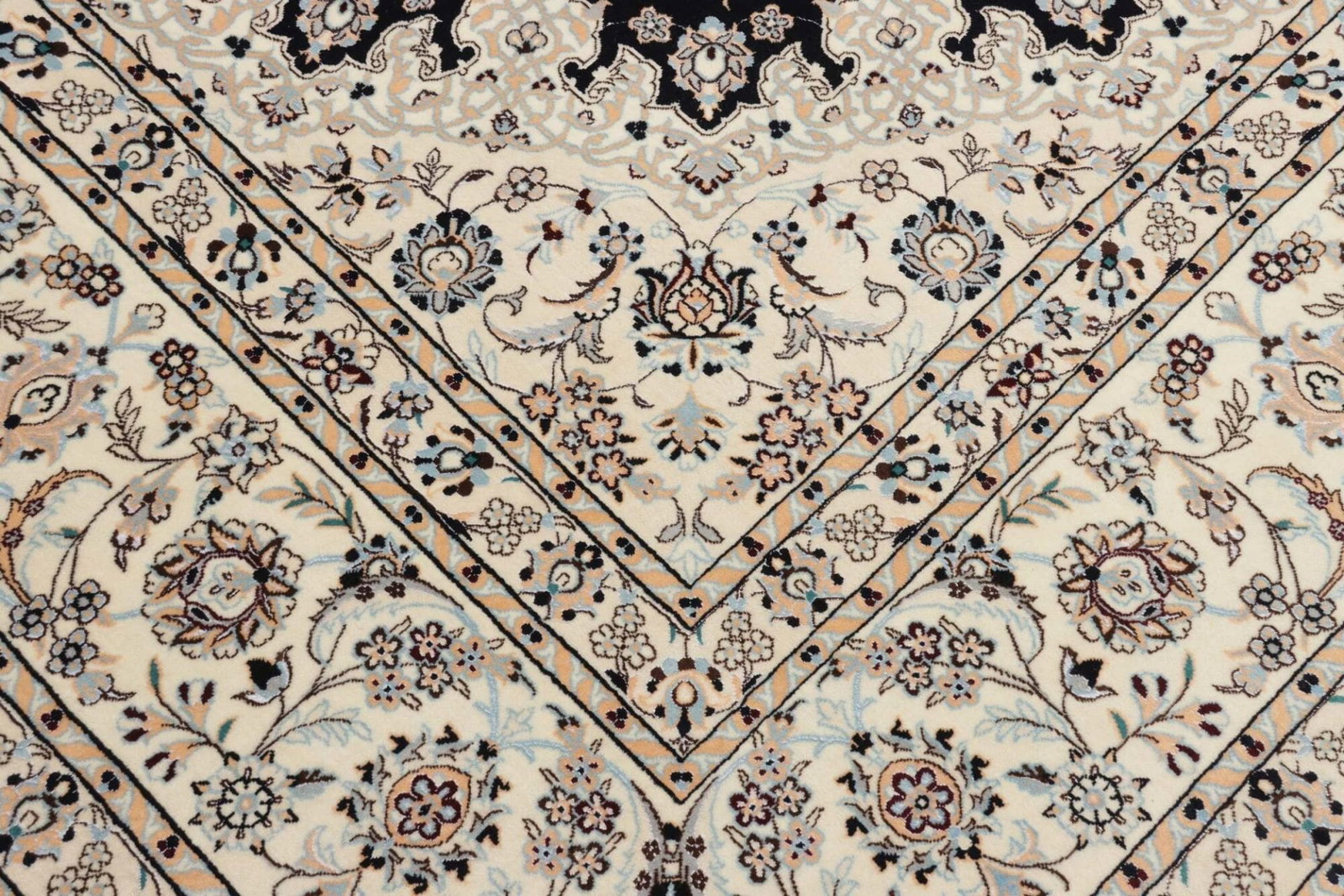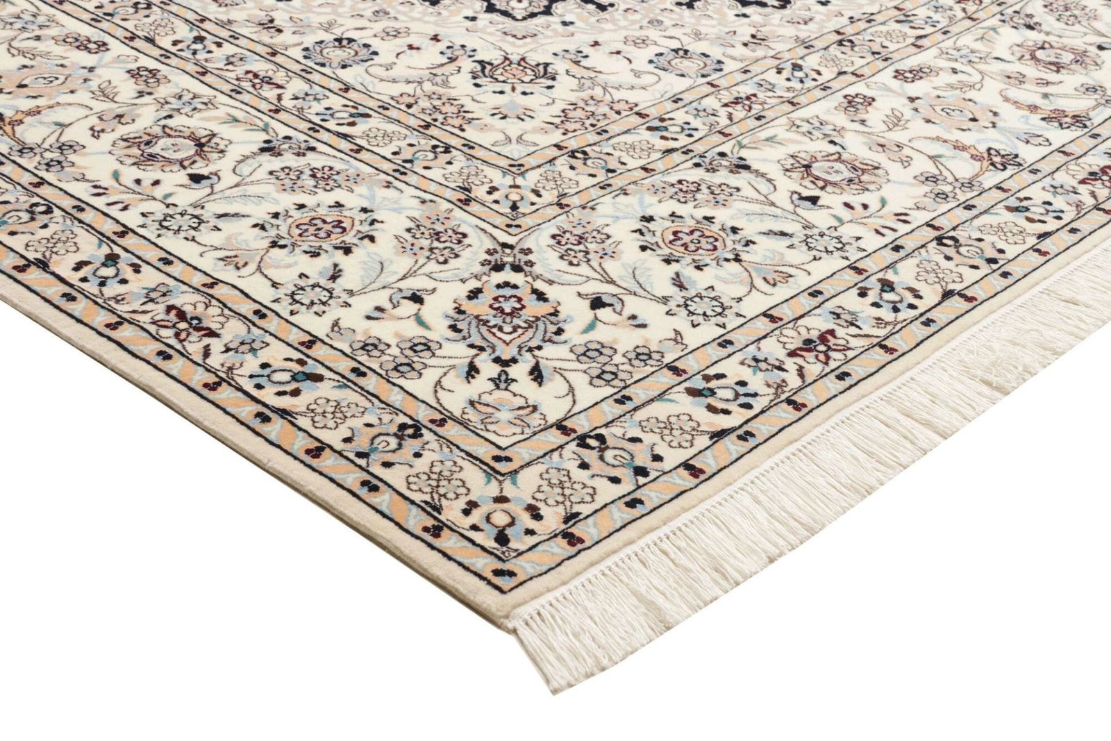 Nain Teppich | Knotendichte: ca. 900.000 Knoten/m² | Material: 100% Schurwolle (Flor), 100% Baumwolle (Kette) | Größe: 262 x 310 cm | Herkunft: Iran | Zustand: Handgeknüpft und in ausgezeichnetem Zustand | Exklusive florale Musterung mit königsblauen Akzenten
