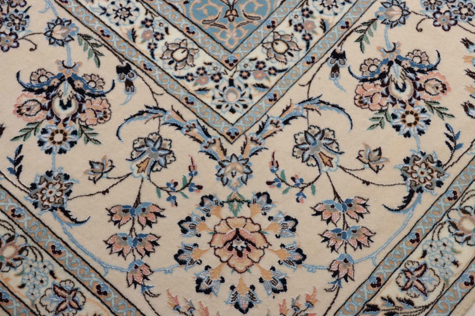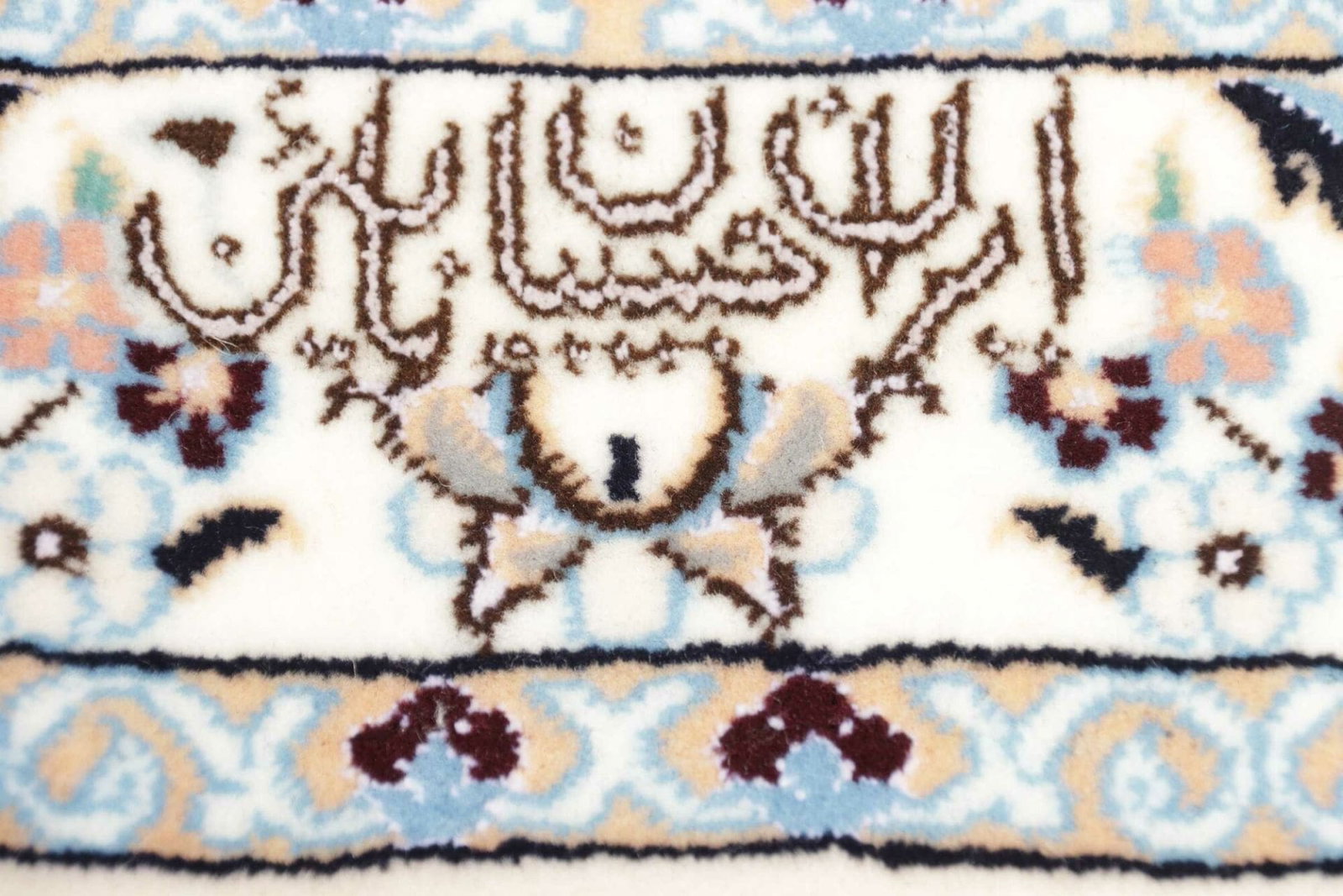 Das florale Muster des Nain 6La Teppichs ist ein wunderschönes Beispiel für die Kunstfertigkeit der iranischen Teppichknüpfer. Die floralen Motive sind harmonisch angeordnet und verleihen dem Teppich eine lebendige Ausstrahlung. Oftmals symbolisieren die floralen Muster die Einheit von Natur und Mensch, die in der orientalischen Kunst besonders geschätzt wird. Der Teppich ist nicht nur ein dekorativer Gegenstand; er vermittelt eine tiefere kulturelle Bedeutung und spiegelt die Geschichte und Traditionen der Region wider.