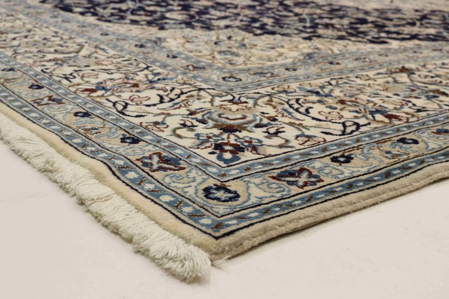 Nain Teppich | Knotendichte: 160.000 – 200.000 Knoten/m² | Material: Handgesponnene Wolle und Baumwolle | Größe: 387×299 cm | Zustand: Neu | Herkunft: Iran/Persien | Dicke: ca. 10 mm | Gewicht: ca. 28 kg | Farbe: Blau/Türkis | Form: Rechteckig