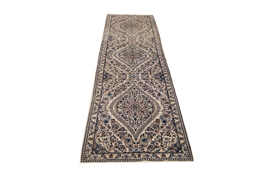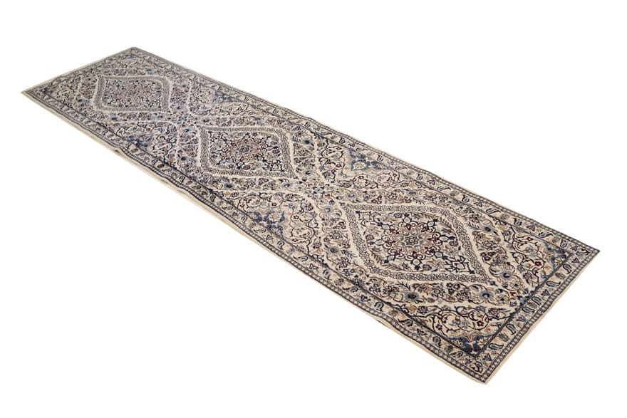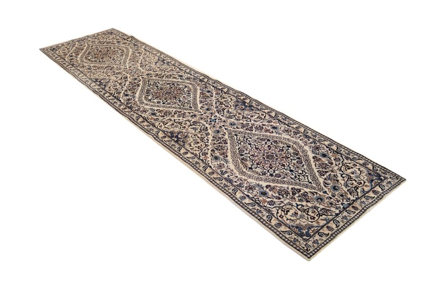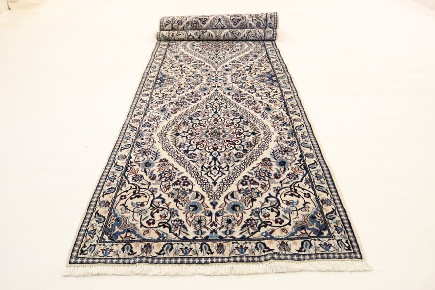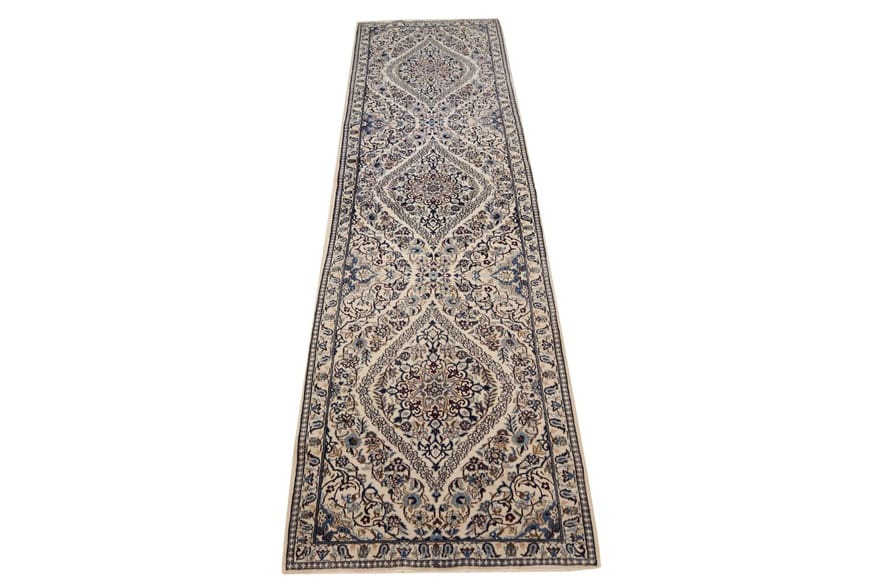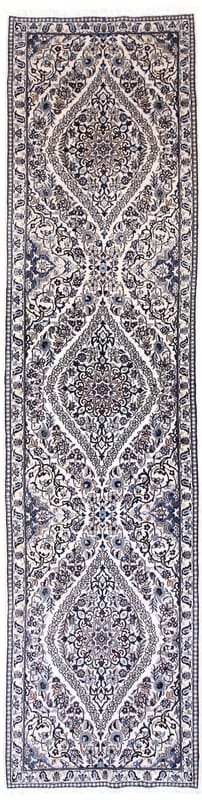 Nain Teppich 9La | Knotendichte: 320.000 – 360.000 Knoten/m² | Material: Wolle und Seide | Größe: 392×98 cm | Handgeknüpft | Zustand: Neuzeitlich (0-20 Jahre) | Ursprung: Iran/Persien | Gewicht: ca. 8 kg | Farbe: Weiß/Beige | Form: Läufer