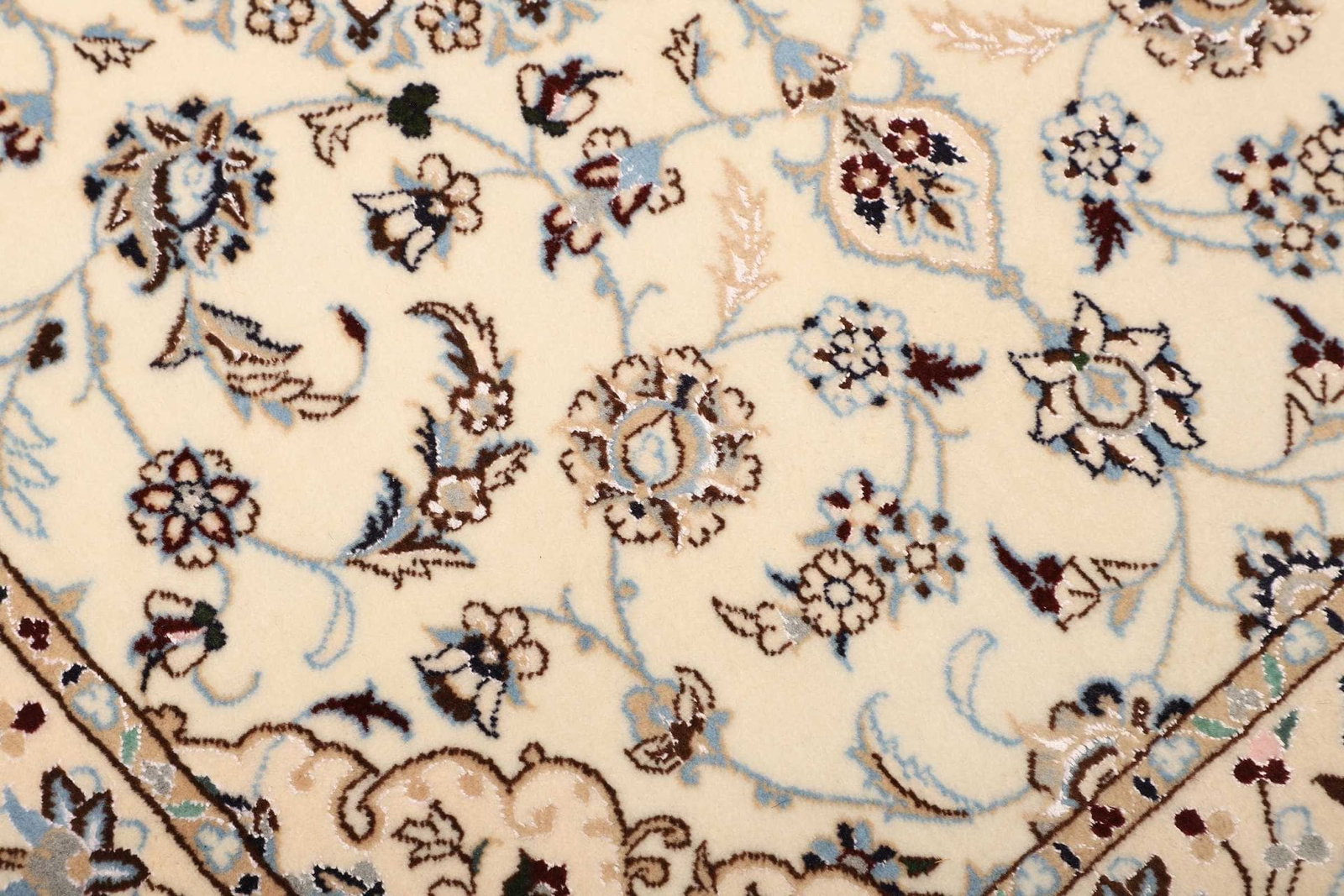 Das florale Muster des Nain Orientteppichs ist ein wunderbares Beispiel für die künstlerische Meisterschaft der Teppichknüpfer dieser Region. Florale Designs sind in der orientalischen Teppichkunst häufig anzutreffen und symbolisieren Fragilität, Wachstum und Schönheit. Die Farben blühen förmlich auf und schaffen eine harmonische Atmosphäre in jedem Raum. Dank der hochwertigen Materialien und der handgeknüpften Technik bleibt die Farbintensität auch über Jahre hinweg erhalten.