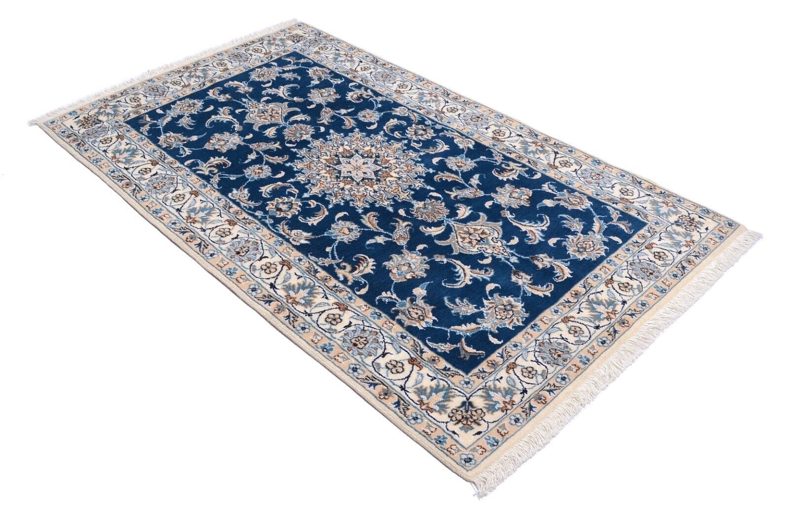 Handgeknüpfter Orientteppich Nain | Größe: 197 x 117 cm | Material: 100% Schurwolle | Knotendichte: 300.000 Knoten/m² | Muster: Floralmotiv mit Medaillon | Dicke: ca. 10 mm | Zustand: Neu, perfekt | Herkunft: Zentral-Persien | Für Fußbodenheizung geeignet | Hohe Farbbeständigkeit