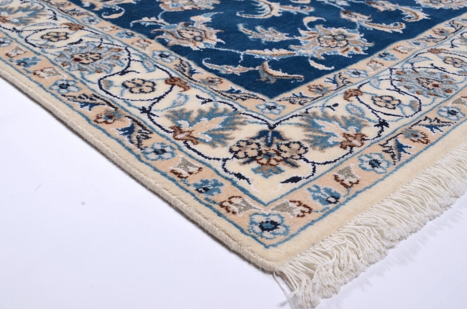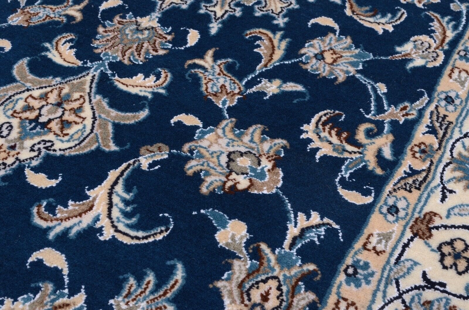 Das florale Motiv des Nain Perserteppichs stellt eine gelungene Komposition aus verschiedenen floralen Elementen dar, die harmonisch angeordnet sind. Dieses Design symbolisiert die Verbindung zwischen Mensch und Natur und ist ein häufiges Thema in der persischen Kunst. Die Nutzung von Royalblau als Grundfarbe macht den Teppich zu einem Blickfang in jedem Raum. Die Kombination aus Farben und Mustern verleiht dem Teppich eine belebende und doch beruhigende Ausstrahlung, die sowohl moderne als auch traditionelle Einrichtungsstile perfekt ergänzt.