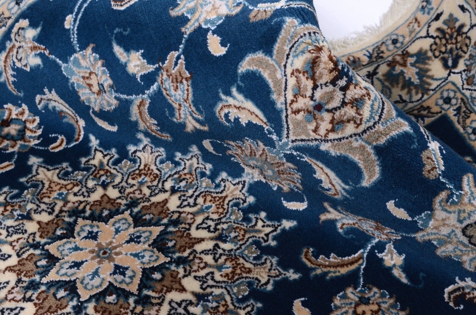 Der Nain Perserteppich ist ein prachtvolles Kunstwerk, das nicht nur den Raum ästhetisch bereichert, sondern auch durch seine hochwertige Verarbeitung besticht. Mit einer beeindruckenden Knotendichte von 300.000 Knoten pro Quadratmeter wird jeder Teppich zu einem einzigartigen Exemplar, das handgeknüpft in sorgfältiger Handarbeit entstanden ist. Der Teppich ist in einem eleganten Royalblau gehalten, das ihm eine königliche Ausstrahlung verleiht. Das florale Motiv, das sich über die gesamte Fläche erstreckt, zeigt die zeitlose Eleganz und die hohe Kunstfertigkeit, die mit der traditionellen Teppichknüpfung des Iran verbunden ist.
