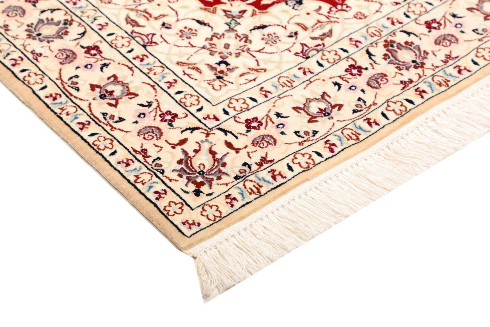 Nain Teppich | Knotendichte: ca. 900.000 Knoten/m² | Material: 100% Schurwolle (Flor) und 100% Baumwolle (Kette) | Größe: 101×144 cm | Herkunft: Iran | Zustand: Handgeknüpft und in ausgezeichnetem Zustand | Exklusive florale Musterung in hellem Grundton und königsblauen Akzenten