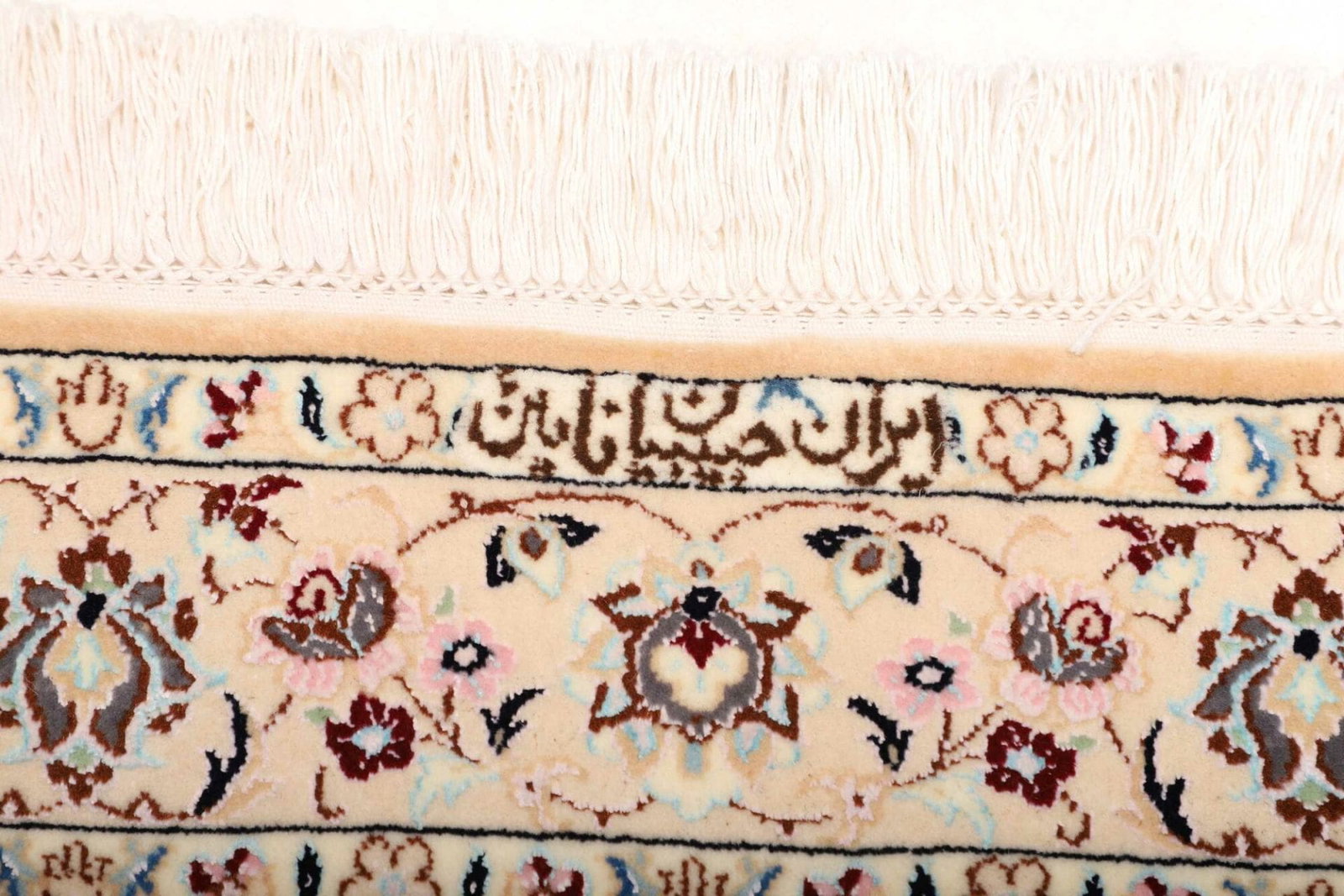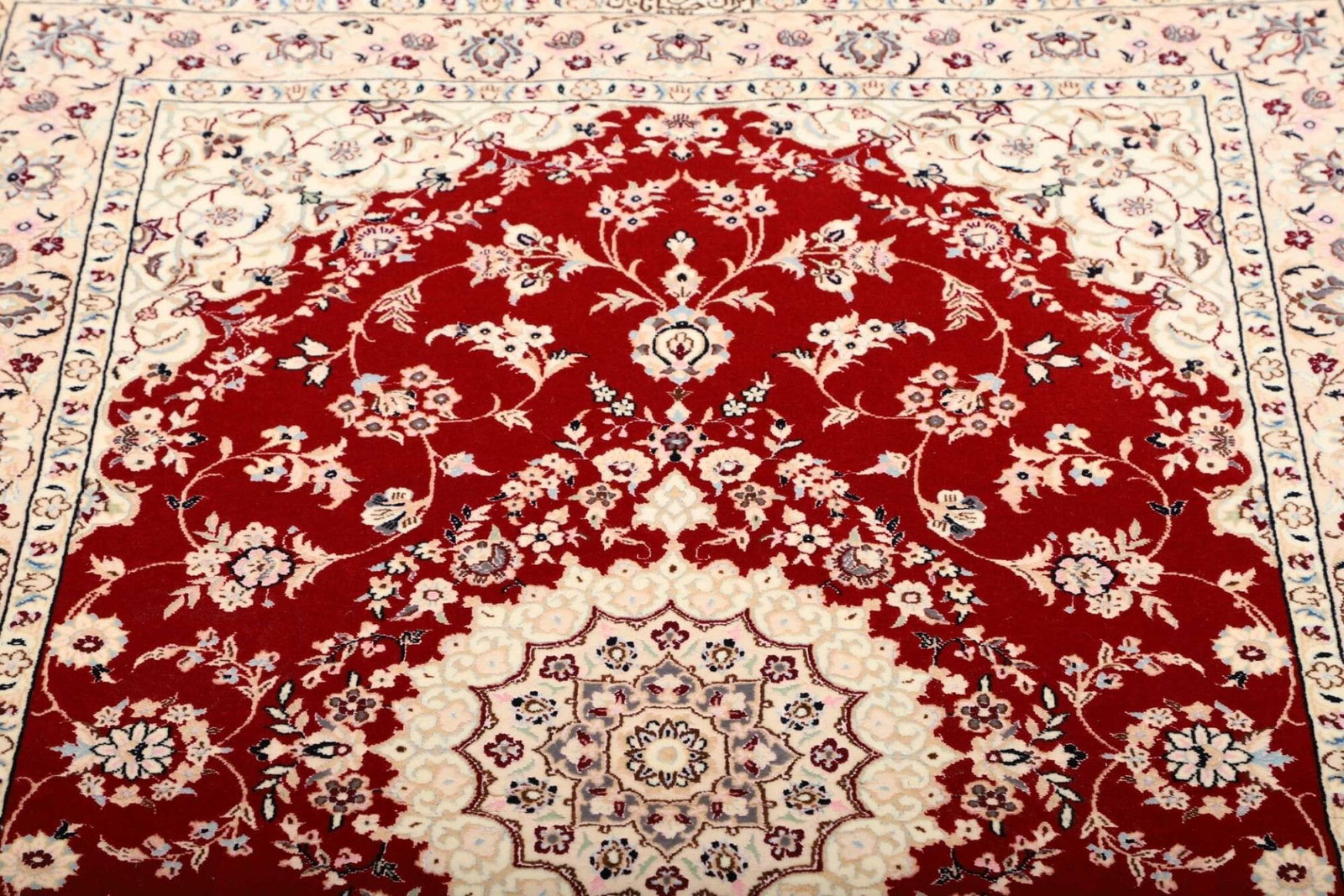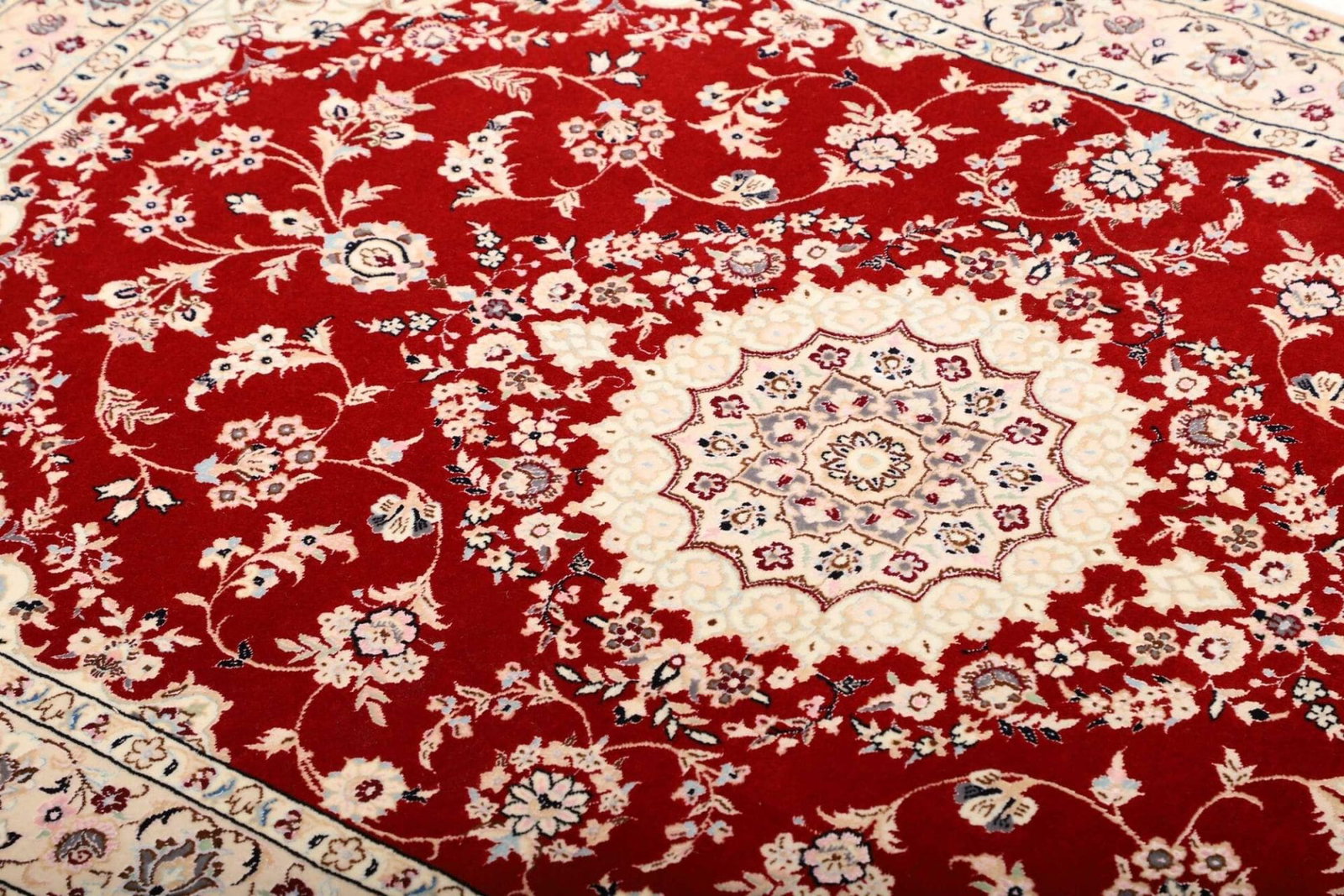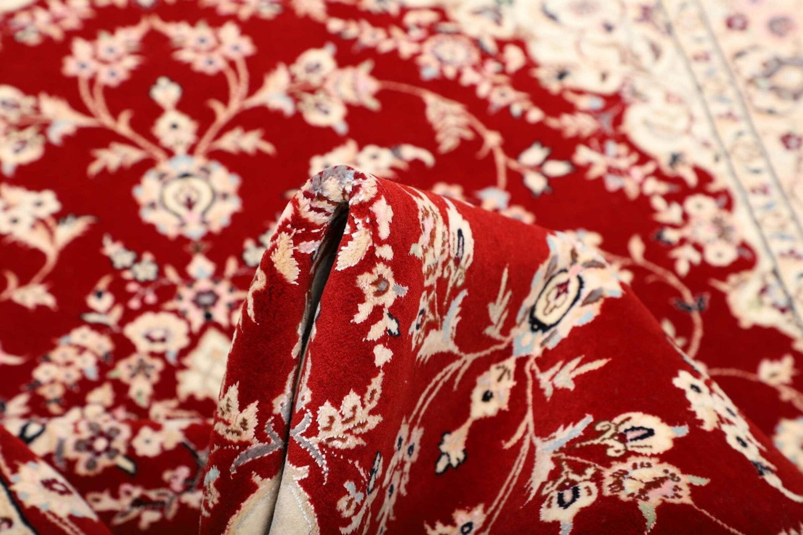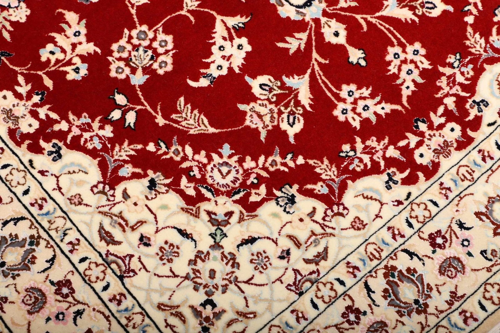 Das florale Design des Nain Teppichs ist nicht nur ästhetisch ansprechend, sondern auch reich an kultureller Symbolik. In der Tradition der persischen Teppichkunst steht das florale Muster oft für Fruchtbarkeit, Schönheit und die Verbindung zur Natur. Diese Motive sind kunstvoll mit feinen Linien und harmonischen Farbtönen gestaltet, was dem Teppich eine fast lebendige Ausstrahlung verleiht.