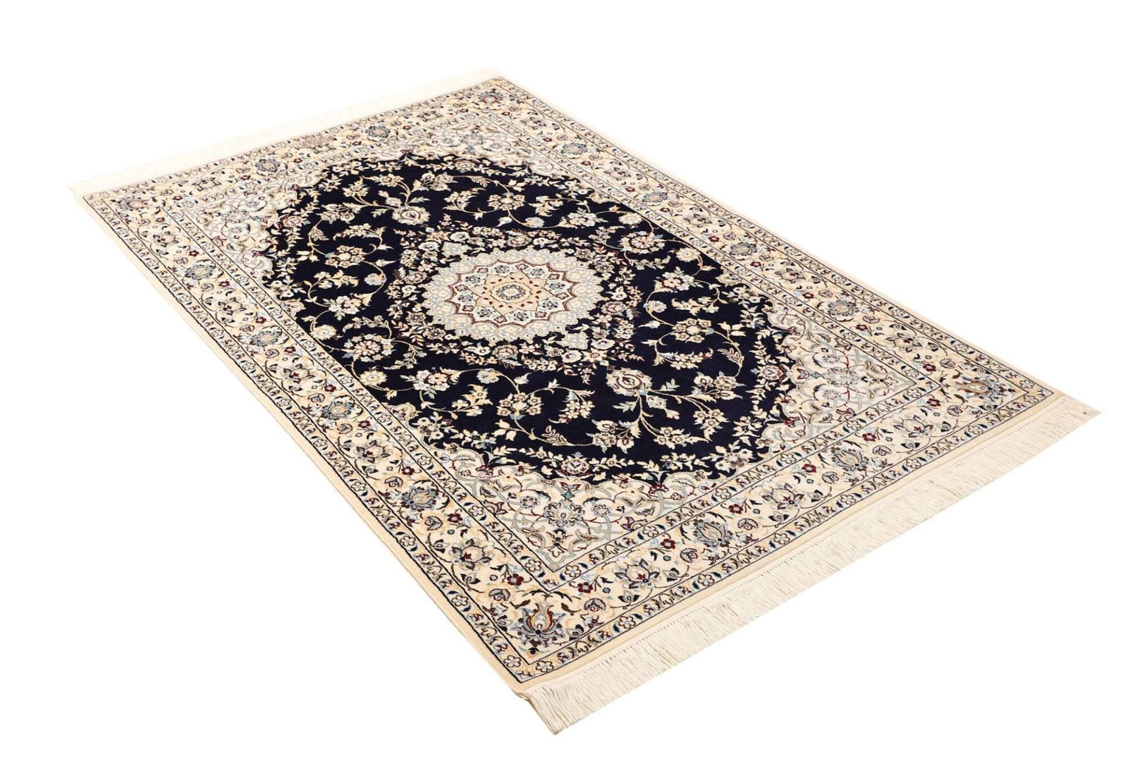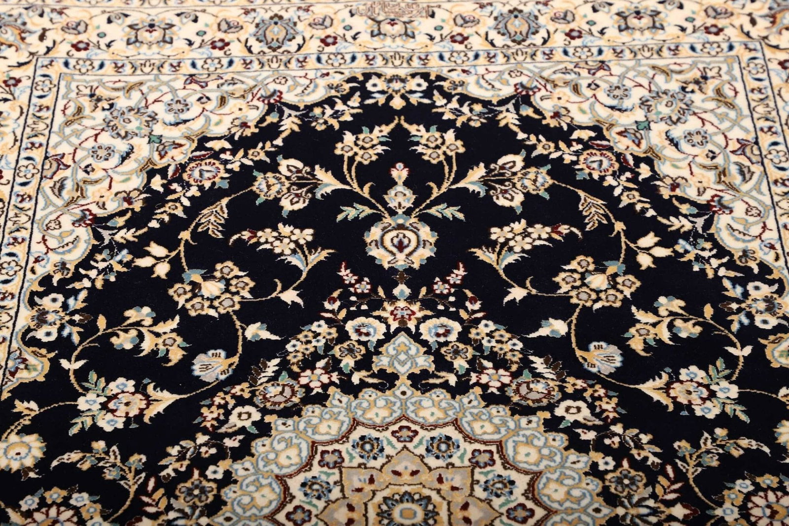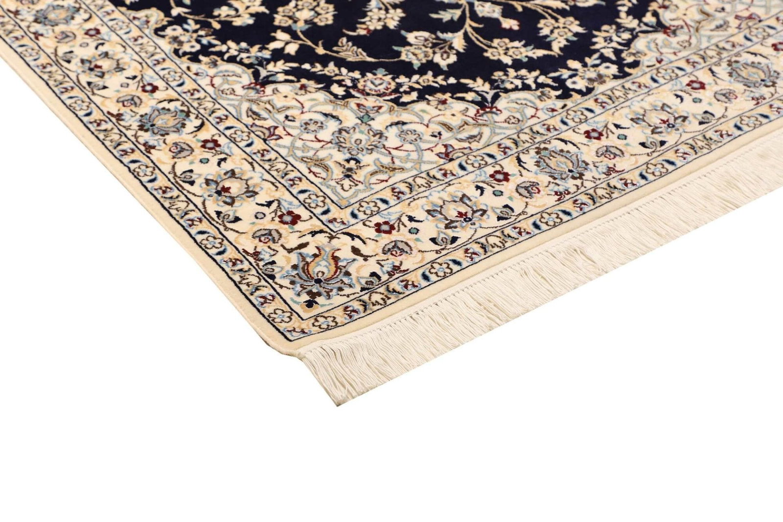 Unser Nain Teppich ist aus 100% Schurwolle hergestellt, einem Material, das für seine Langlebigkeit und seinen Komfort bekannt ist. Schurwolle ist nicht nur angenehm weich unter den Füßen, sondern bietet auch isolierende und schmutzabweisende Eigenschaften. Die handgeknüpfte Technik, mit der jeder Teppich individuell gefertigt wird, gewährleistet eine hohe Knotendichte und sorgt dafür, dass das florale Muster in leuchtenden, tiefen Farben zur Geltung kommt. Diese Technik ermöglicht es, selbst die kleinsten Details des Designs präzise auszuführen, was den Teppich zu einem Kunstwerk für Ihr Zuhause macht.