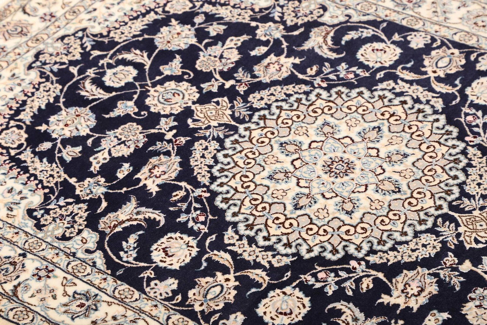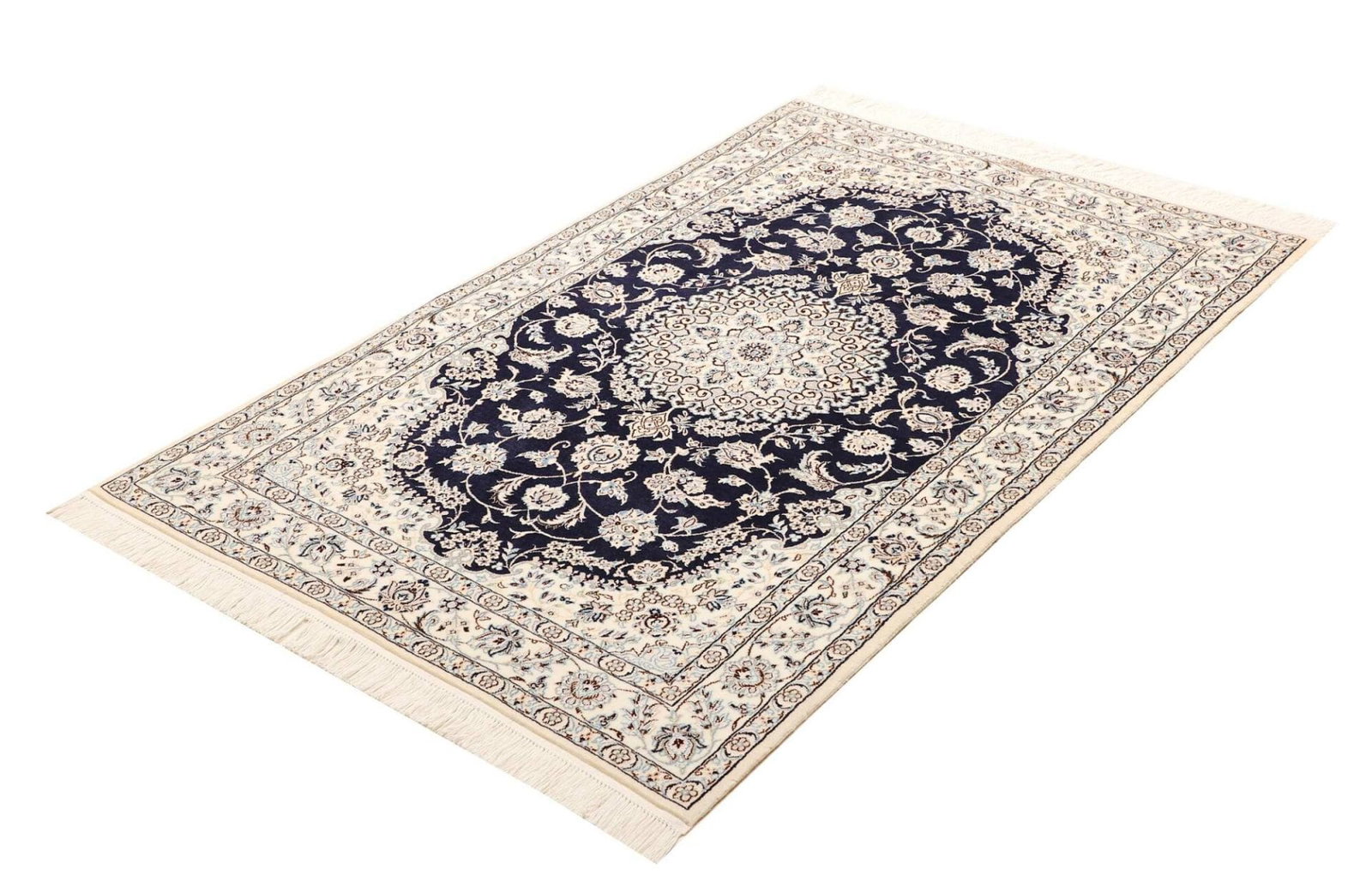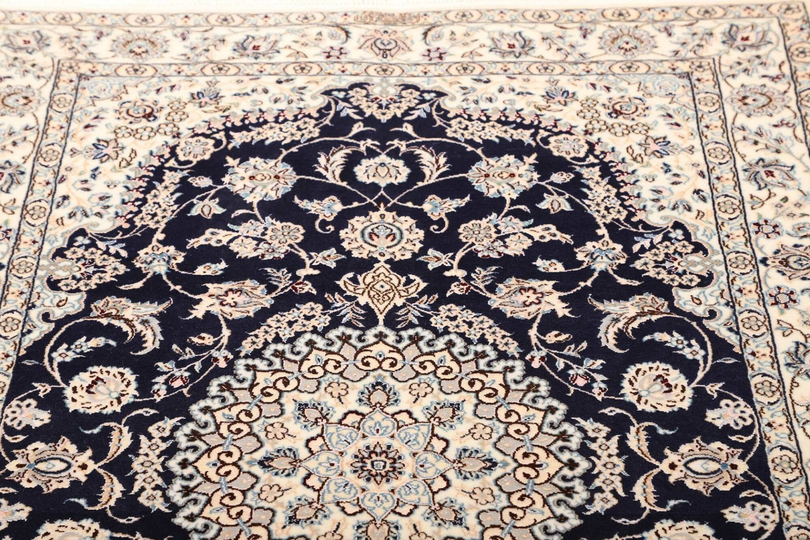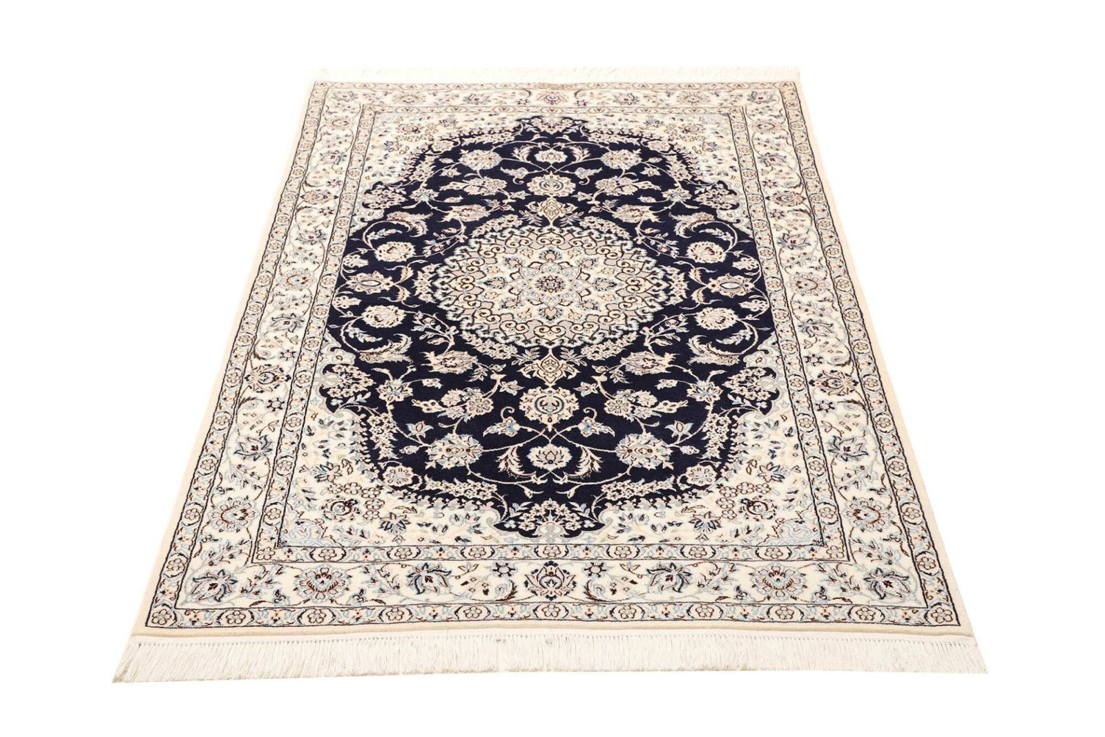 Nain Teppich | Knotendichte: ca. 900.000 Knoten/m² | Material: 100% Schurwolle (Flor), 100% Baumwolle (Kette) | Größe: 103 x 151 cm | Herkunft: Iran | Zustand: Exzellente handgeknüpfte Qualität | Muster: Klassische florale Motive mit königsblauem Akzent