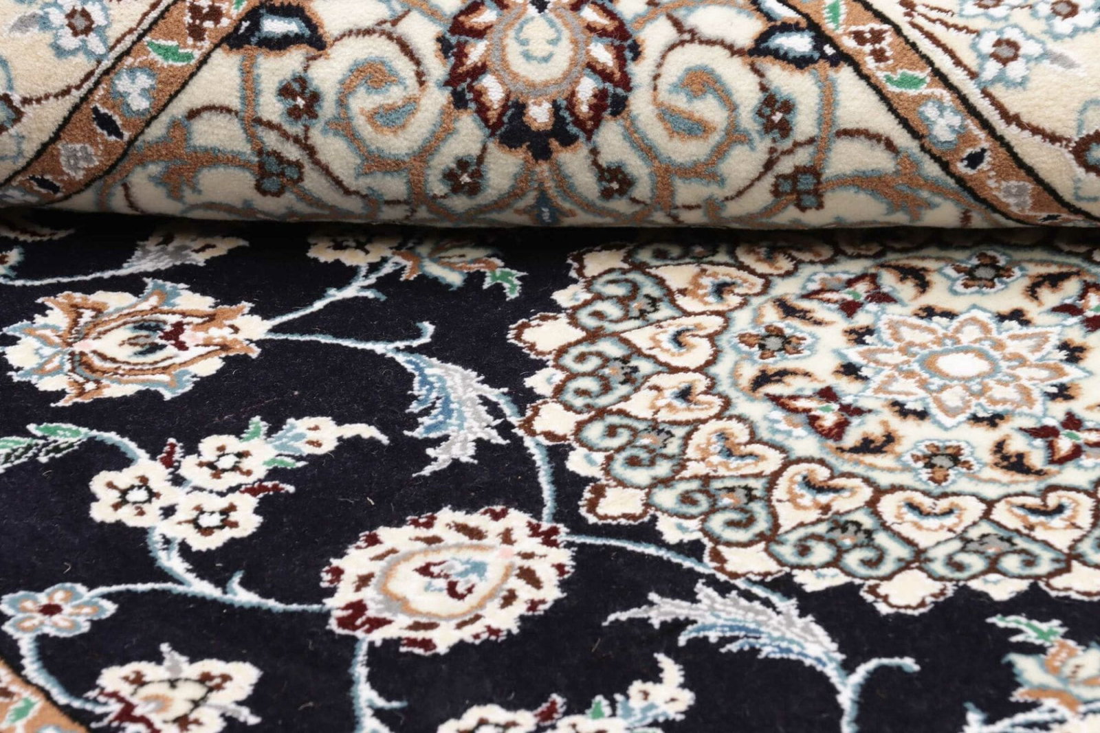 Die besonderen Eigenschaften dieses Teppichs beginnen bereits bei den verwendeten Materialien. Nain Teppiche sind traditionell aus hochwertiger Wolle und Seide gefertigt, was ihnen eine einzigartige Weichheit und einen luxuriösen Glanz verleiht. Die Wollbasis sorgt für Langlebigkeit und Strapazierfähigkeit, während die Seide in den Mustern eine atemberaubende Tiefe und Farbe erzeugt. Die Knotendichte, die bei Nain Teppichen in der Regel hoch ist, kann bis zu 400.000 Knoten pro Quadratmeter betragen. Dies bedeutet nicht nur eine außergewöhnliche Detailgenauigkeit in den Mustern, sondern auch eine bemerkenswerte Haltbarkeit und Widerstandsfähigkeit gegenüber Abnutzung.