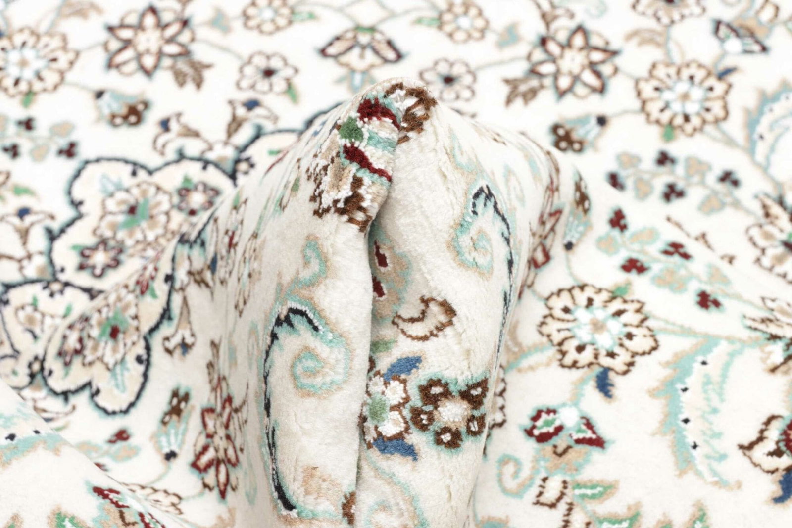 Der Nain Teppich wird aus feinen Wolle und Seide gefertigt, was ihm eine luxuriöse Textur und ein ansprechendes Erscheinungsbild verleiht. Die Kombination dieser Materialien steht für Qualität und Langlebigkeit und sorgt dafür, dass der Teppich auch unter intensiver Nutzung seine Schönheit behält. Handgeknüpft mit höchster Präzision, zeigt dieser Teppich eine beachtliche Knotendichte, die für die Detailverliebtheit und das Können der Teppichknüpfer spricht. Jeder Knoten ist mit Sorgfalt gesetzt, was nicht nur die Stabilität, sondern auch die Feinheit des Designs unterstreicht.