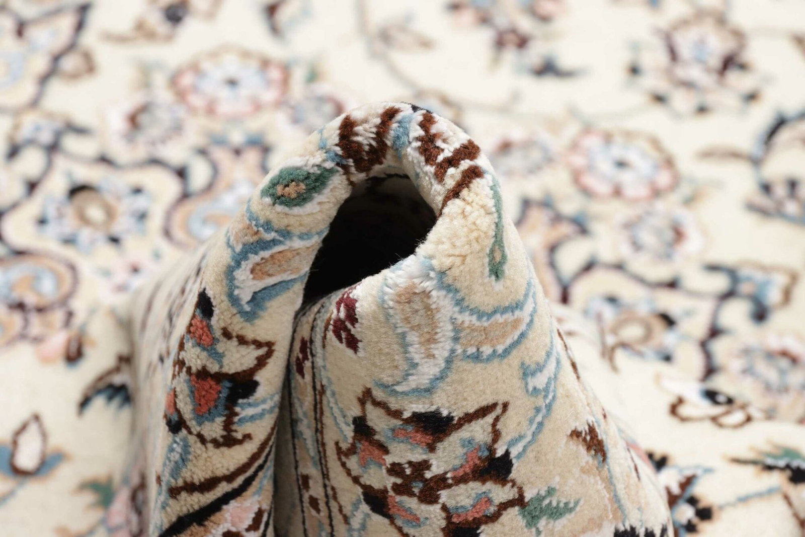 Das florale Muster des Nain Teppichs ist charakteristisch für die Tradition dieser Region. Oft finden sich darin stilisierte Blumen, Blätter und andere ornamentale Elemente, die mit großer Sorgfalt und Detailreichtum ausgearbeitet sind. Die Farbauswahl reicht von sanften Erdtönen bis hin zu lebhaften Farben, die harmonisch miteinander kombiniert werden und dem Raum eine frische Ausstrahlung verleihen. Durch das florale Design entsteht ein Gefühl von Naturverbundenheit und Ruhe, was den Teppich besonders attraktiv für Wohn- und Schlafräume macht.