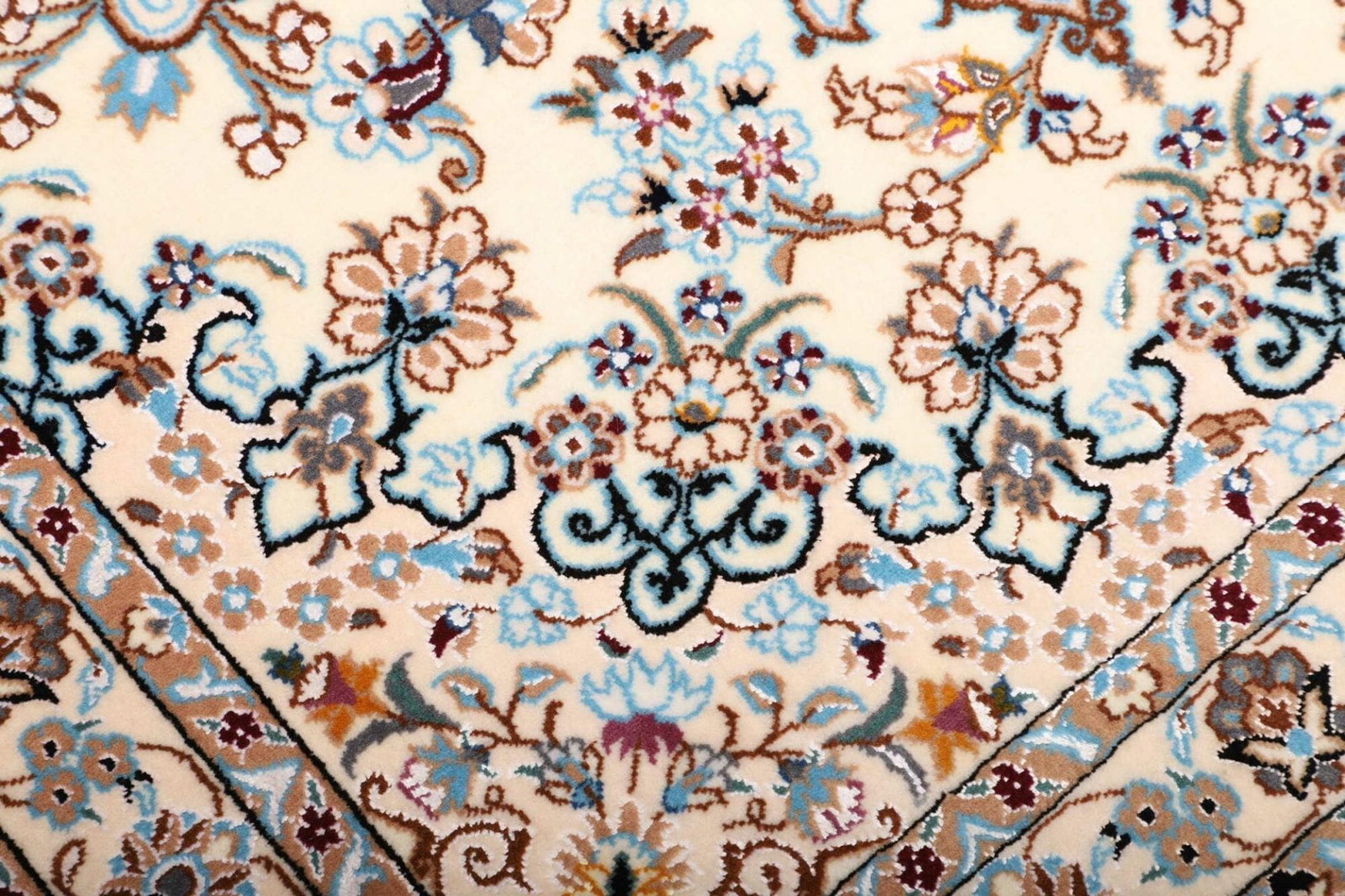Das florale Design des Nain Teppichs ist nicht nur optisch ansprechend, sondern auch tief in der kulturellen Symbolik verwurzelt. Blumige Elemente und stilisierte Pflanzenmotive sind in der persischen Teppichkunst sehr beliebt und repräsentieren Schönheit und Natur. Je nach den verwendeten Farben können die Designs von zarten, pastellfarbenen Nuancen bis hin zu kräftigen, lebhaften Tönen variieren, die jedem Raum eine individuelle Note verleihen.
