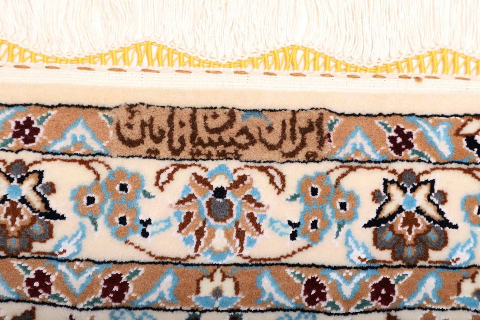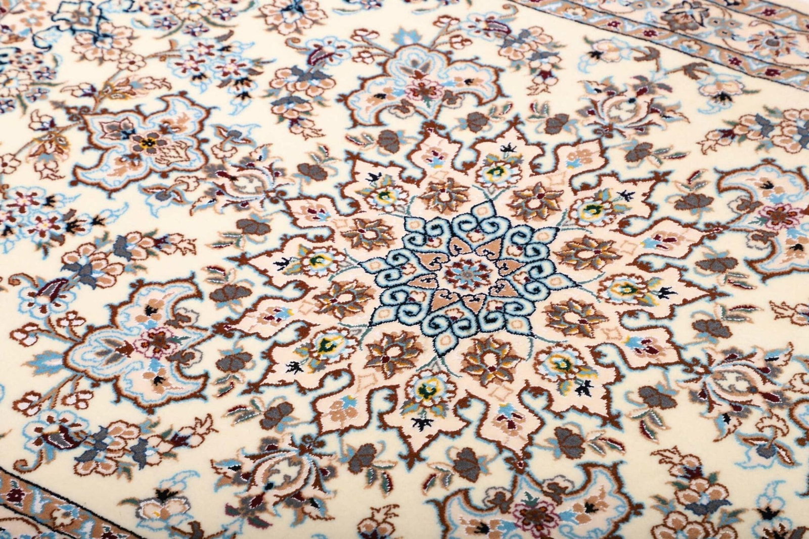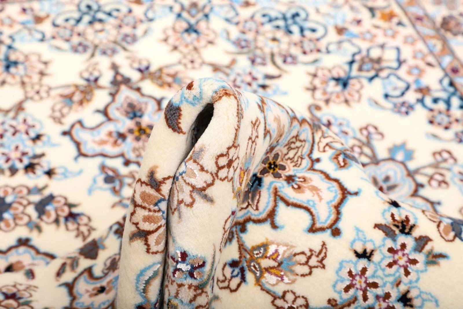 Die Knotendichte eines Teppichs ist ein entscheidendes Merkmal, das seine Haltbarkeit und Detailtreue bestimmt. Ein hoher Knotendichte bei diesem Nain Teppich gewährleistet, dass die feinen Muster und floralen Designs auch bei näherem Hinsehen beeindruckend klar und detailliert erscheinen. Die Knüpftechnik ist handgeknüpft, was bedeutet, dass jeder Teppich eine Vielzahl von Stunden an sorgfältiger Handarbeit erfordert, um ein einzigartiges Kunstwerk zu schaffen.