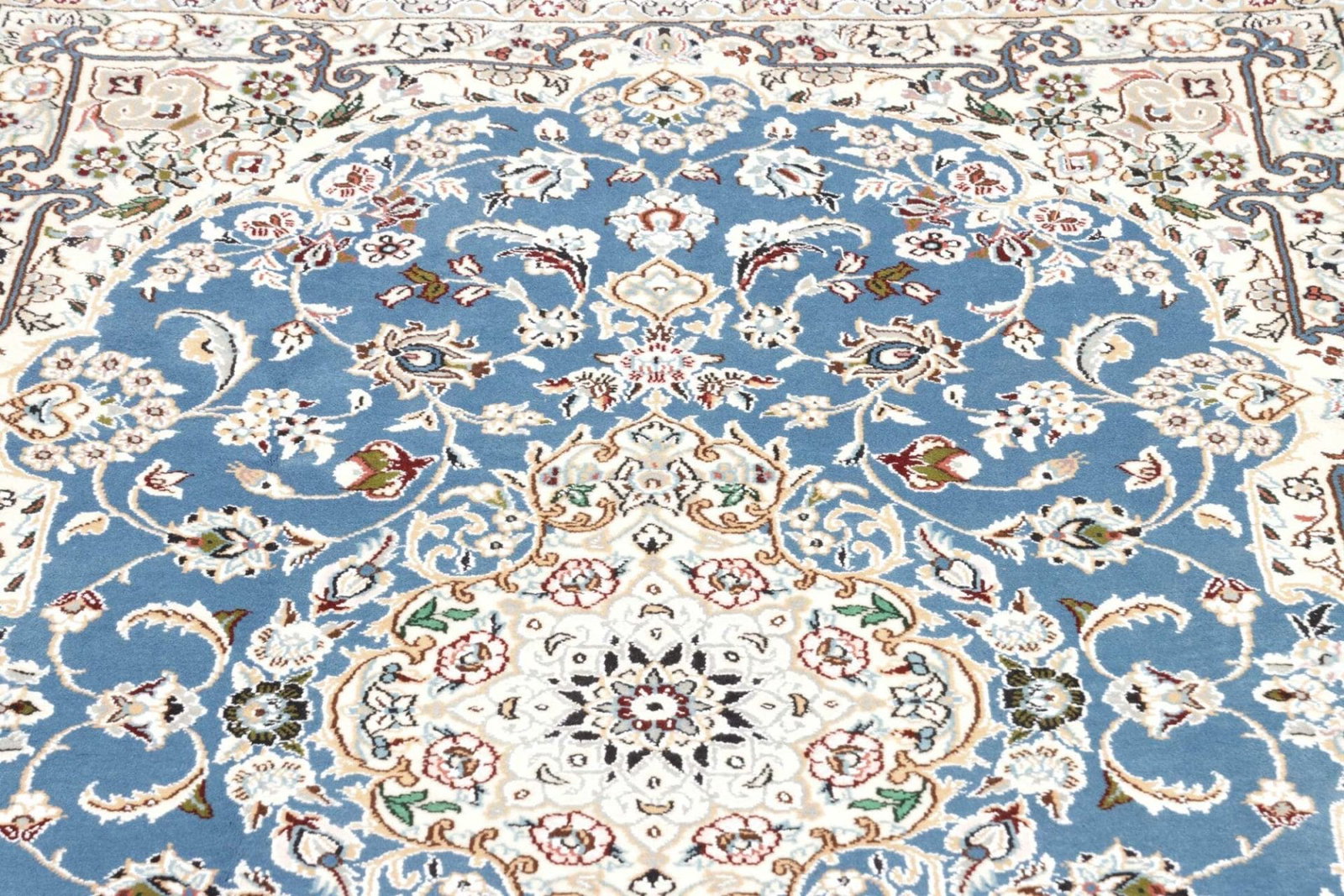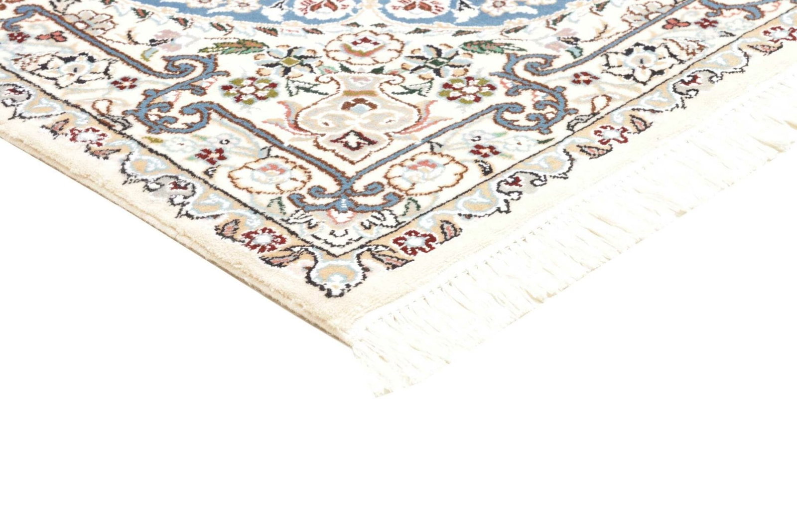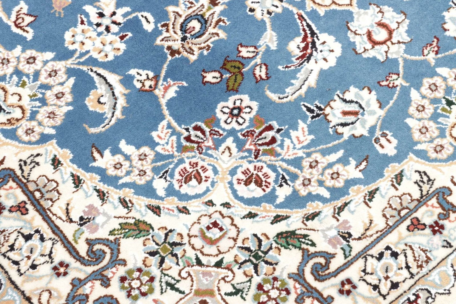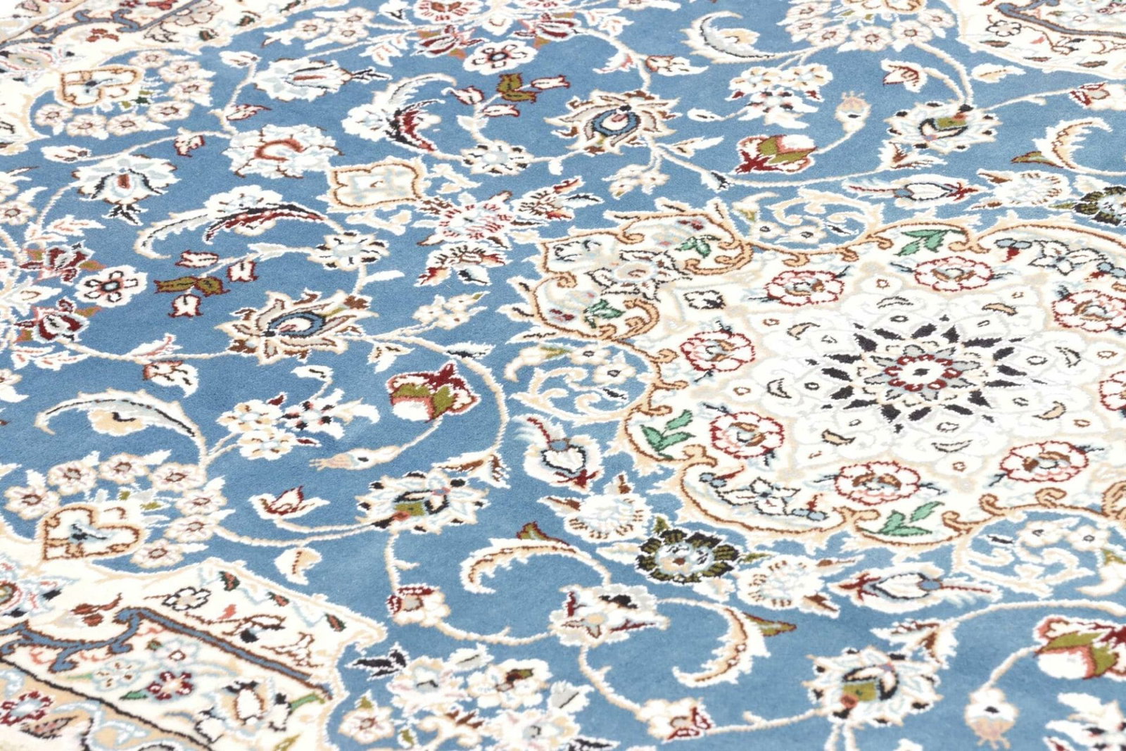 Das florale Muster dieses Nain Teppichs ist ein bemerkenswertes Beispiel für die kreative Visionskraft der Teppichdesigner. Es zeigt eine harmonische Komposition aus Blumen und Ranken, die dem Teppich eine lebendige und einladende Ausstrahlung verleihen. Farben wie beruhigendes Blau, warmes Beige und sanfte Erdtöne dominieren das Design und machen es zu einem vielseitigen Stück, das sich nahtlos in unterschiedliche Einrichtungsstile integriert.