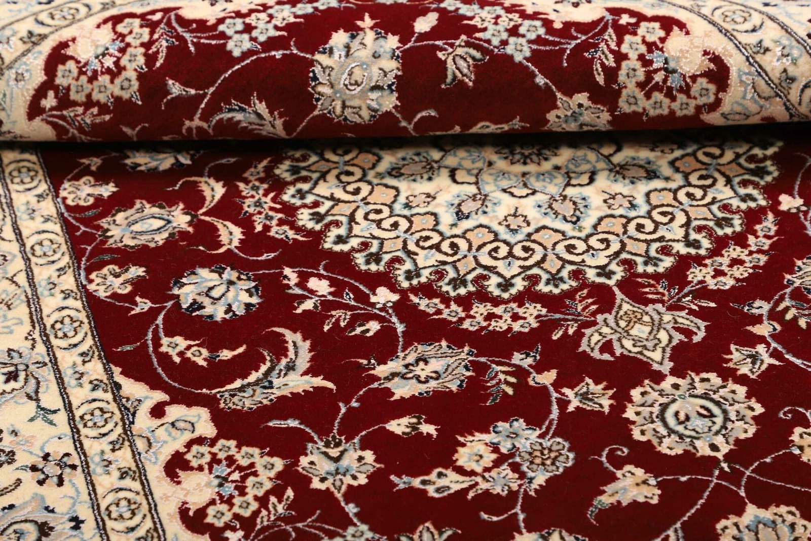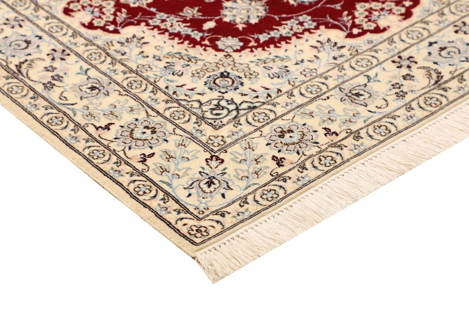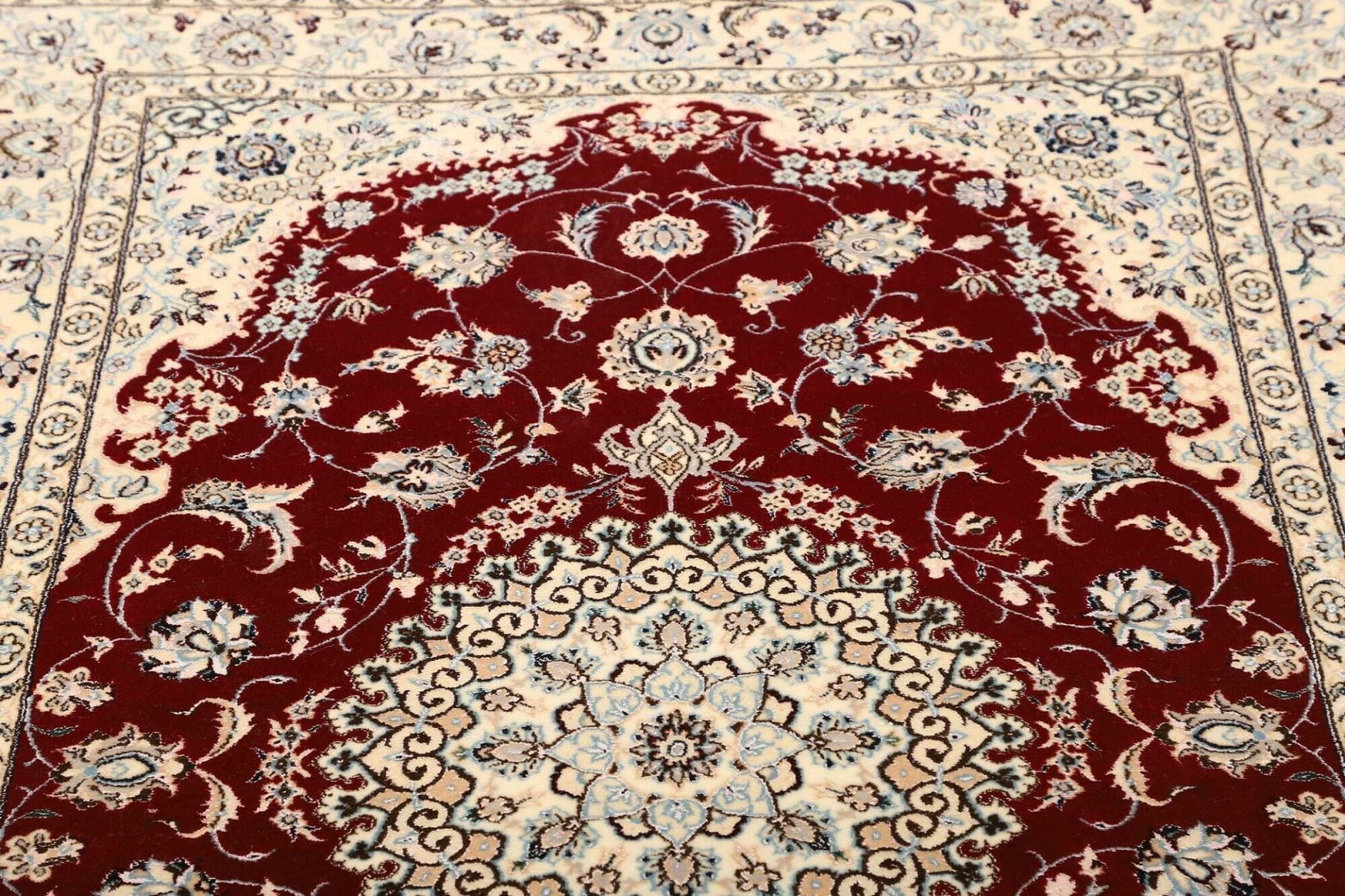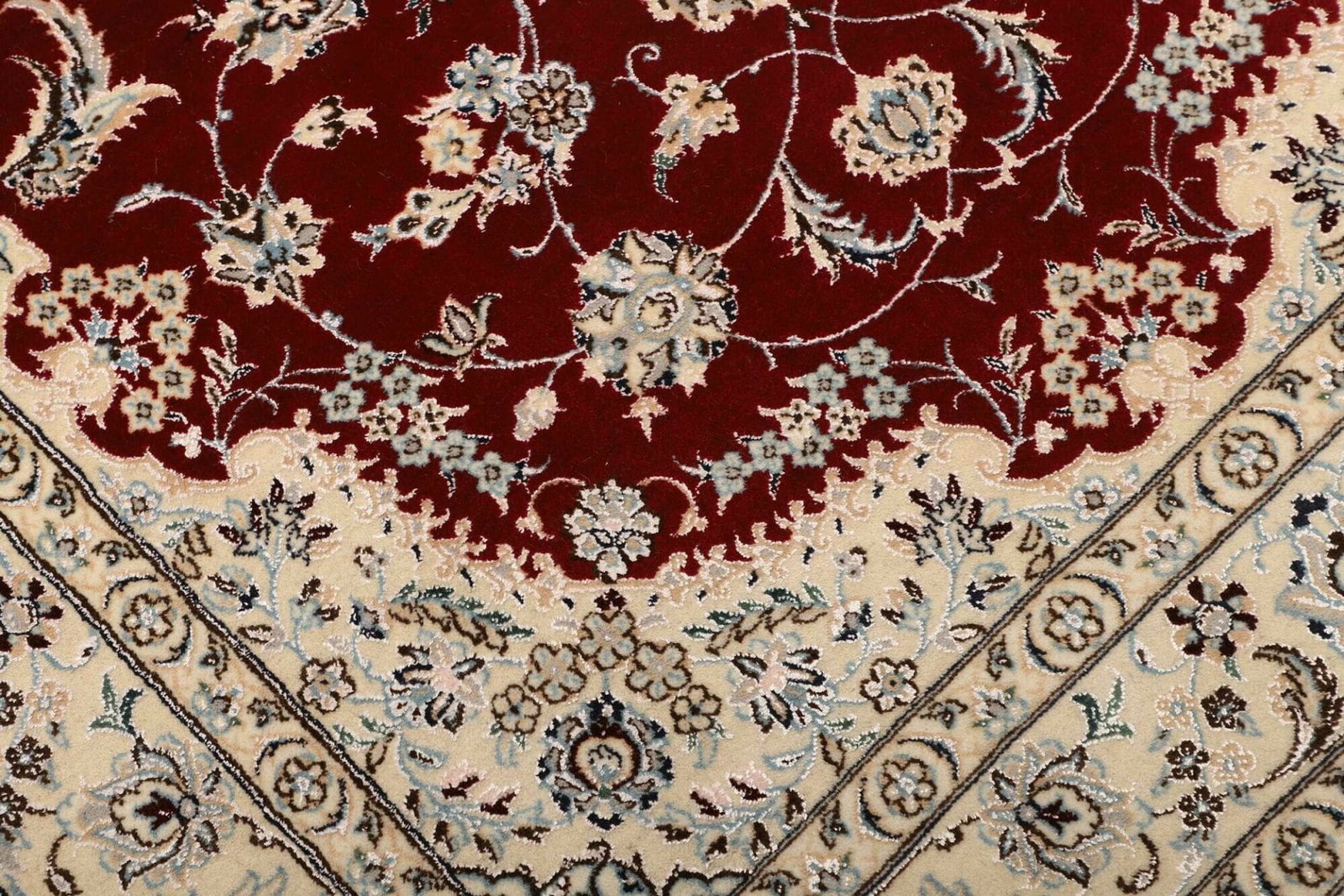 Dieser Teppich ist aus hochwertigen Materialien gefertigt, die ihm eine besondere Langlebigkeit und Strapazierfähigkeit verleihen. Bei der Herstellung von Nain-Teppichen spielen Wolle und Seide eine zentrale Rolle. Die Hauptmasse besteht in der Regel aus feiner Wolle, die für ihre Robustheit und ihren weichen Griff bekannt ist. Um den Teppich noch luxuriöser zu gestalten, werden häufig auch Seidenfäden verwendet, die den floralen Motiven einen sanften Glanz verleihen und sie hervorheben. Die Knotentechnik, die bei der Fertigung zum Einsatz kommt, macht den Teppich besonders dicht und sorgt dafür, dass die kunstvollen Designs über Jahre hinweg ihre Farbbrillanz und Form behalten.