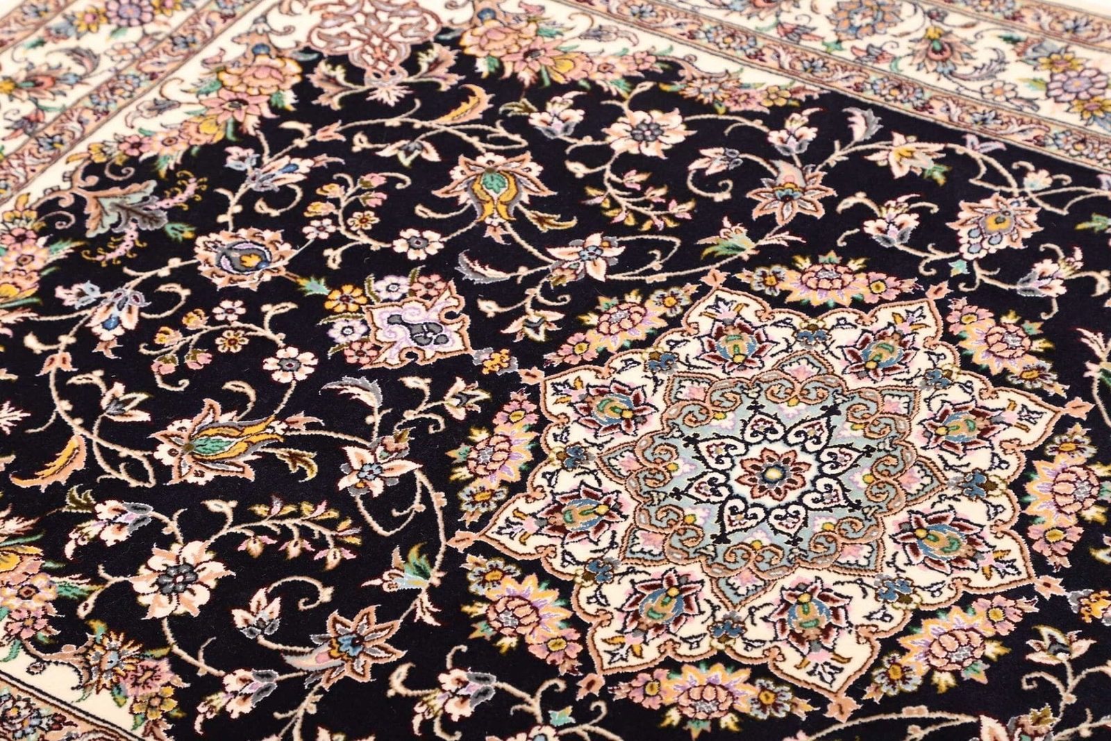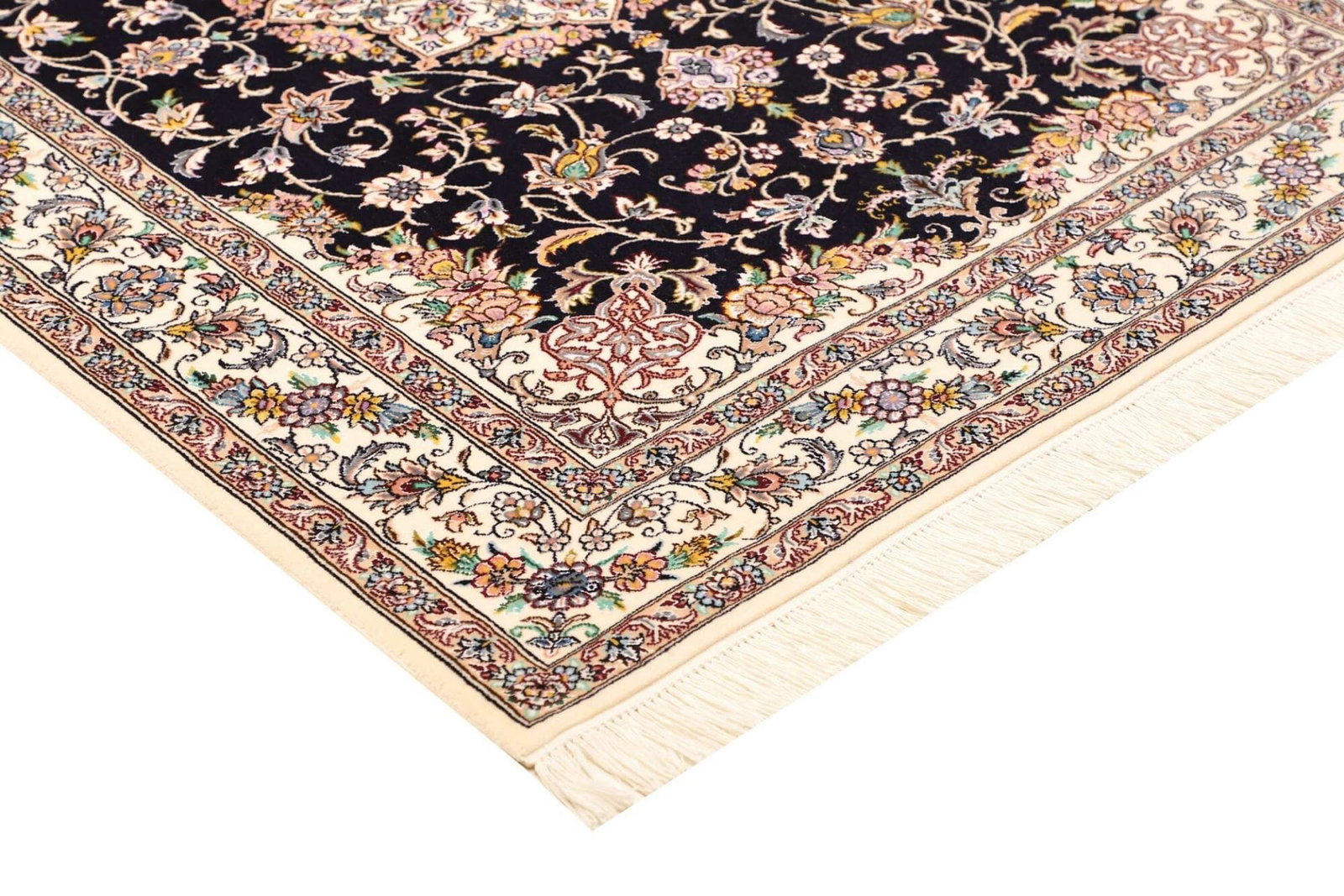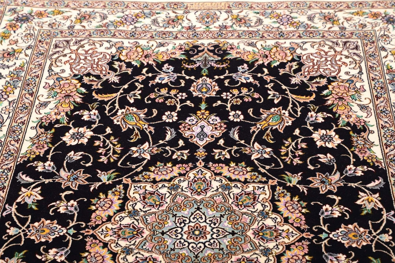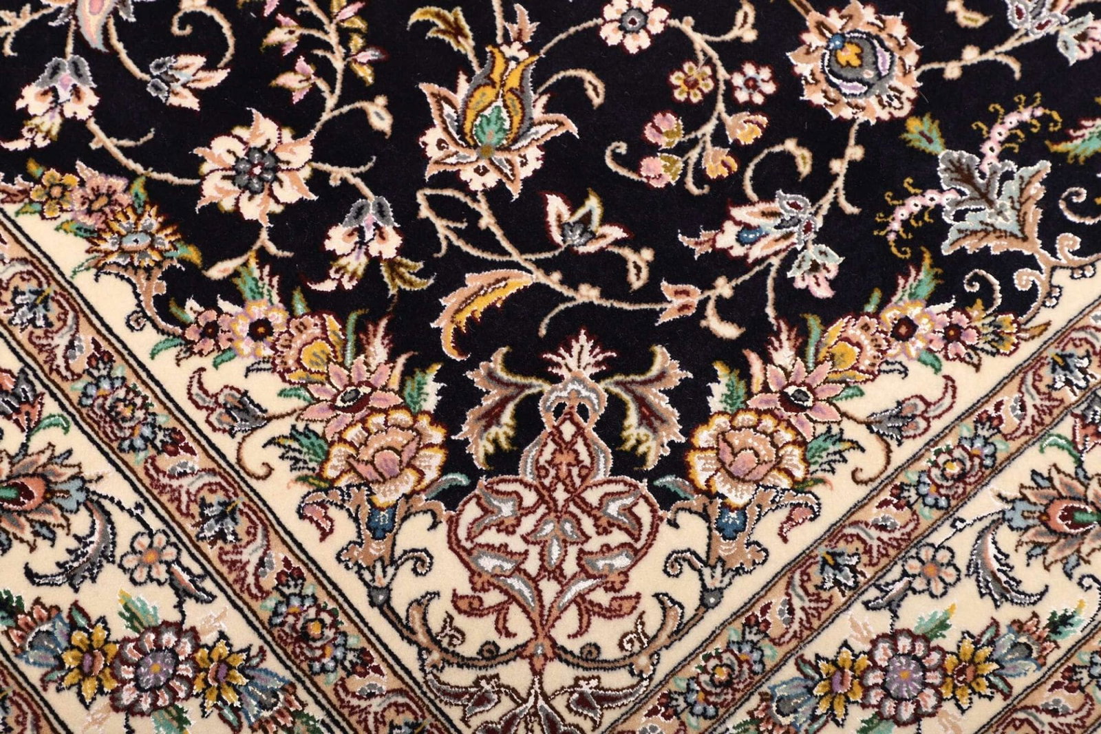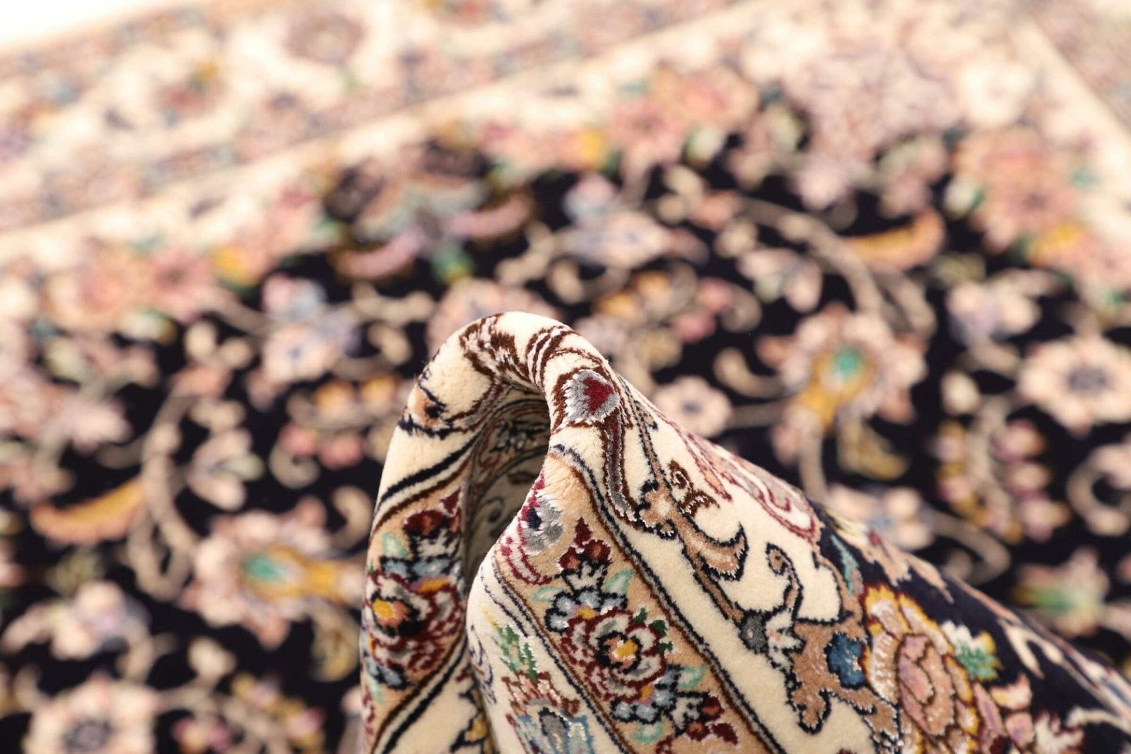 Der Nain Teppich ist aus edlen Materialien gefertigt, die sowohl langlebig als auch ansprechend sind. Die Knotendichte ist ein entscheidendes Merkmal, das auf die Qualität eines handgeknüpften Teppichs hinweist. Je höher die Knotendichte, desto feiner und detaillierter erscheint das Muster. In diesem Fall ist die Knotendichte besonders hoch, was für die bemerkenswerte Detailtreue der floralen Motive spricht. Bei der Herstellung werden in der Regel Schafswolle und Seide verwendet, was dem Teppich eine weiche Haptik und gleichzeitig eine beeindruckende Farbbrillanz verleiht.