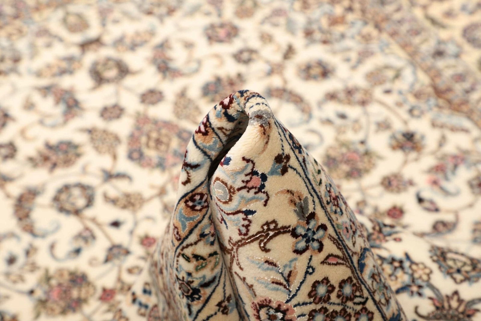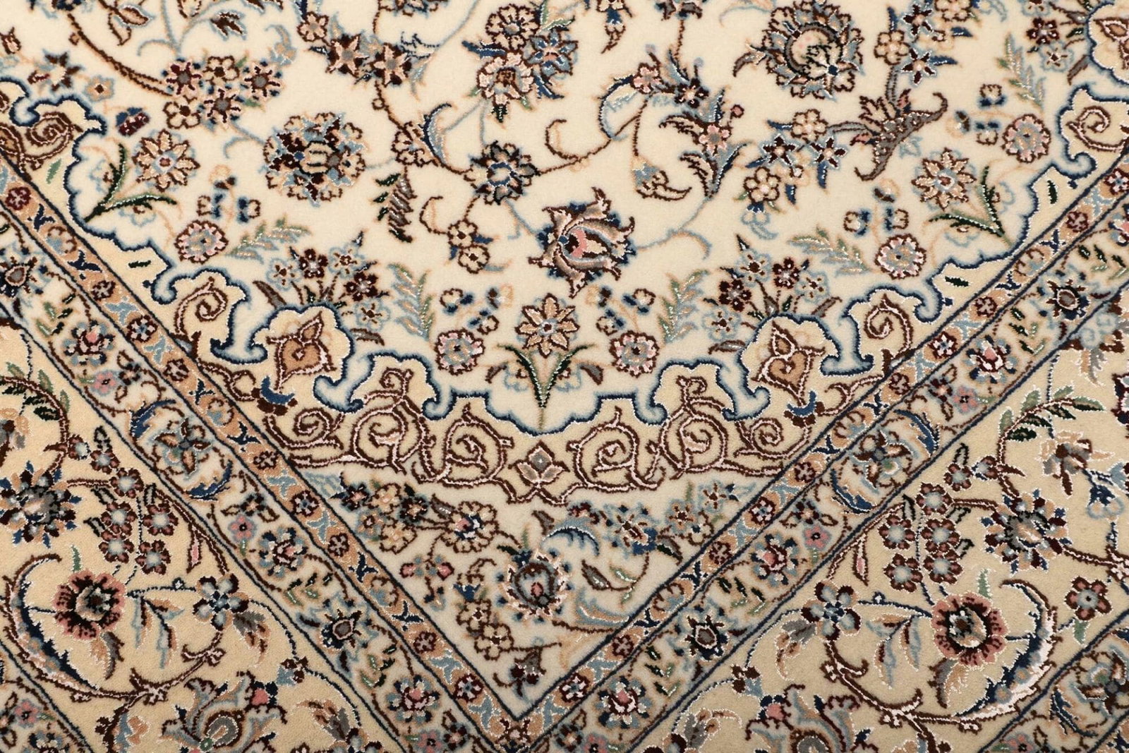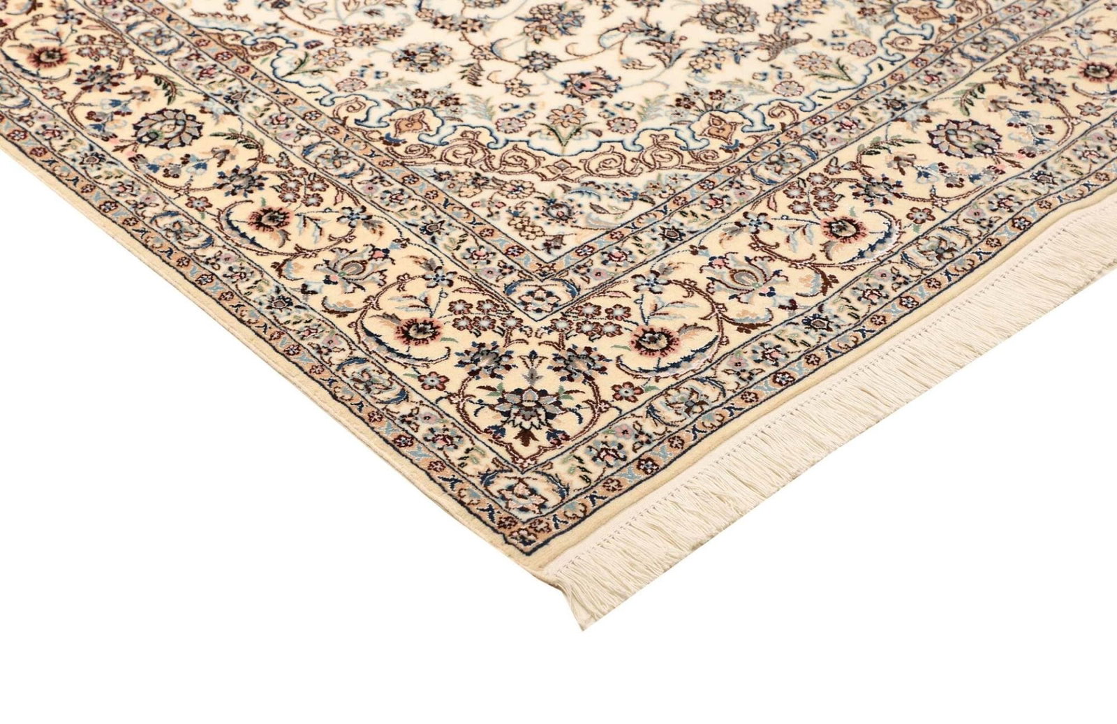 Das florale Muster des Nain Teppichs besticht durch seine harmonischen Farbkombinationen und filigranen Motive. Die Verwendung klassischer Blumen- und Pflanzenmotive spiegelt die reiche Symbolik der persischen Kultur wider, in der Blumen oft für Schönheit und Lebensfreude stehen. Die kunstvollen Muster werden durch die Kombination warmer und kühler Farbtöne, wie Creme, Blau und Gold, lebendig und schaffen eine einladende Atmosphäre. Jedes Element des Designs erzählt eine Geschichte und trägt zur einzigartigen Identität des Teppichs bei.