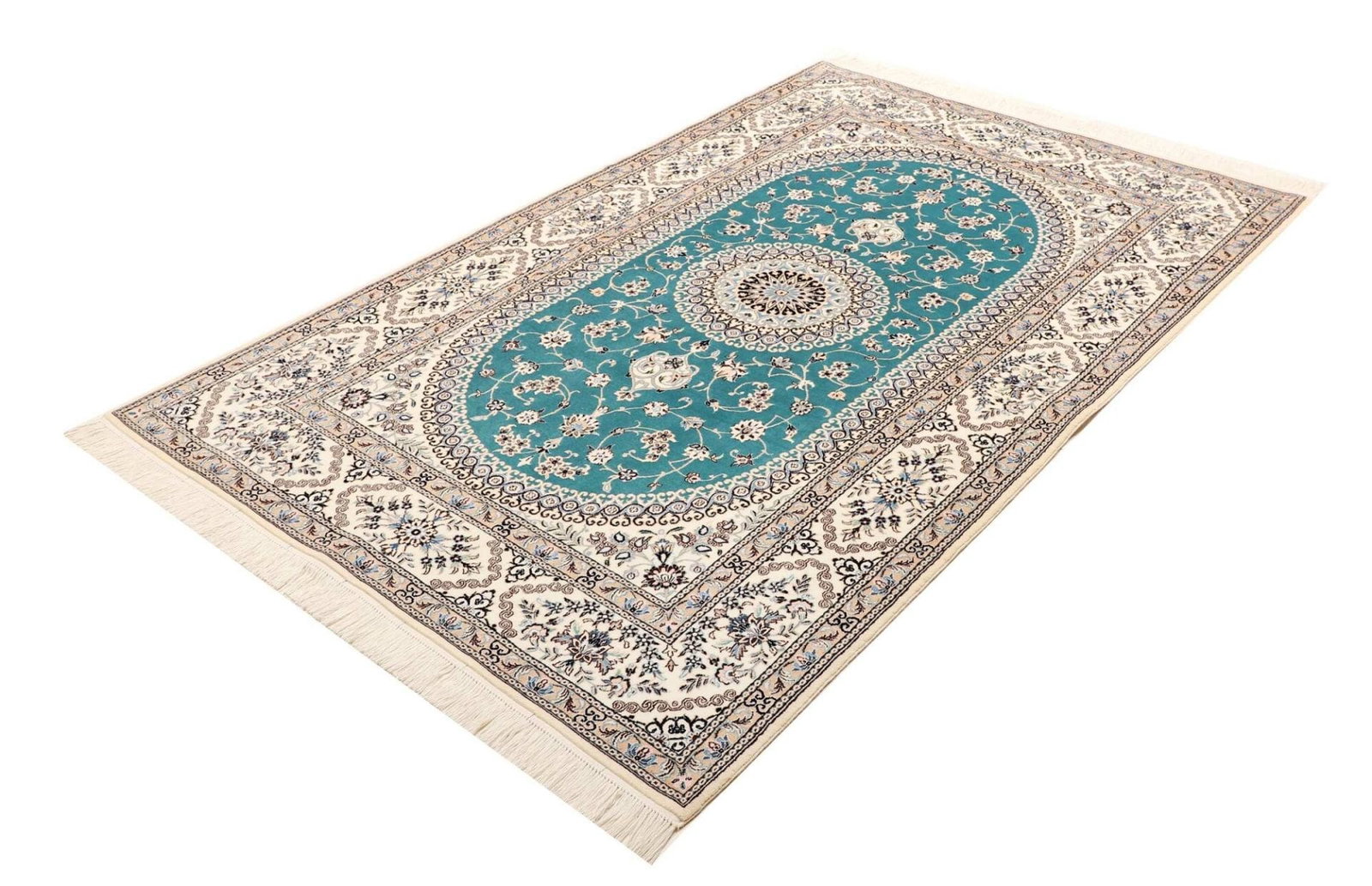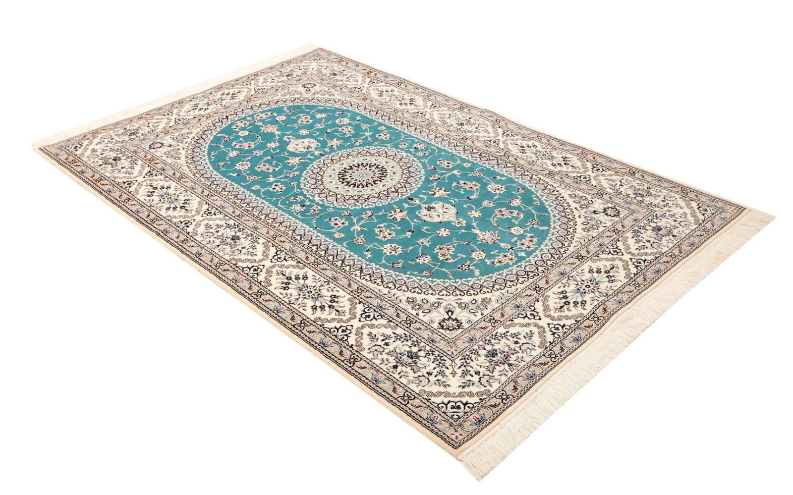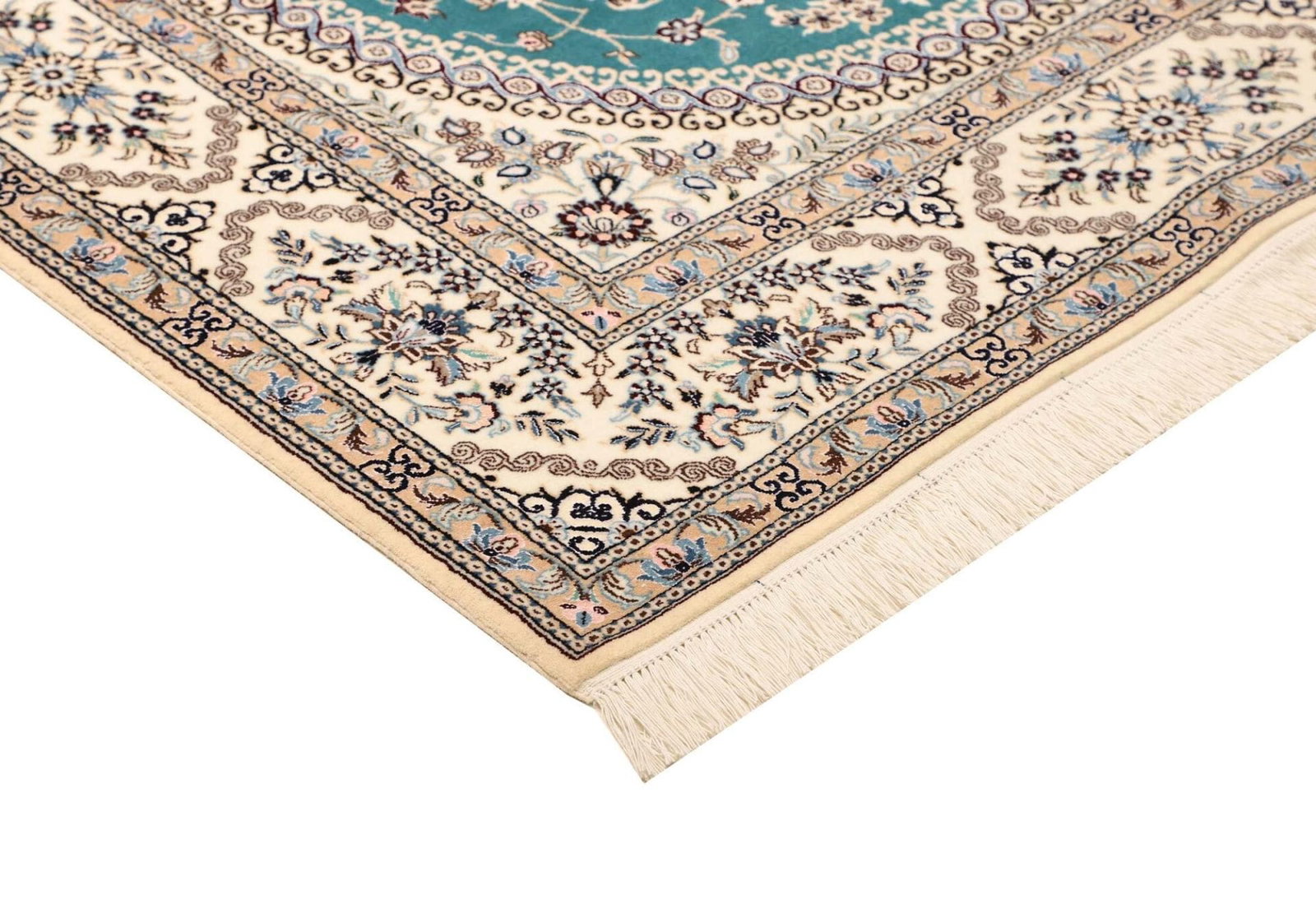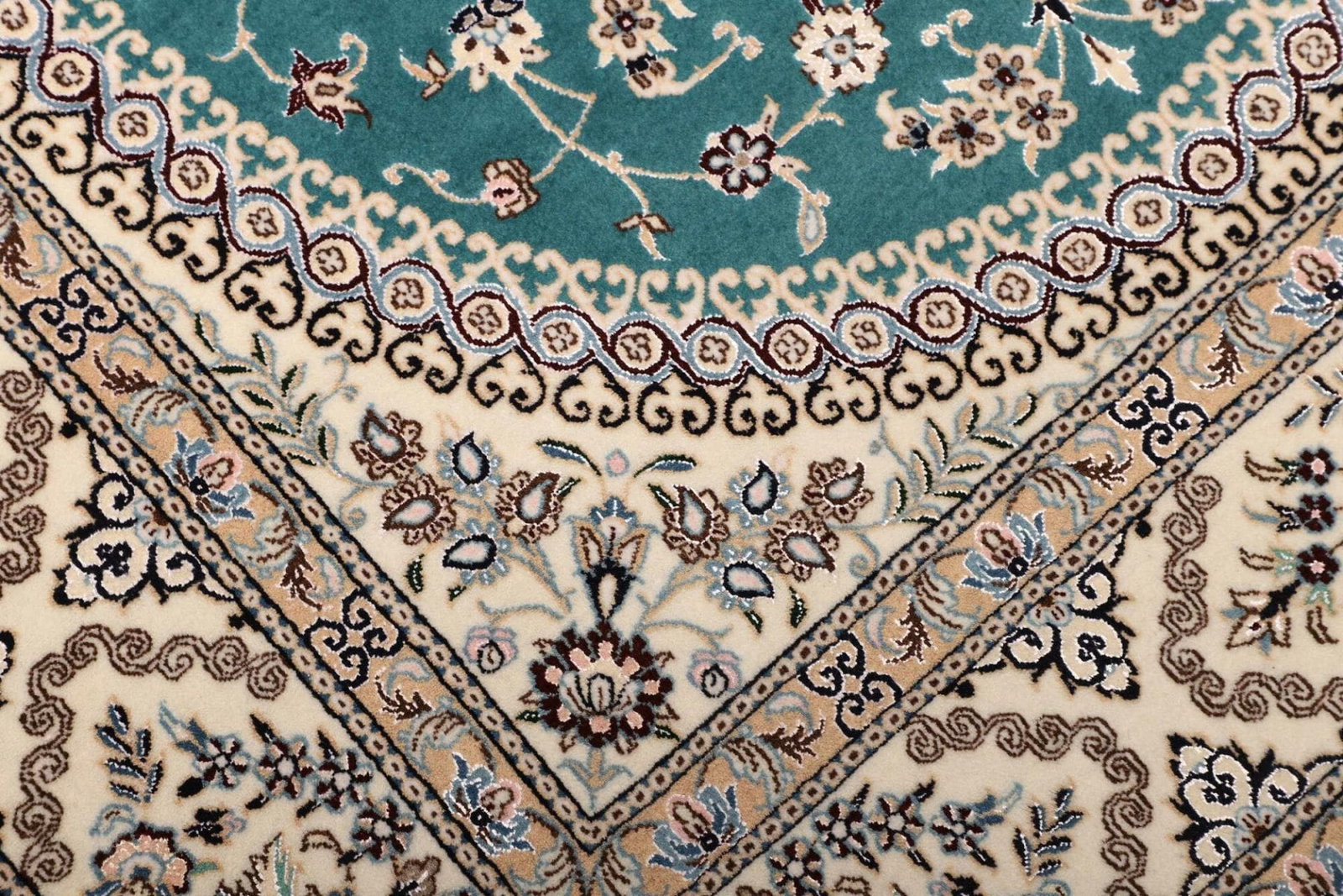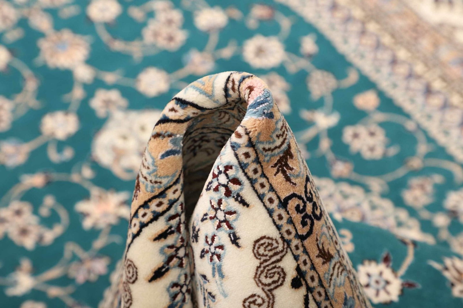 Der Nain Teppich ist aus reiner Schurwolle gefertigt, die für ihre Weichheit und Strapazierfähigkeit bekannt ist. Schurwolle besitzt natürliche Eigenschaften, die den Teppich nicht nur langlebig, sondern auch pflegeleicht machen. Zudem ist Wolle ein hervorragender Isolator, was bedeutet, dass dieser Teppich nicht nur optisch, sondern auch funktional einen Mehrwert bietet. Die handgeknüpfte Technik garantiert eine hohe Knotendichte, die sich in der Detailgenauigkeit der floralen Muster zeigt. Diese feine Knüpfkunst ist ein Zeichen für die hohe Qualität und die Kunstfertigkeit, die in jeden Nain Teppich einfließen.