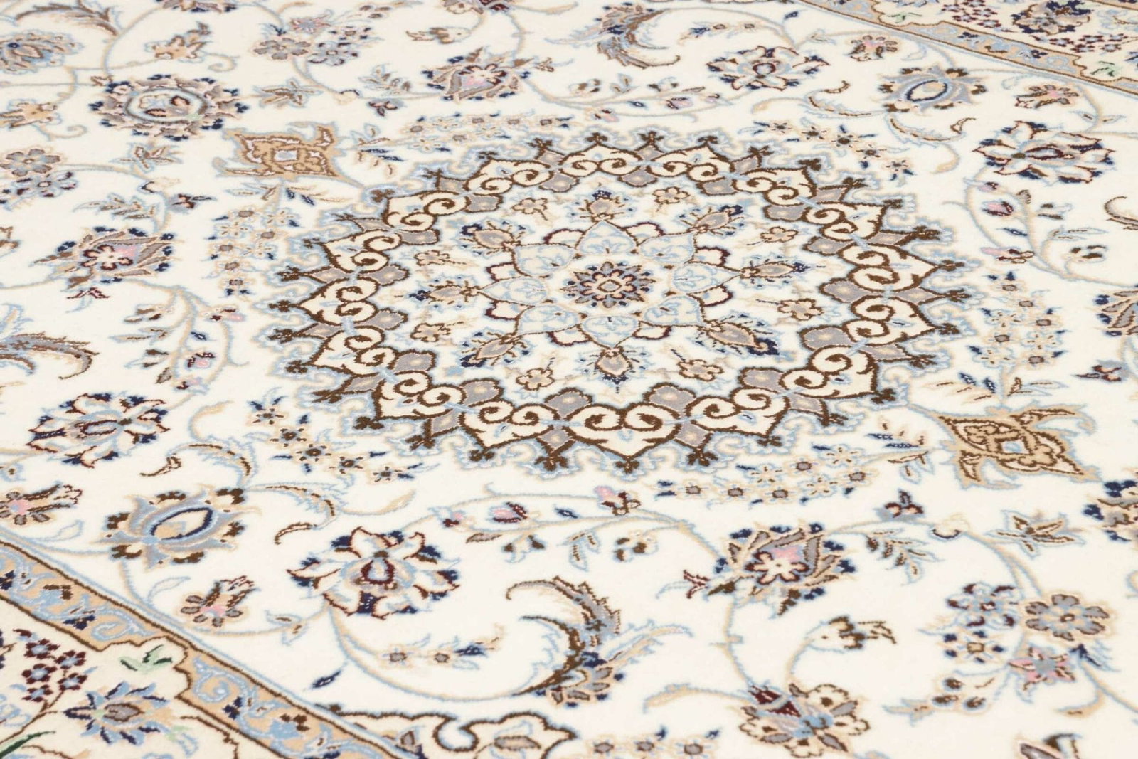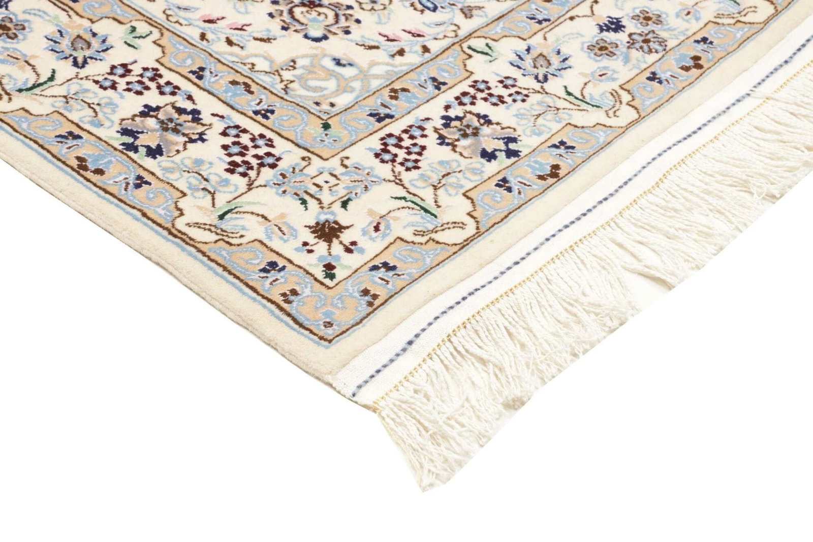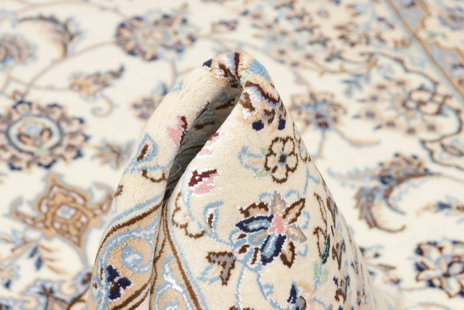 Die floralen Muster des Nain Teppichs sind nicht nur schön anzusehen, sondern haben auch eine tiefere symbolische Bedeutung. Oft repräsentieren sie den Garten des Paradieses, ein zentrales Motiv in der islamischen Kunst. Die Details der Muster, die zarte Farbauswahl und die geschickte Platzierung der designten Elemente schaffen ein harmonisches Gesamtbild. Jeder Teppich erzählt seine eigene Geschichte und spiegelt die kulturellen Einflüsse wider, die über Jahrhunderte in das Handwerk eingeflossen sind.