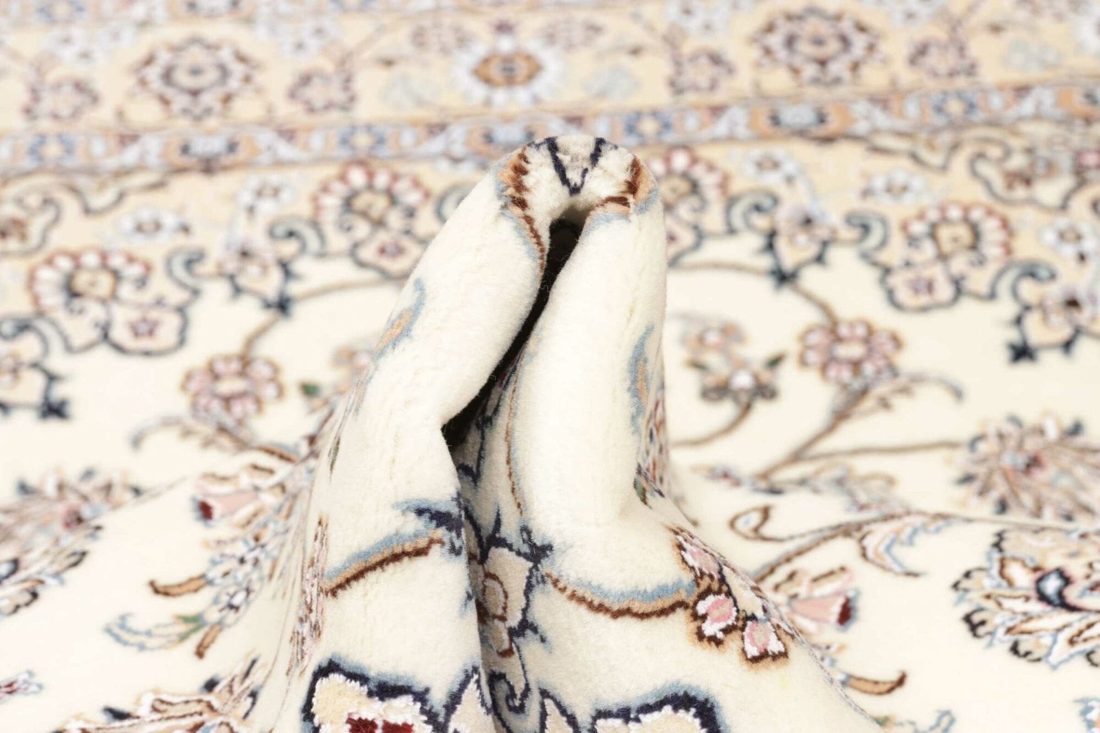 Der Nain Teppich besteht aus feinstem Wolle und Seide, was ihm nicht nur ein luxuriöses Aussehen, sondern auch eine unvergleichliche Weichheit und Langlebigkeit verleiht. Die verwendeten Materialien sind nicht nur gegen Abnutzung resistent, sondern bieten auch einen besonderen Komfort unter den Füßen. Die Struktur eines handgeknüpften Teppichs sorgt dafür, dass er nicht nur schön aussieht, sondern auch robust ist und viele Jahre Freude bereitet. Die Knotendichte dieses Teppichs ist sehr hoch, was für eine feinere Detailverarbeitung sorgt und die Beständigkeit erhöht.