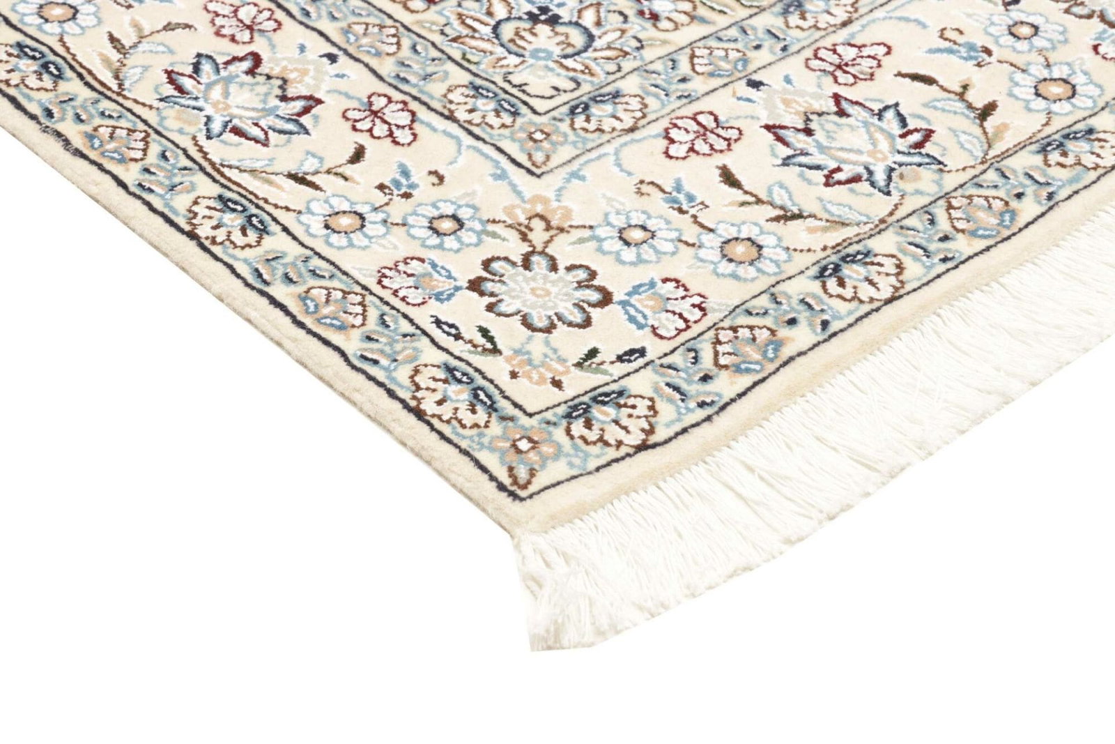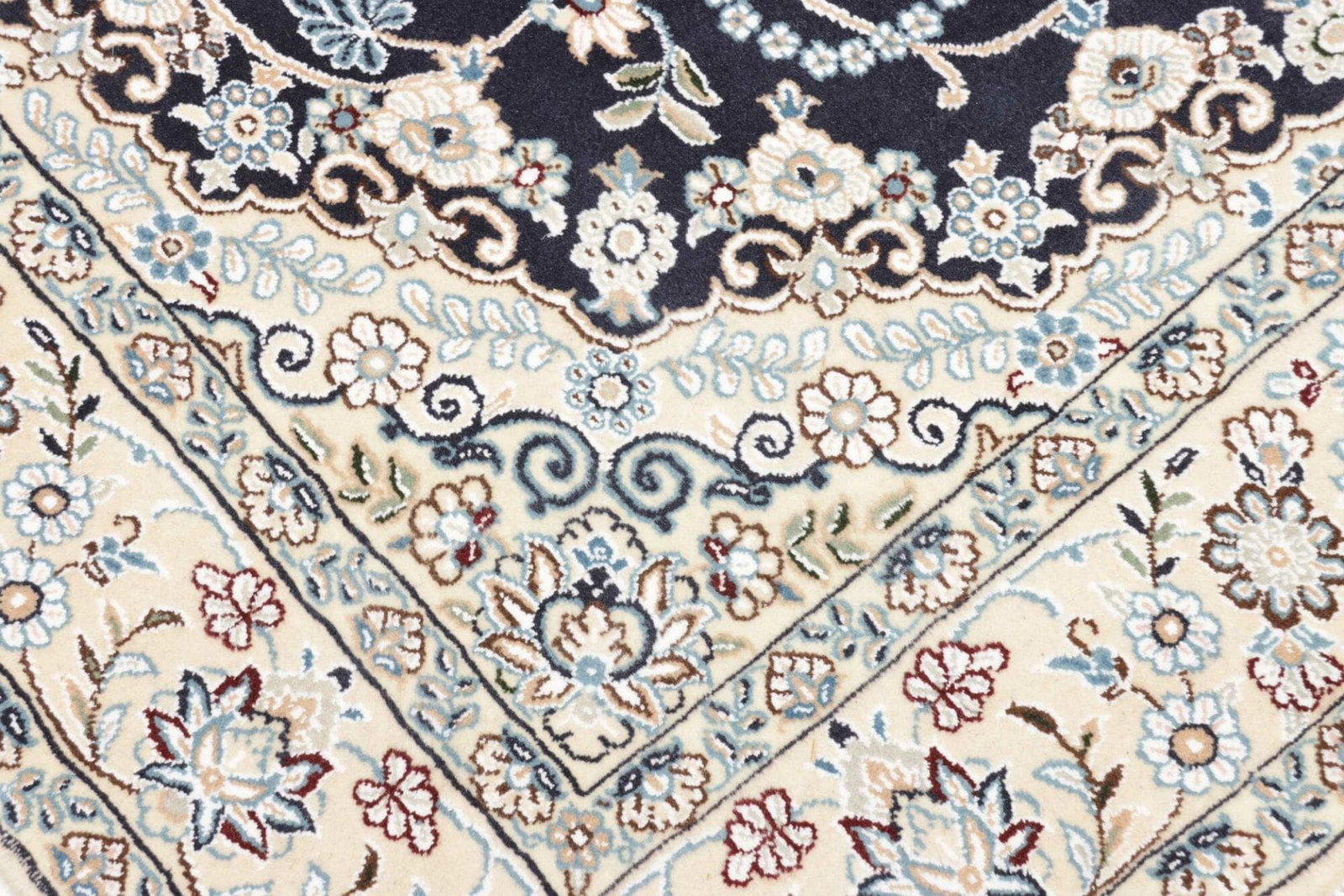 Der florale Charakter dieses Teppichs ist typisch für die Designs aus Nain und spiegelt die Schönheit der Natur wider. Die verschiedenen Muster variieren von stilisierten Blumen und blühenden Bäumen bis hin zu geometrischen Formen, die kunstvoll in Szene gesetzt werden. Diese floralen Motive symbolisieren Fülle und Wachstum und sind ein Ausdruck des persischen Gärtners, der die Harmonie zwischen Mensch und Natur sucht.