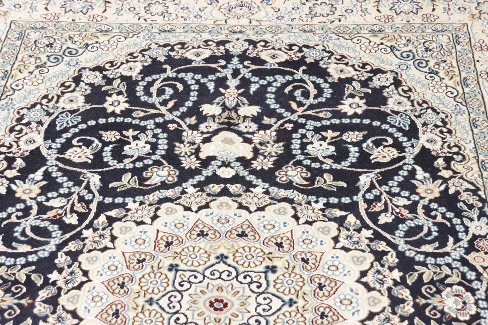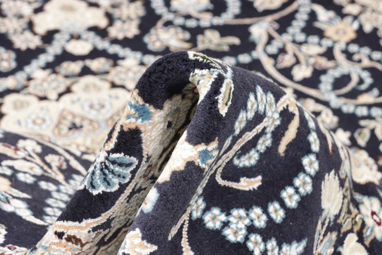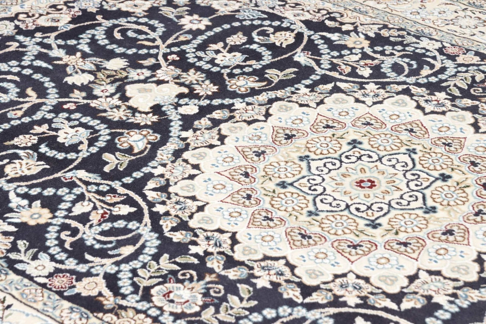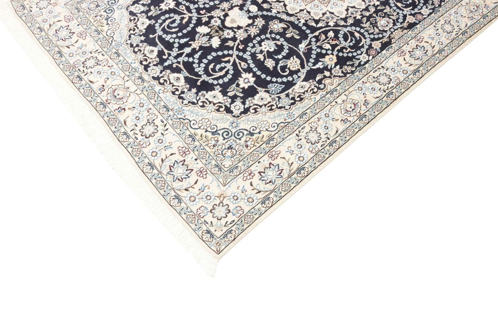 Die handgeknüpfte Technik ist ein Zeichen für die hohe Handwerkskunst, die in jedem Nain Teppich steckt. Mit einer hohen Knotendichte bietet der Teppich nicht nur eine dichte und samtige Oberfläche, sondern auch eine außergewöhnliche Detailtreue in den Mustern. Diese Knotendichte reicht tief in die Tradition der persischen Teppichknüpferei zurück und unterstreicht die Bedeutung dieser Kunstform in der Region.
