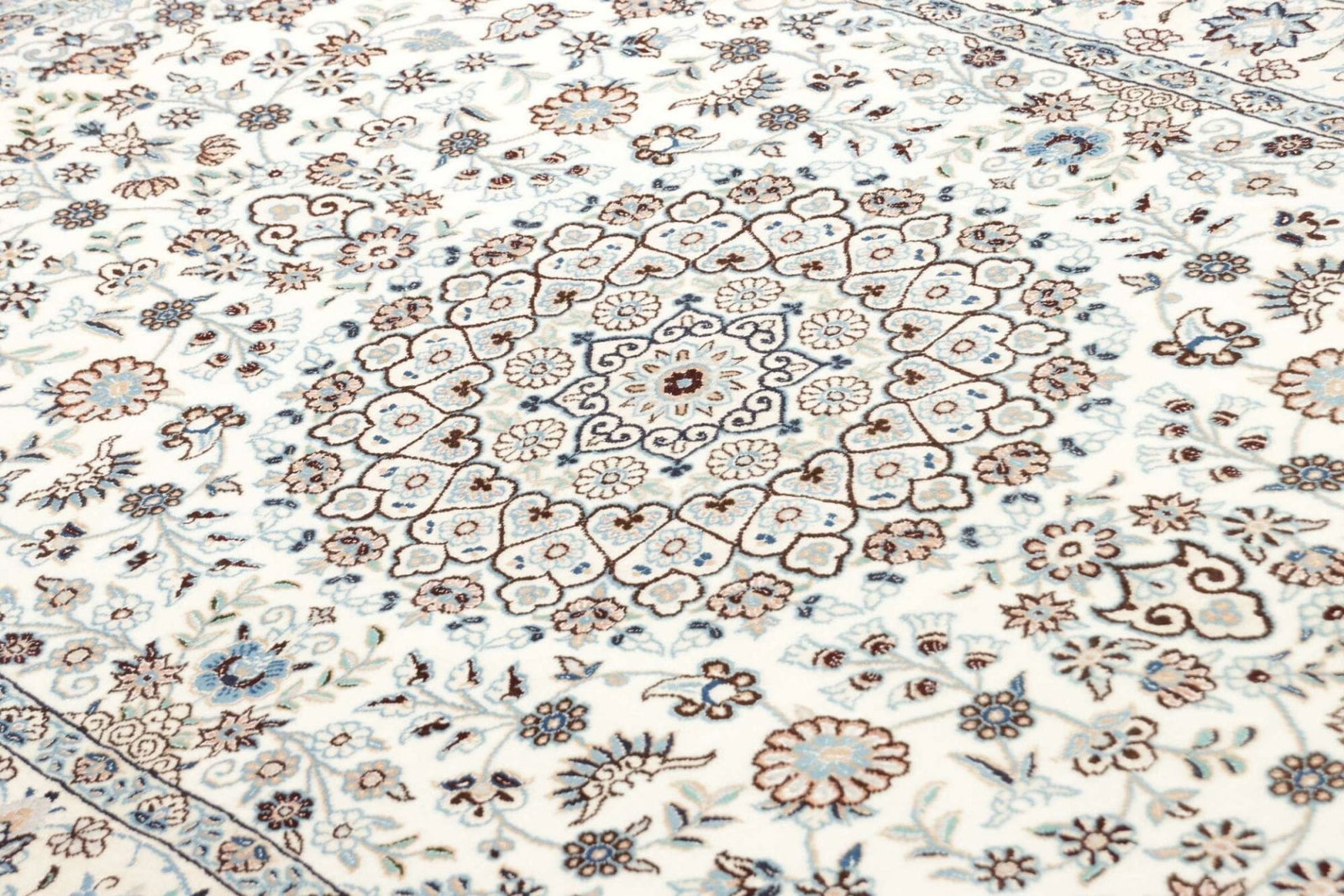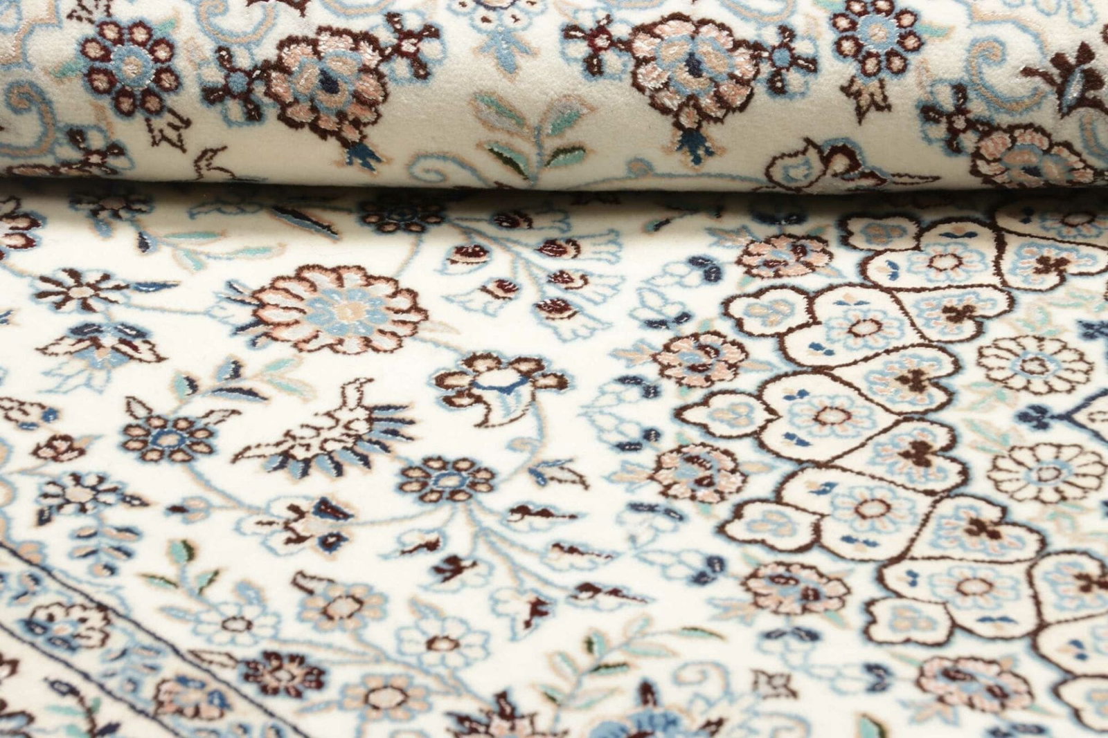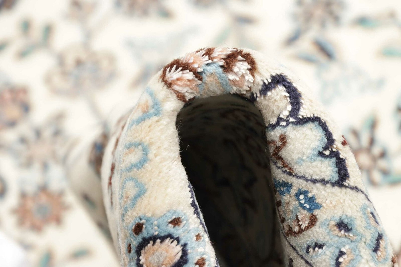 Das Material des Nain Teppichs besteht aus feinstem Schafswoll-Gemisch, das nicht nur für einen hohen Komfort unter den Füßen sorgt, sondern auch langlebig und pflegeleicht ist. Die Knotendichte dieses Teppichs ist beeindruckend, was auf eine jahrzehntelange Tradition der Teppichknüpfung in der Region Nain hinweist. Hohe Knotendichten stehen für Detailreichtum und Farbtiefe, und wir können garantieren, dass dieser Teppich Ihnen viele Jahre Freude bereiten wird.