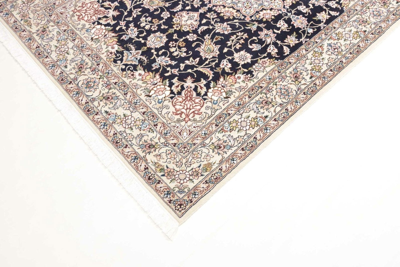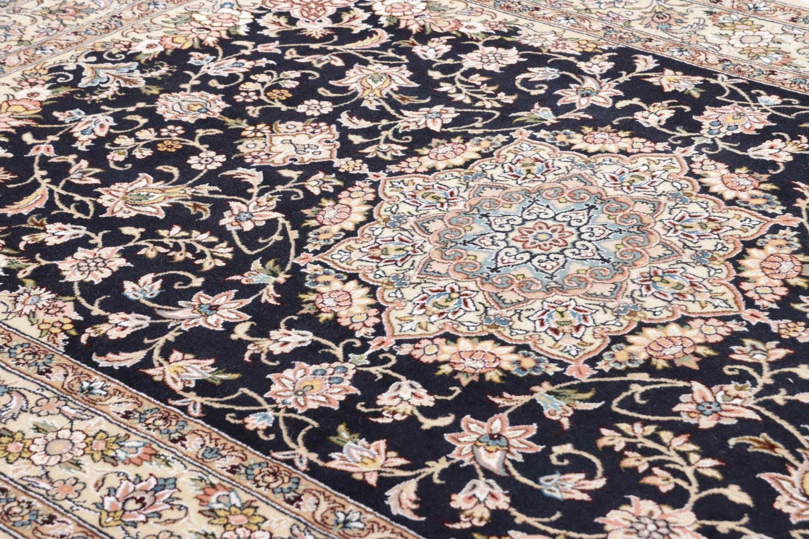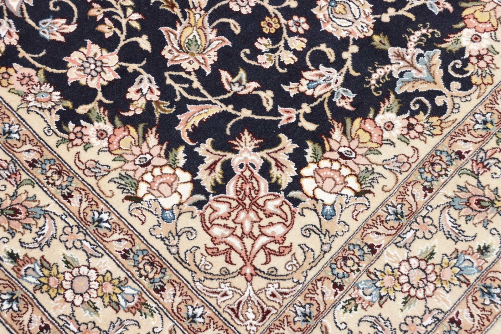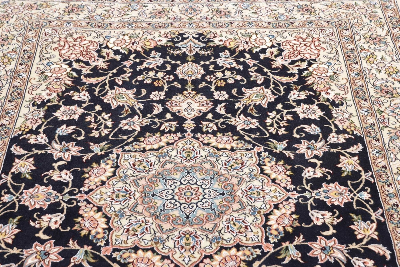 Nain, die Herkunftsstadt dieses exquisiten Teppichs, liegt im Zentrum Irans und gehört zu den bedeutendsten Teppichzentren des Landes. Die Stadt hat über Jahrhunderte eine traditionelle Teppichproduktion entwickelt, die sowohl lokale als auch internationale Marktströme beeinflusst hat. Die Teppiche aus Nain sind bekannt für ihre seltenen Motive und exzellenten Materialqualitäten. Florale Muster sind eine häufige Wahl in der Nain-Teppichtradition, historisch inspiriert durch die Natur und den Gartenbau, die tief in der persischen Kultur verwurzelt sind.