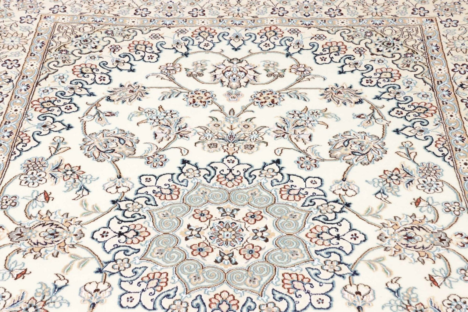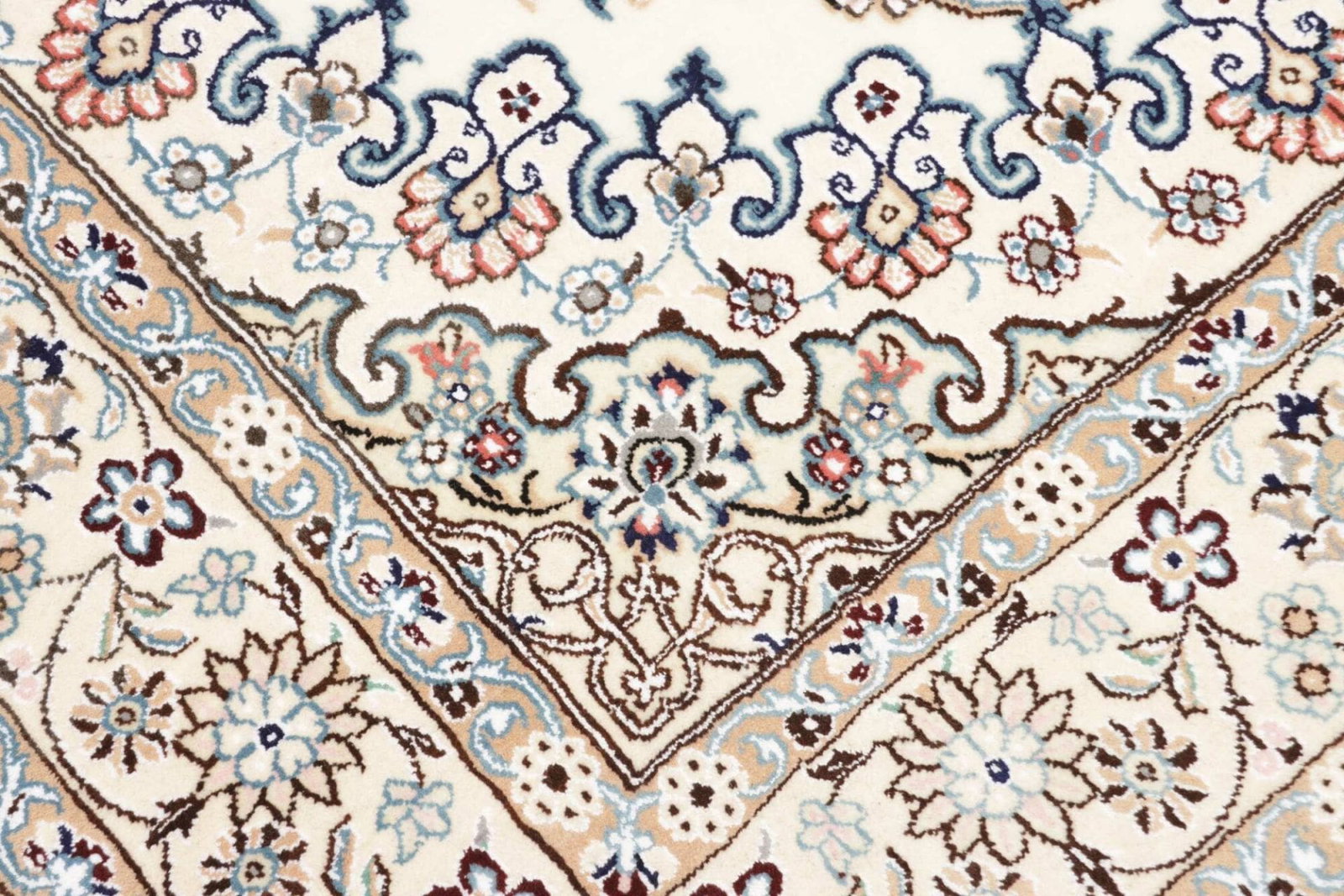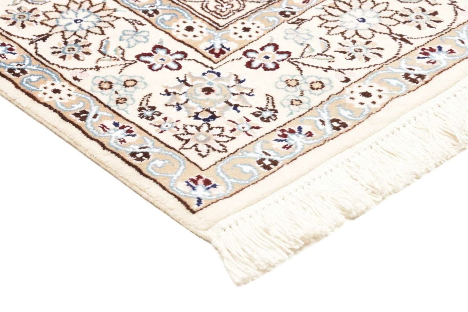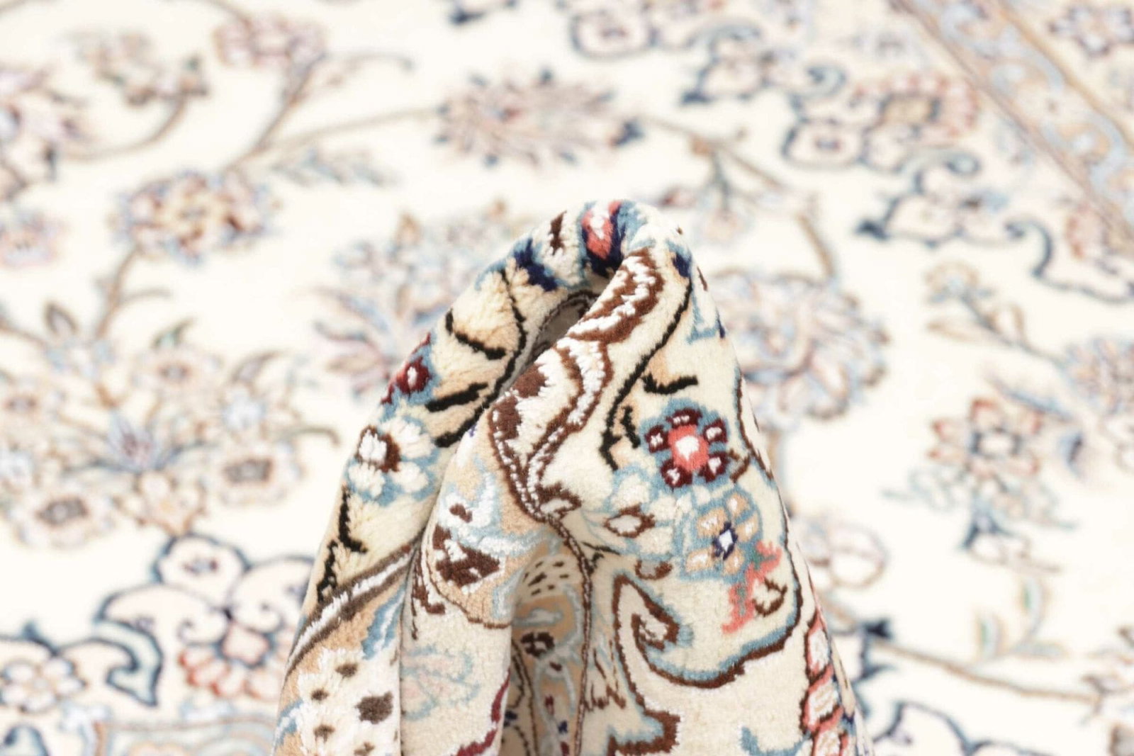 Ein hochwertiger Teppich erkennt man an seiner Knotendichte, den verwendeten Materialien und der Qualität der Verarbeitung. Handgeknüpfte Teppiche wie dieser Nain Teppich haben in der Regel eine hohe Knotendichte, die für Detailtreue und Langlebigkeit steht.